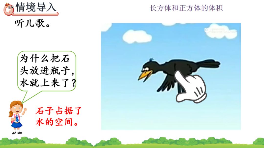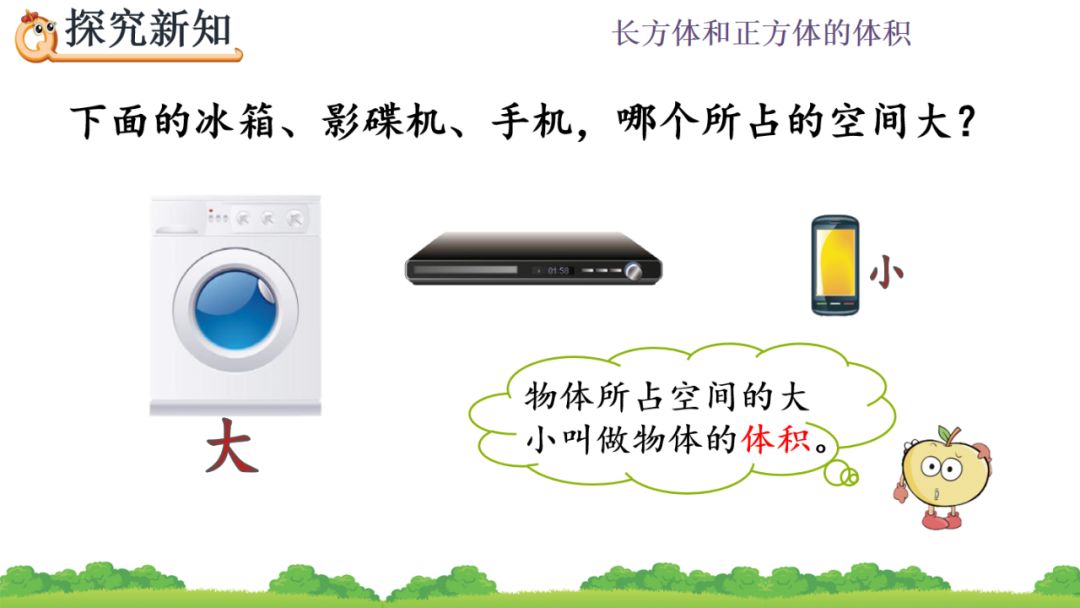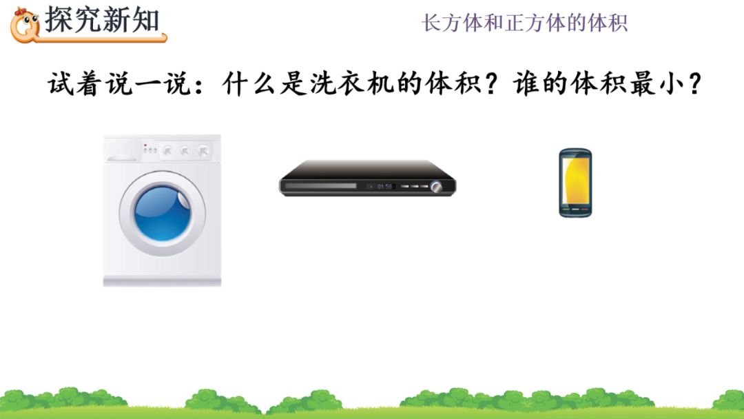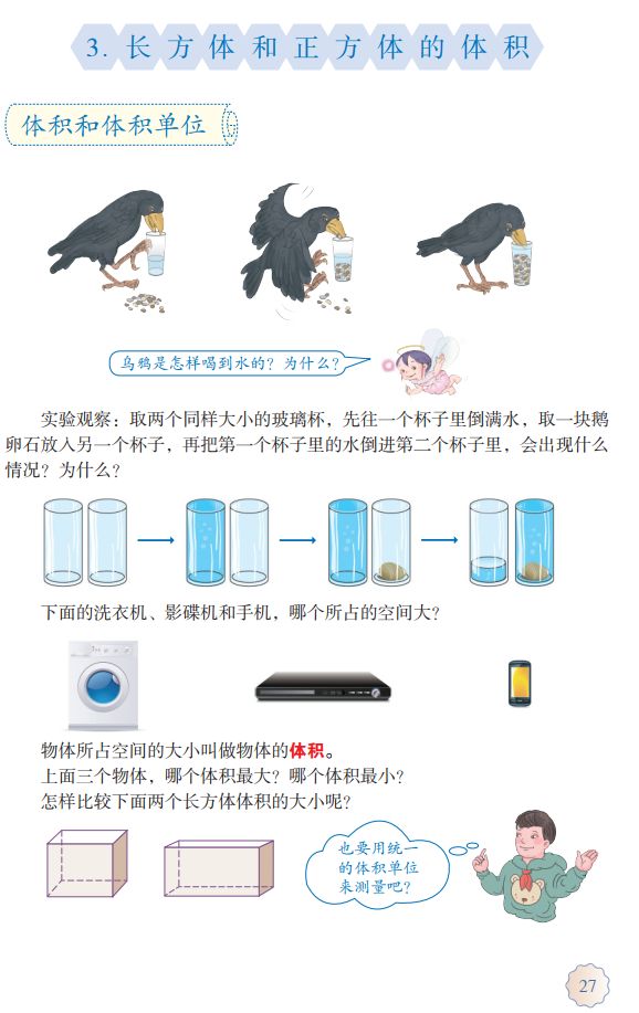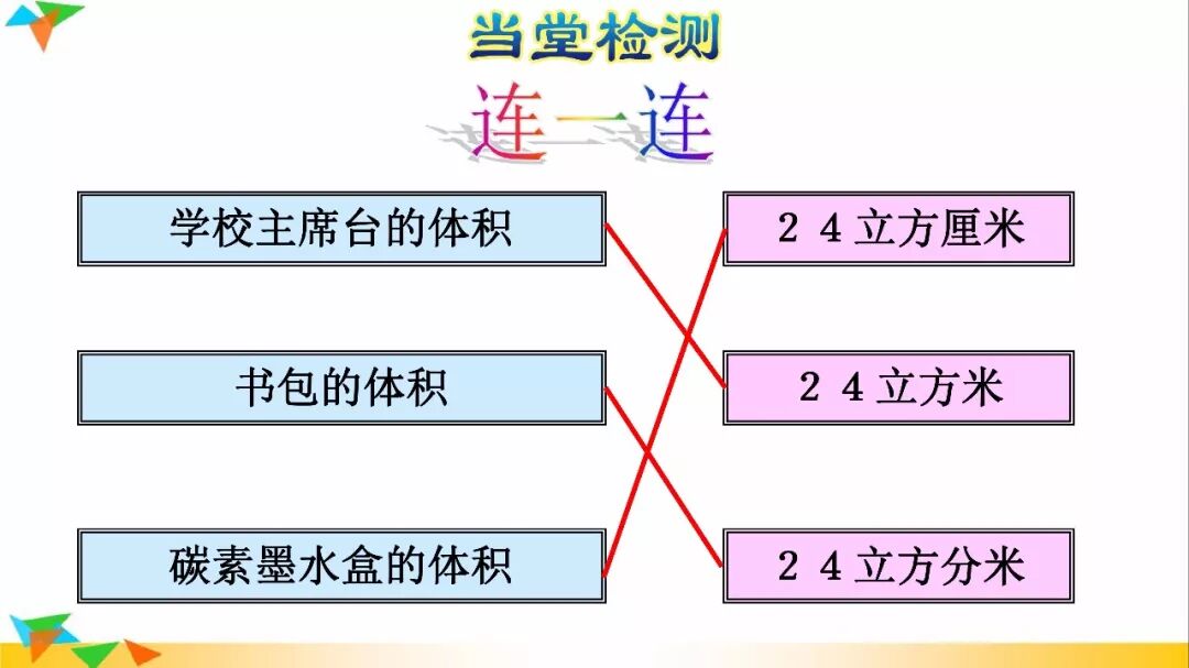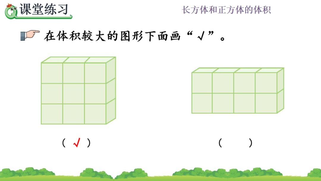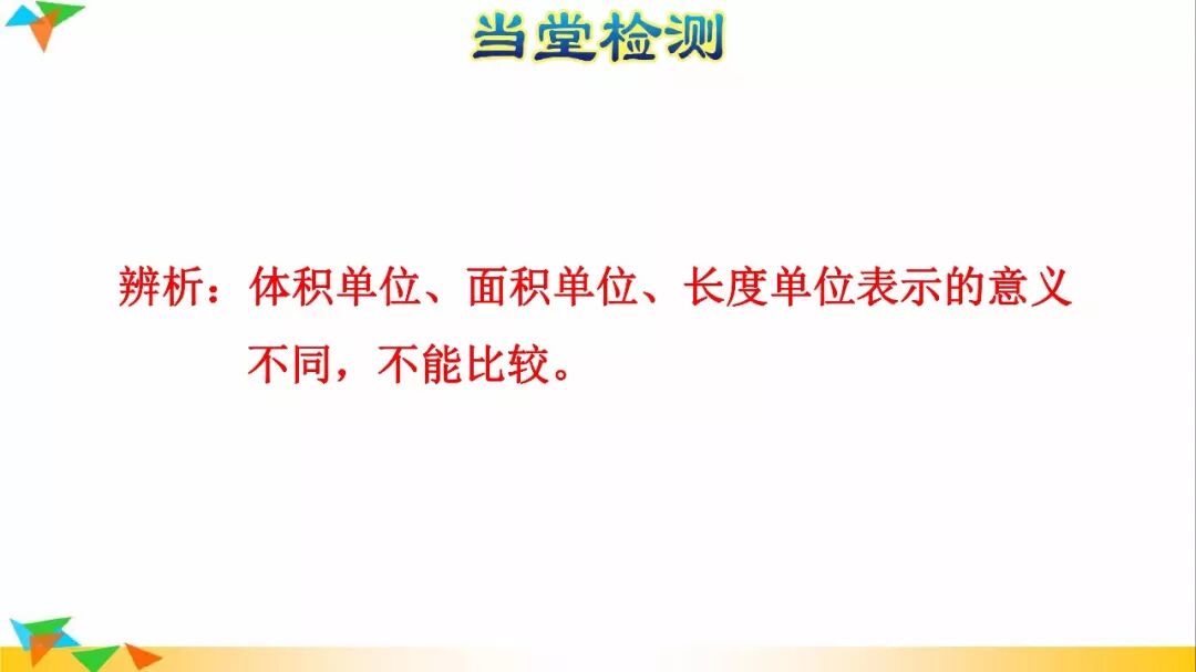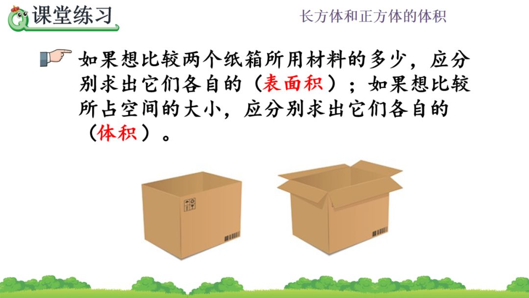 更多精彩,扫码关注微信号:jyse0-12下载:www.1ydt.cn精品推荐:小学语文 小学数学 小学英语小学道德 小学音乐 小学美术小学语文课件小学数学课件小学道德与法治课件 小学语数英预习单五年级数学下册 图文微课讲解目录五年级数学下册电子课本第一单元 观察物体(三)1.1《观察物体(三)》 图文视频讲解第一单元单元测试卷第二单元 因数与倍数2.1《因数和倍数(1)》图文视频讲解2.2《因数和倍数(2)》图文视频讲解2.3《2、5的倍数的特征》图文视频讲解2.4《3的倍数的特征》图文微课精讲2.5《2、3、5的倍数的特征(综合练习)》图文微课精讲2.6《质数和合数》图文视频讲解2.7《数的奇偶性》图文视频讲解第二单元单元测试卷第三单元 长方体和正方体、探索图形第9课《认识长方体》图文视频讲解第10课《认识正方体》图文视频讲解第11课《长文体、正方体的展开图》图文视频讲解第12课《长文体、正方体表面积的计算》图文视频讲解第13课《体积和体积单位》图文视频讲解第三单元单元测试卷第四单元 分数的意义和性质微课讲解微课讲解练习讲解点击图片,查看大图▼▼▼▼知识点体积的意义:物体所占空间的大小叫做物体的体积。体积和体积单位:1.计量体积要用体积单位,常用的体积单位有立方厘米、立方分米和立方米,可以分别写成cm³、dm³、m³。2.棱长是1cm的正方体,体积是1 cm³;棱长是1dm的正方体,体积是1 dm³ ;棱长是1m的正方体,体积是1m³。参考答案第28页做一做1、长度 面积 体积不同之处:①意义不同。②测量范围不同:长度是指物体的长短;面积是指物体所占平面的多少或表面大小;体积是指物体所占空间的大小。③计算方法不同。 2、9cm² 8cm² 6cm² 4cm²图文解读点击图片,查看大图▼▼▼▼课堂练习同步练习11.下面的图形都是用体积为1 cm3的小正方体拼成的,它们的体积各是多少?2.根据下图,填“>”“<”或“=”。甲体积(>)乙体积甲表面积(=)乙表面积3.在下面的括号里填上合适的单位。(1)一个文具盒的体积大约是0.4(dm³)。(2)集装箱的体积大约是25(m³)。(3)一台电视机的体积大约是100(dm³)。(4)一根跳绳长约2(m)。(5)一间教室的占地面积大约是50(m²),所占空间大约是175(m³)。4.下图是由15个棱长为1 cm的小正方体组成的,怎样移动能变成一个长方体(只移动两个小正方体)?新组成的长方体的体积是多少?把最下面的一层的左、右两边的一个小正方体分别移到最上一层的左、右两边。5×1×3=15(cm³)同步练习21. ( )叫做物体的体积。常用的体积单位有( )、( )和( )。2.棱长是1米的正方体,它的底面积是( ),体积是( )。棱长是1分米的正方体,它的底面积是( ),体积是( )。棱长是1厘米的正方体,它的底面积是( ),体积是( )。3.一个花圃的面积约是10( ); 一瓶药水重60( );一个仓库的体积是125( ); 一间教室的面积约是48( );一堆沙的体积是1.98( ); 一瓶墨水体积是约60( );微波炉的体积约是45( )。 答案提示:1. 物体所占空间的大小, 立方米、立方分米、立方厘米2.1平方米,1立方米 ,1平方分米,1立方分米,1平方厘米,1立方厘米3.平方米, 克,立方米,平方米,立方米,立方厘米,立方分米往期精彩推荐小学语文:一年级语文师生资源总汇二年级语文师生资源总汇三年级语文师生资源总汇四年级语文师生资源总汇五年级语文师生资源总汇六年级语文师生资源总汇小学语文1~6年级电子课本小学数学:小学数学1-6年级电子课本小学数学1年级-6年级资料汇编小学数学1年级-6年级全册教案汇编小学英语:PEP英语3-6年级全册视频精讲PEP三年级-六年级英语资料汇编PEP英语3-6年级电子课本外研3起英语3-6年级上下册 朗读+知识点精讲英语1-6年级电子课本(新起点、精通版、PEP)外研1起点英语1~6年级上下册 朗读+知识点精讲北师大英语3-6年级上下册 朗读+知识点精讲小学科学:小学科学1年级-6年级全册教案汇编1-6年级科学上册 期末测试卷汇编1-6年级科学上册期末复习知识点归纳 小学道德与法治:小学道德与法治1-6年级全册教案及资料小学道德与法治1年级-6年级电子课本图文来自网络,版权归原作者,如有不妥,告知即删下载全册PPT课件动画教案习题朗读试卷整套资料点击阅读原文