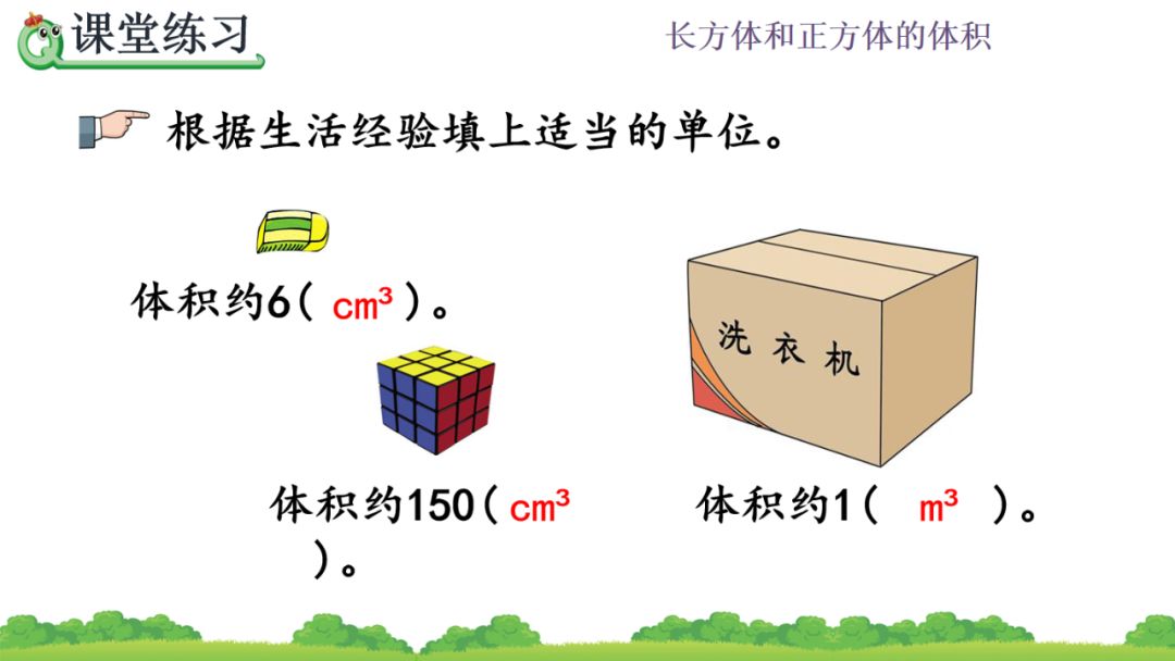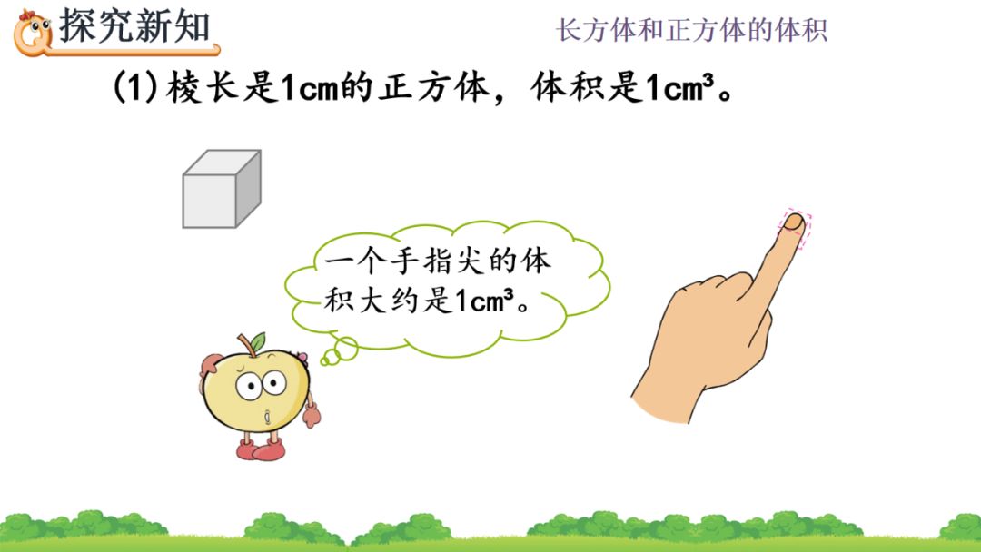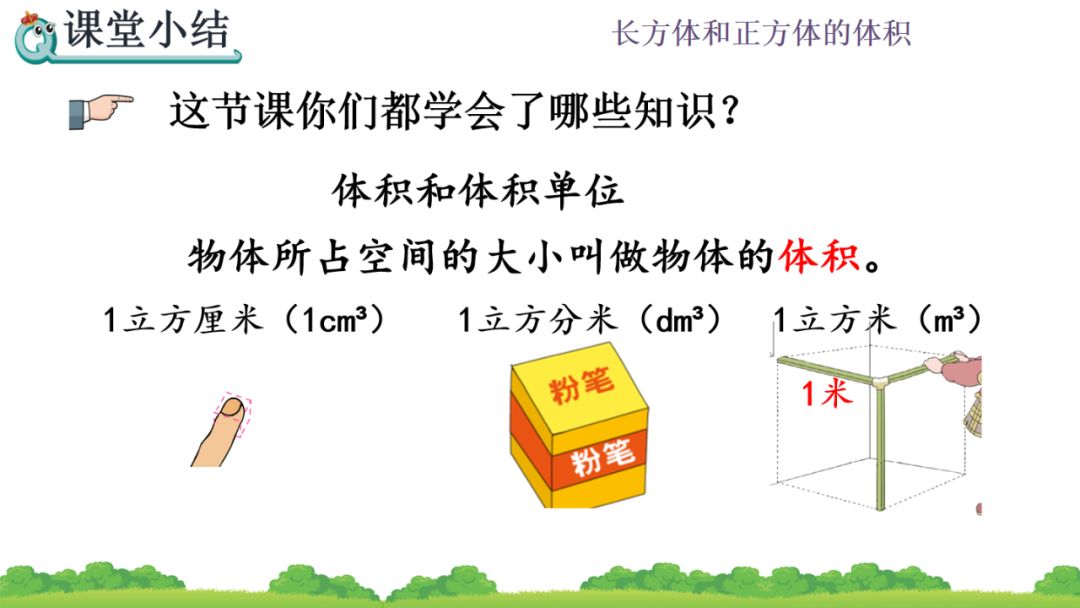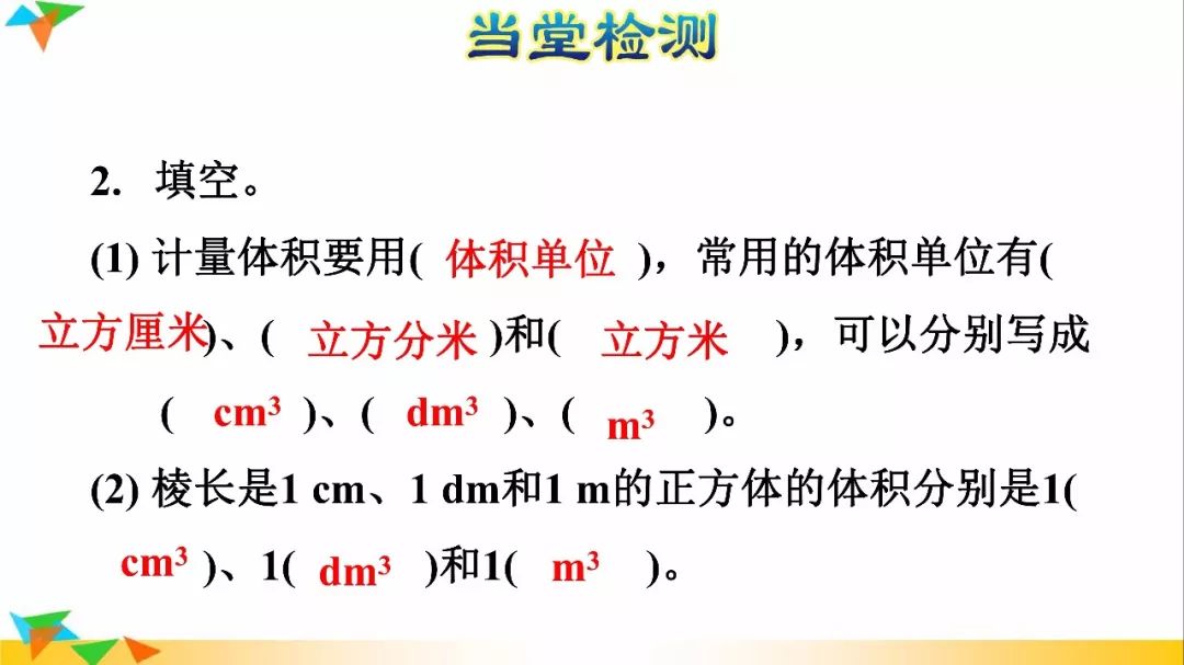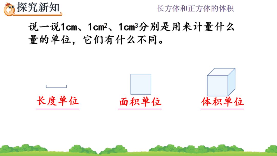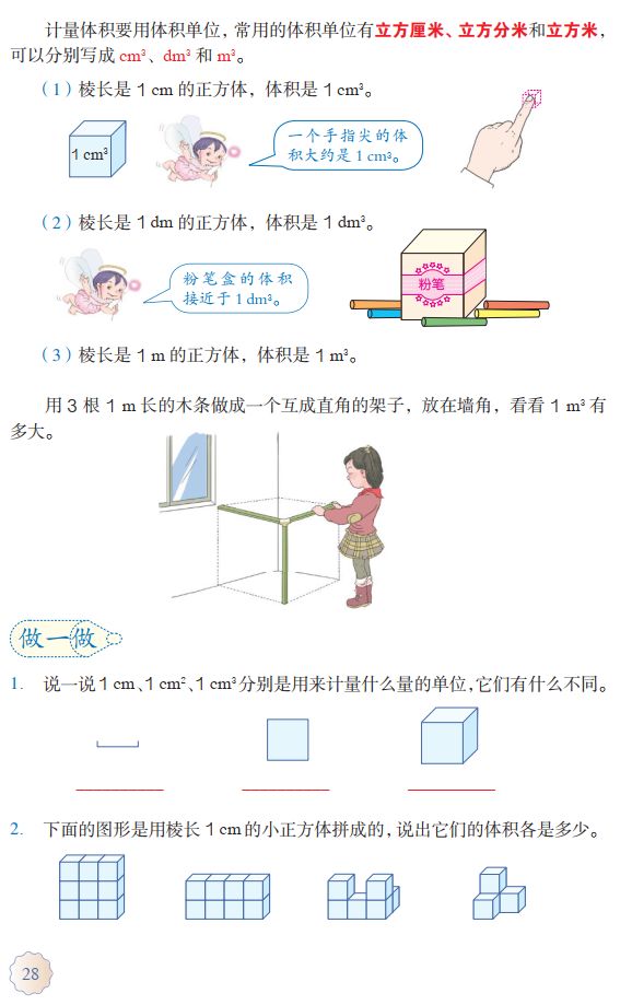 2.棱长是1cm的正方体,体积是1 cm³;棱长是1dm的正方体,体积是1 dm³ ;棱长是1m的正方体,体积是1m³。