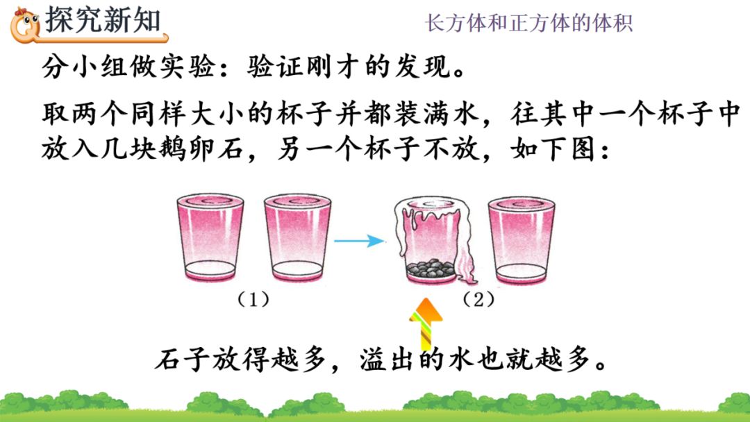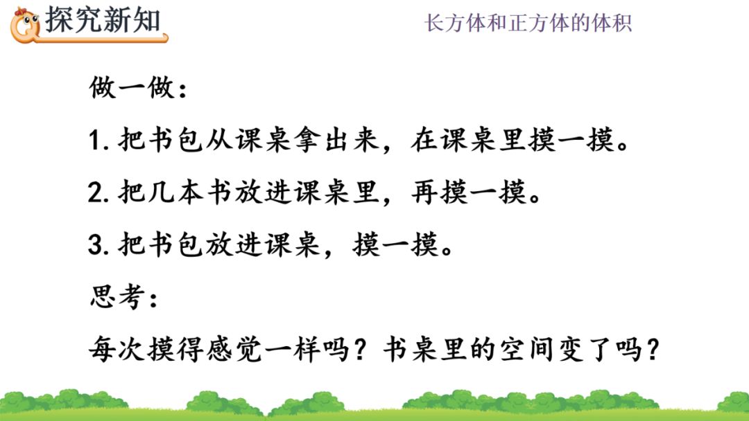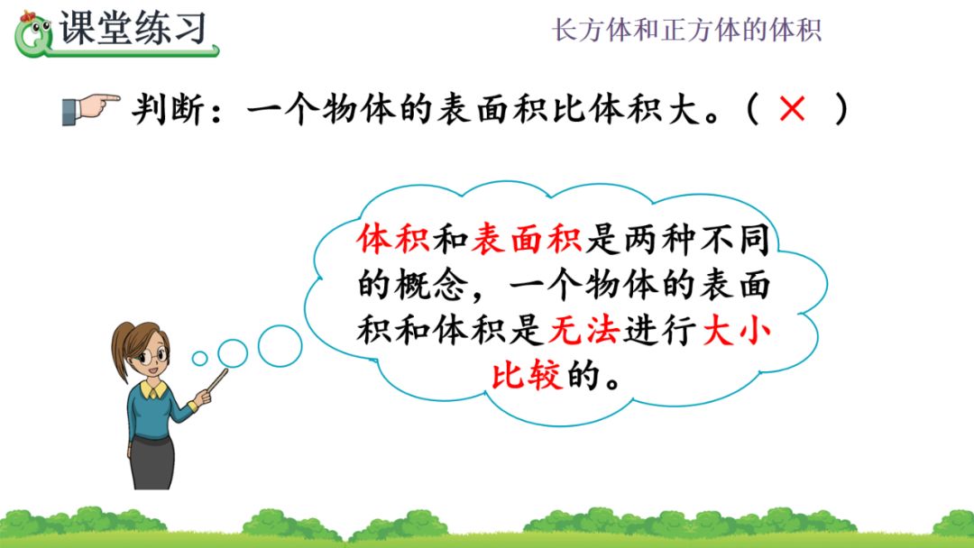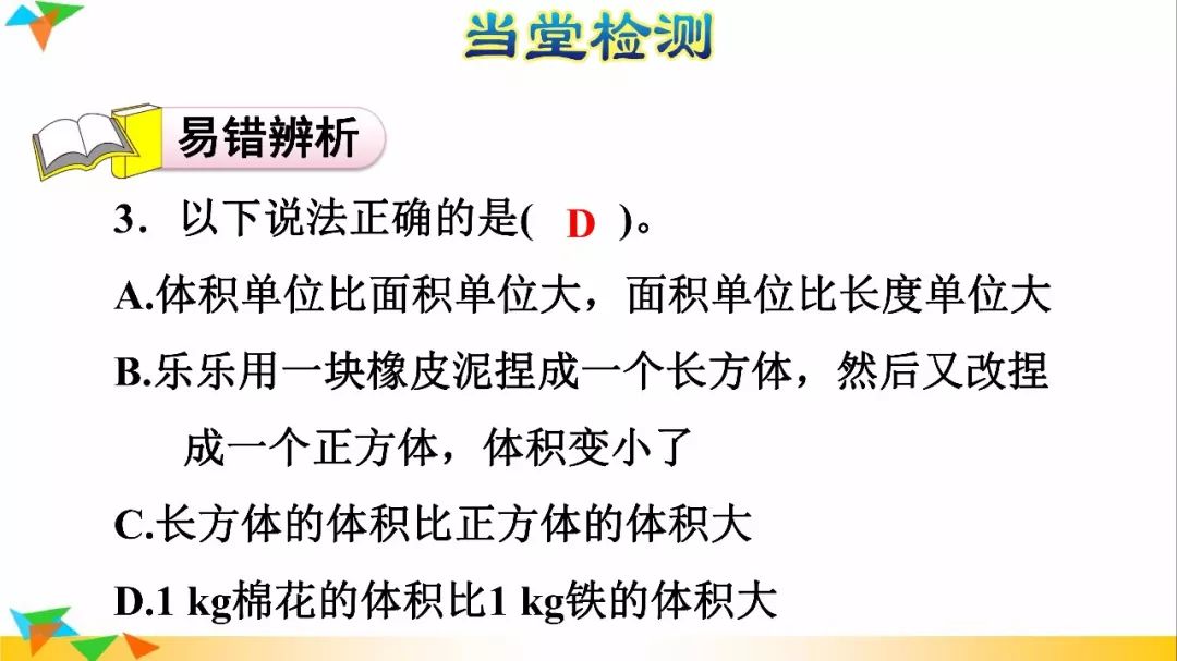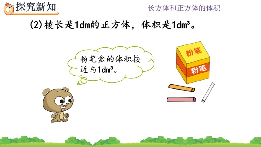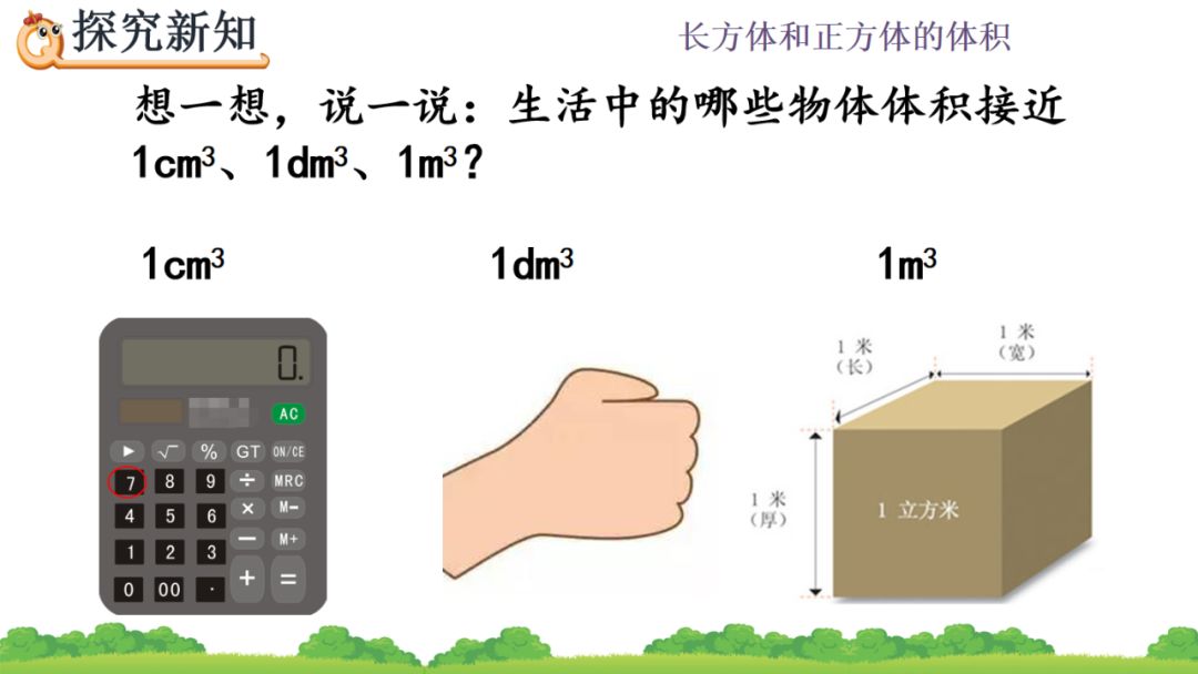 2.棱长是1cm的正方体,体积是1 cm³;棱长是1dm的正方体,体积是1 dm³ ;棱长是1m的正方体,体积是1m³。