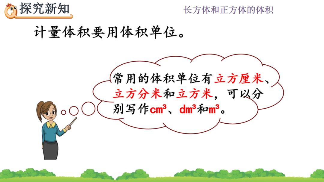 1.计量体积要用体积单位,常用的体积单位有立方厘米、立方分米和立方米,可以分别写成cm³、dm³、m³。