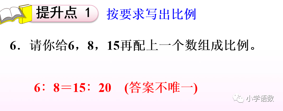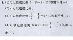 更多精彩,扫码关注微信号:jyse0-12资源下载:点“阅读原文“精品推荐:小学语文 小学数学 小学英语小学道德 小学音乐 小学美术小学语文课件小学数学课件小学道德与法治课件 小学语数英预习单六年级数学下册 图文微课讲解目录六年级数学下册电子课本第一单元 负数1.1《数据收集整理(1)》 图文视频讲解1.2《数据收集整理(2)》图文视频讲解第一单元单元测试卷第二单元 百分数(二)2.1《平均分(1)》图文视频讲解2.2《平均分(2)》图文微课精讲2.3《 除法(1)》图文微课精讲2.4《利率》微课图文讲解2.5《解决问题》图文视频讲解第二单元单元测试卷第三单元 圆柱与圆锥3.1《圆柱的认识》图文视频讲解第9课《圆柱的体积》图文视频讲解10课《圆锥的认识》图文视频讲解第11课《圆锥的体积》图文视频讲解第12课《整理和复习》图文视频讲解第三单元单元测试卷第四单元 比例、自行车里的数学第13课《比例的意义》图文视频讲解微课讲解新课讲解1练习讲解点击图片,查看大图▼▼▼▼知识点1.比例的意义:表示两个比相等的式子叫做比例。2.判断两个比能否组成比例的方法:根据比例的意义,看两个比的比值是否相等,相等就能组成比例。参考答案第40页做一做答案图文解读点击图片,查看大图▼▼▼▼同步练习1答案:1. 2.4∶1.8=2∶1.5 第一幅图和第二幅图是相同的。2. (√)( )(√)3. 解答:一共可以组成8个比例,分别是6∶3=8∶4 3∶6=4∶8 6∶8=3∶4 8∶6=4∶38∶4=6∶3 4∶8=3∶6 3∶4=6∶8 4∶3=8∶6同步练习2往期精彩推荐小学语文:一年级语文师生资源总汇二年级语文师生资源总汇三年级语文师生资源总汇四年级语文师生资源总汇五年级语文师生资源总汇六年级语文师生资源总汇小学语文1~6年级电子课本小学数学:小学数学1-6年级电子课本小学数学1年级-6年级资料汇编小学数学1年级-6年级全册教案汇编小学英语:PEP英语3-6年级全册视频精讲PEP三年级-六年级英语资料汇编PEP英语3-6年级电子课本外研3起英语3-6年级上下册 朗读+知识点精讲英语1-6年级电子课本(新起点、精通版、PEP)外研1起点英语1~6年级上下册 朗读+知识点精讲北师大英语3-6年级上下册 朗读+知识点精讲小学科学:小学科学1年级-6年级全册教案汇编1-6年级科学上册 期末测试卷汇编1-6年级科学上册期末复习知识点归纳 小学道德与法治:小学道德与法治1-6年级全册教案及资料小学道德与法治1年级-6年级电子课本图文来自网络,版权归原作者,如有不妥,告知即删下载全册PPT课件动画教案习题朗读试卷整套资料点击阅读原文