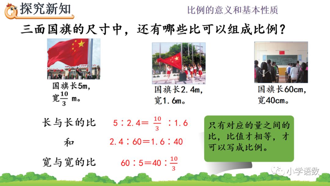 2.判断两个比能否组成比例的方法:根据比例的意义,看两个比的比值是否相等,相等就能组成比例。