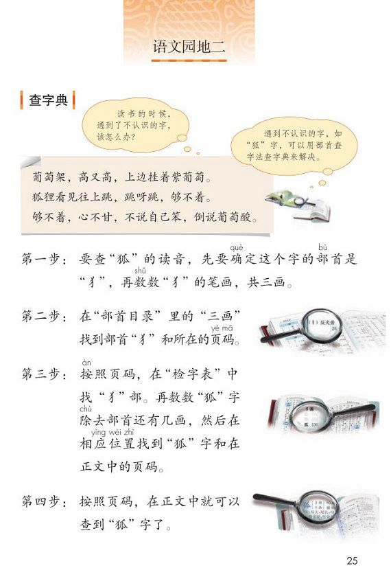 遇到不认识的字,如“狐”字,可以用部首查字法查字典来解决。