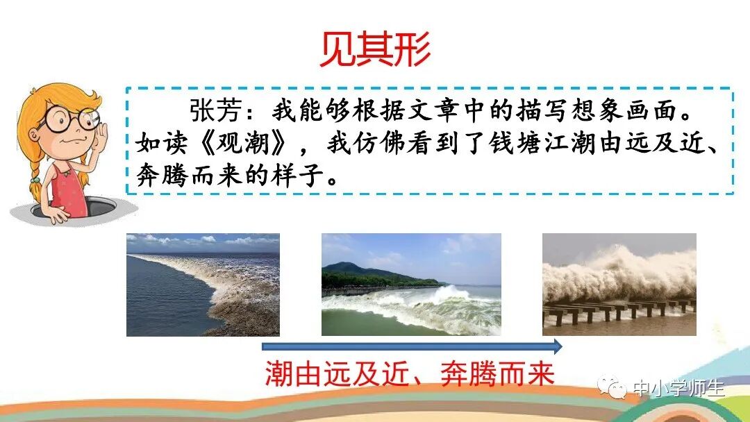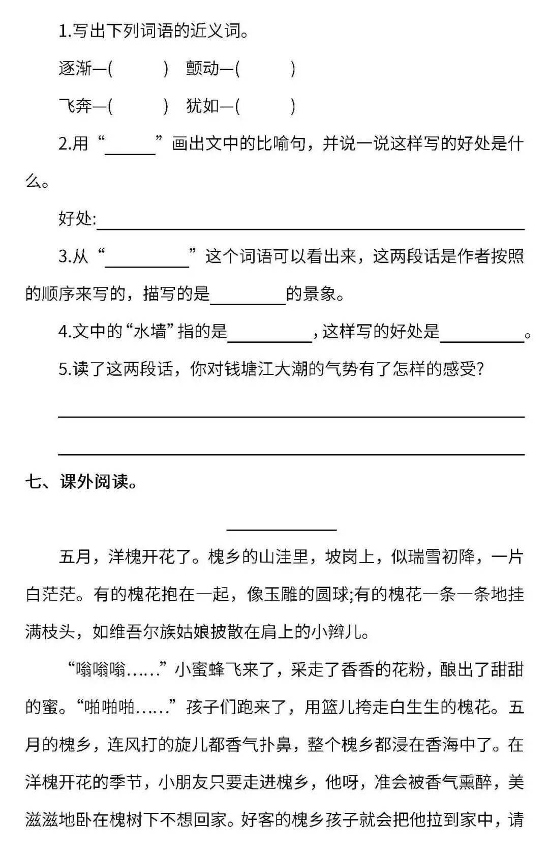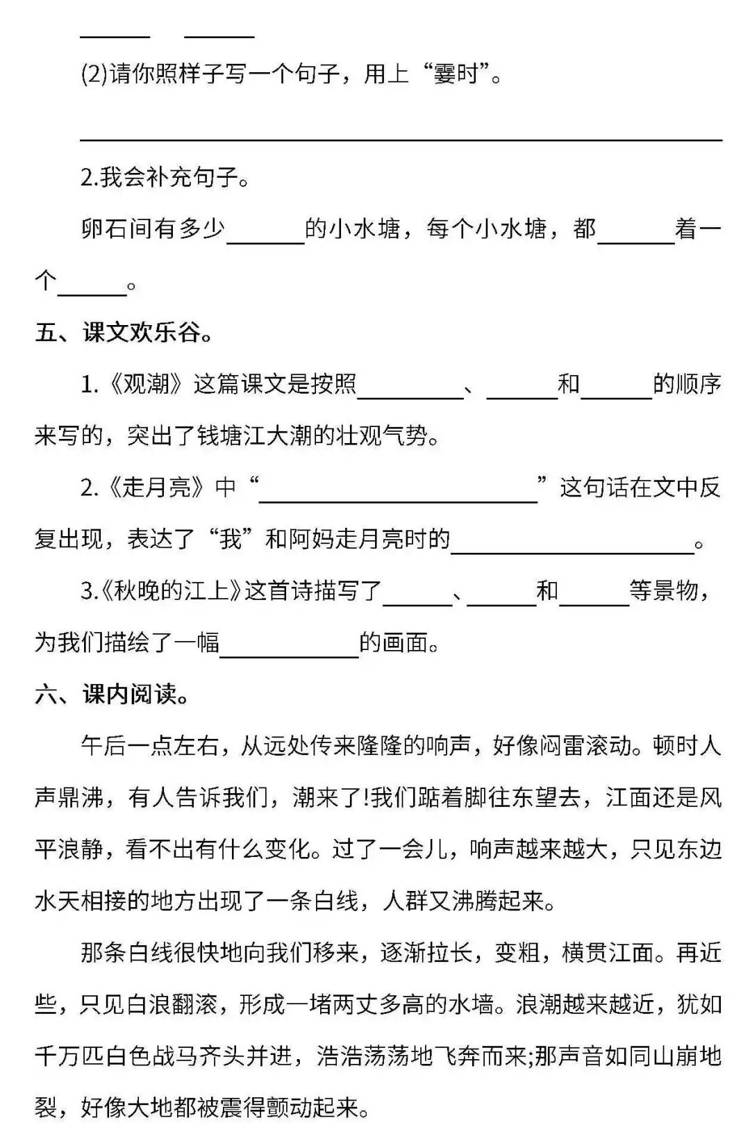 1.《观潮》第 3、4 自然段常以填空形式考查课文原文,也常作为课内阅读出现。第 4 自然段考查写作顺序,以及从哪两个方面描写了大潮来时的壮观场面。课文的写作顺序也会有所考查,作文也会要求用这一顺序写作。