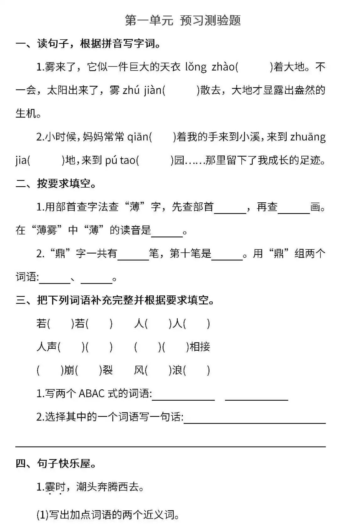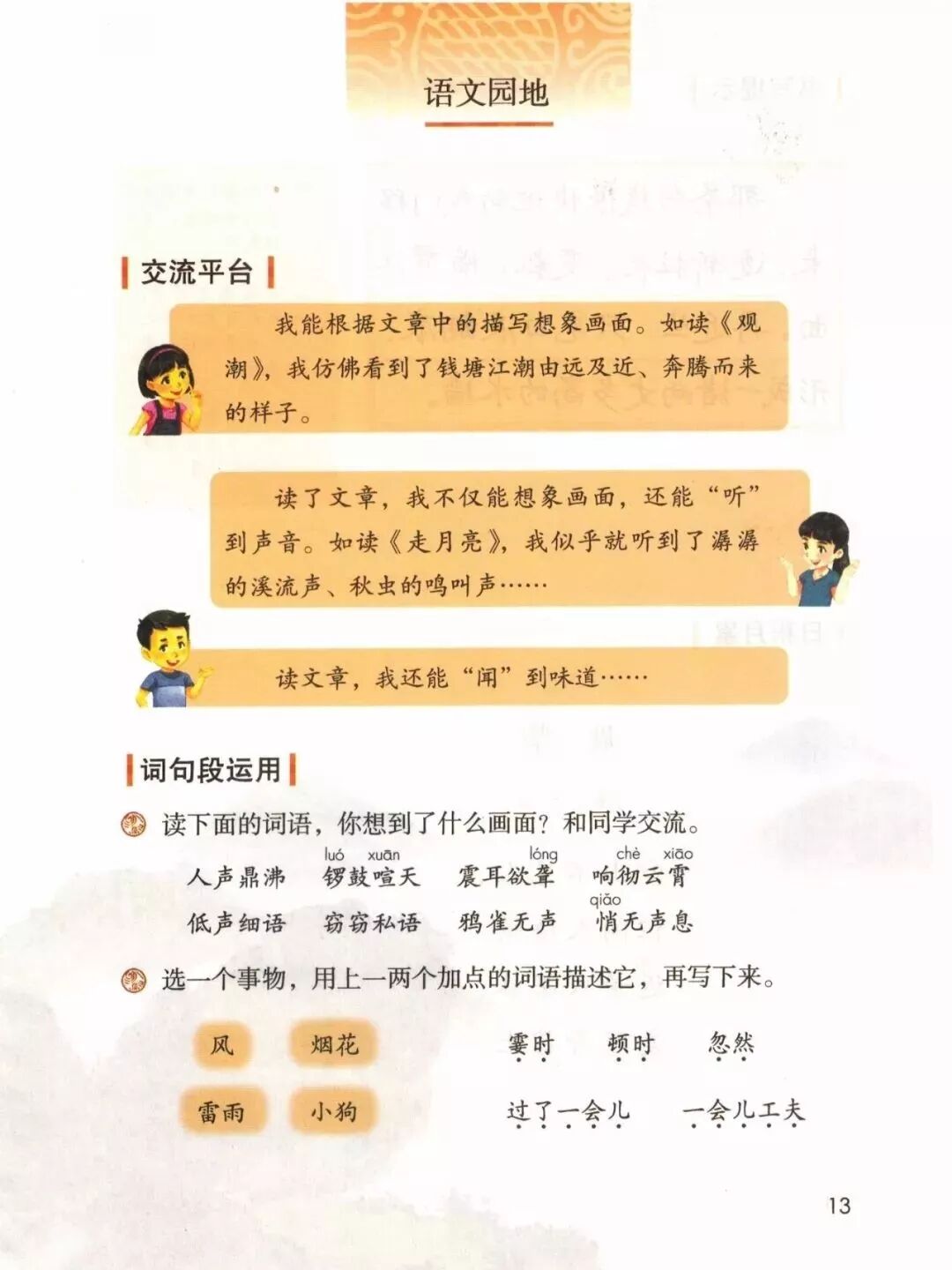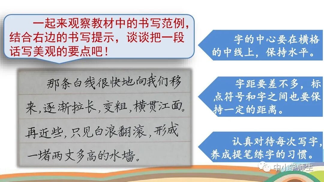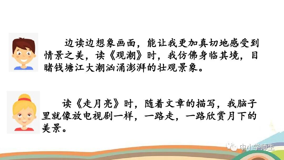 1.《观潮》第 3、4 自然段常以填空形式考查课文原文,也常作为课内阅读出现。第 4 自然段考查写作顺序,以及从哪两个方面描写了大潮来时的壮观场面。课文的写作顺序也会有所考查,作文也会要求用这一顺序写作。