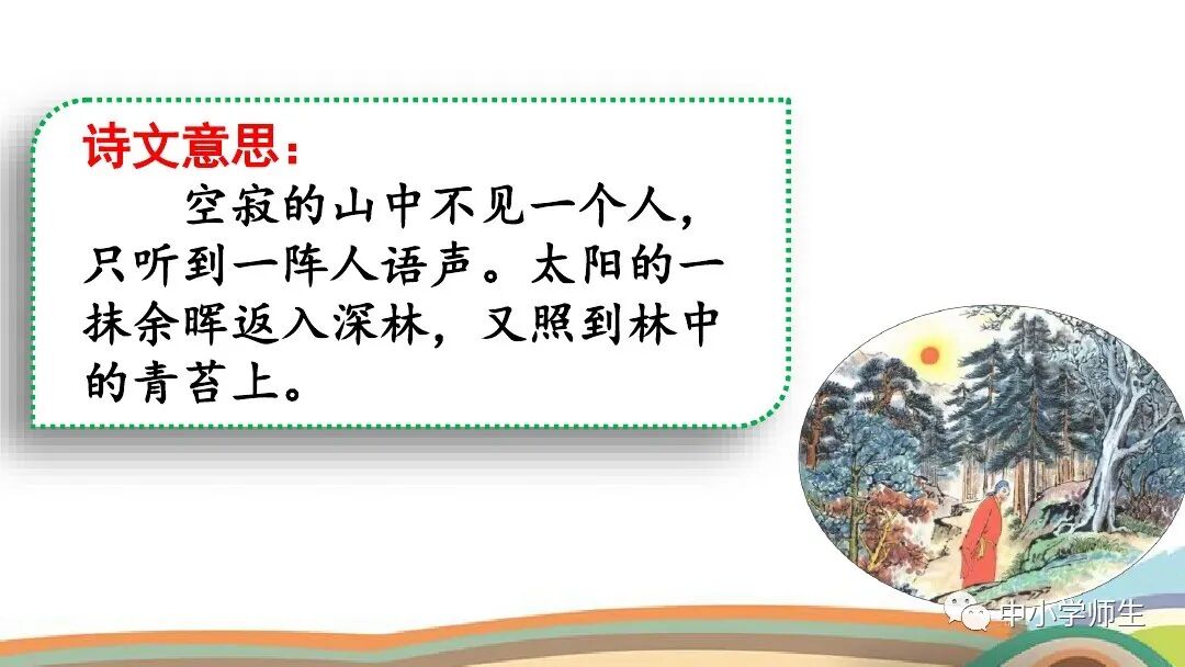 幽静的山谷里看不见人,只能听到那说话的声音。落日的影晕映入了深林,又照在青苔上景色宜人。