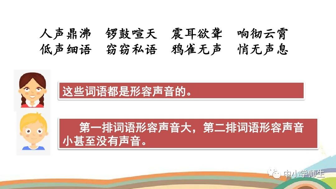 第一行是描写声音响亮的词语,第二行是描写声音细小或没有声音的词语。