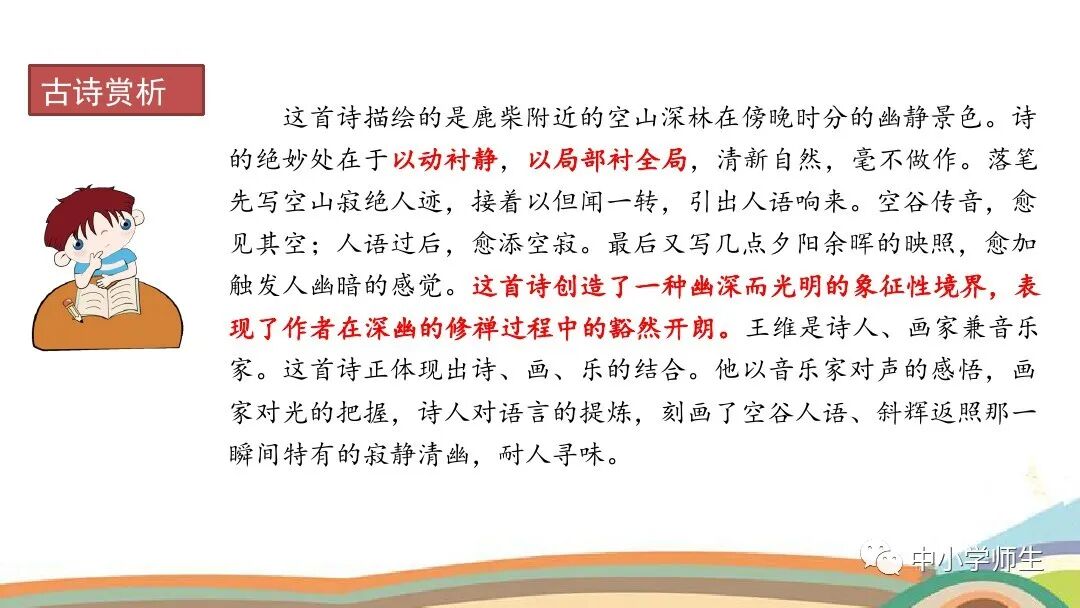 《鹿柴》是唐代诗人王维的作品。这首诗写一座人迹罕至的空山,一片古木参天的树林,意在创造一个空寂幽深的境界。第一句先正面描写空山的杳无人迹,侧重于表现山的空寂清冷。之后紧接第二句境界顿出,以局部的、暂时的“响”反衬出全局的、长久的空寂。第三、第四句由上幅的描写空山传语进而描写深林返照,由声而色。