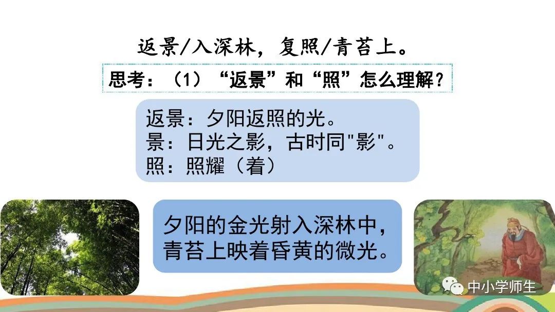 ④返景(yǐng):夕阳返照的光。“景”古时同“影”。