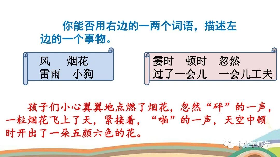 示例:外面电闪雷鸣,狂风卷积着乌云压了下来,一会儿工夫,大雨下起来了,霎时天昏地暗。小狗听到响声,顿时站起来,警惕地望着门口,过了一会儿,它才安静下来。
