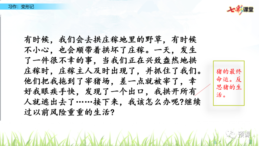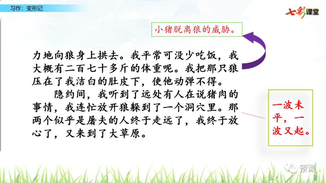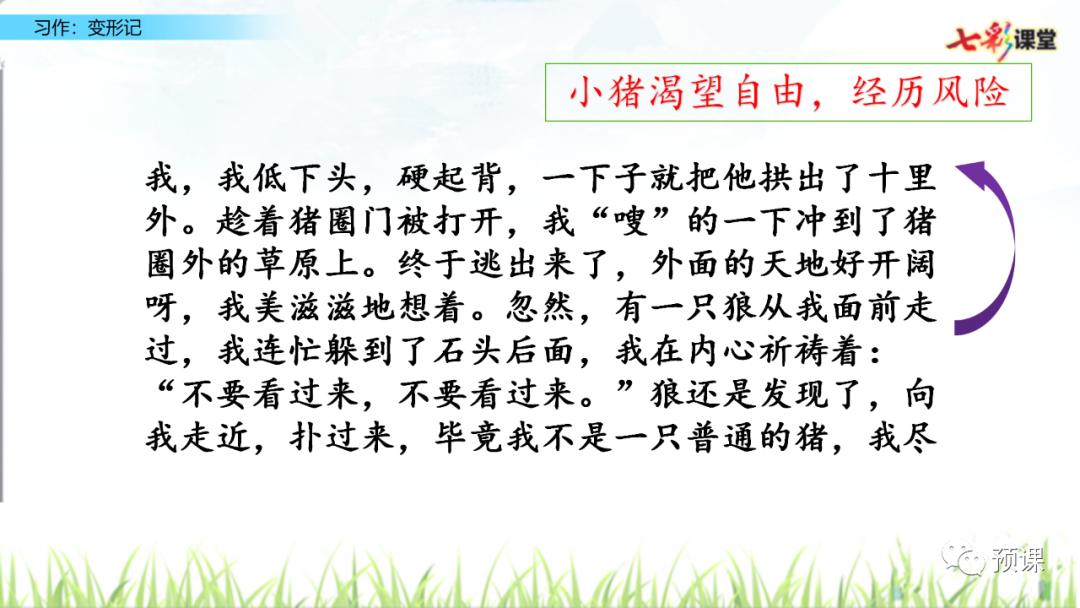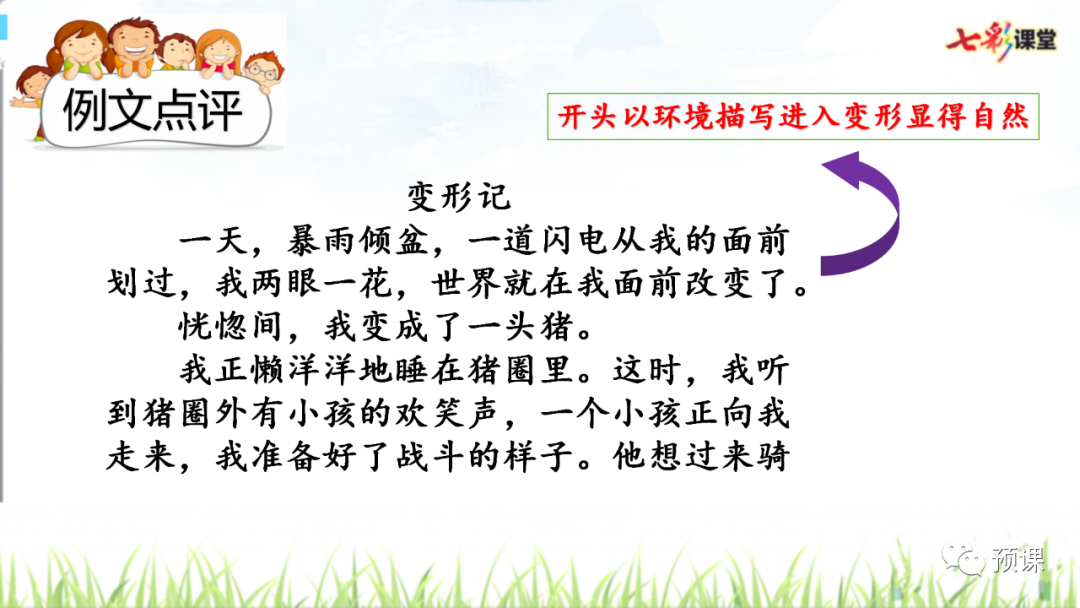 电子课本点击图片,查看大图▼▼▼▼微课讲解写作指导1.审题指导:“变形记”要求我们发挥想象,把自己变成另一种东西,将变形后的经历写下来。写完后,和同学交换习作,看看他们对你的“世界”是否感兴趣,再根据他们的意见修改自己的习作。要想让其他同学感兴趣,我们运用联想和想象,丰富表达的内容。本次习作的重点是运用联想和想象,写出变形世界的奇趣。2.思路导航:要想让其他同学感兴趣,写出奇趣来,就要用情感搭建想象的空间,想象是被情感激起,又受情感支配的。情浓,想象的空间就越能令人心驰神往。根据已经知道的情景,借助想象推测出未知的情景,冲破事物的表象,写出其与“我”的心情相通的情味。(1)变形的事物必须是自己熟知的,要根据已有的特点展开联想和想象哦!注意要运用联想的手段:相似联想、相关联想、相反联想。(2)把自己的生活经验以及自己的情感体验寄托于变形的事物中,让变形的事物成为自己所看、所听、所闻、所感的生活体验的宣泄口,用情感搭建想象的空间,用感悟充实想象的空间。3.技法点拨:(1)运用联想的手段:根据已有的经验和认知,利用事物间的相通、相近、相似或相反的关联,抓住事物的相似性进行联想,由一件事物联想到与之相关的任何事物或者它的反面,丰富、突出事物的形象性或本质特点,并进行推测想象,大胆虚构,超越时空,突破现实生活的限制,这样才能展现奇特的想象。(2)展开合理的想象:根据确定的主题展开合理的想象,使故事更加的生动、具体。合理的想象是在现实基础上看开的想象,不是凭空的异想天开。要在变形的写作中,将自己融进去,感同身受,赋予变形对象以自己的情感,才能写出有血有肉的变形对象。用感悟充实想象的空间,要将自己的变形与生命感悟融为一体,无“感”则无“悟”,无“悟”则想象毫无价值,想象的价值,在于化“感”为“悟”,化情为理。范文+点评01地球的自述我是人类的载体,我的名字叫地球。50万年前,我的身体是那样健壮,可是现在,我所哺育的人类发达了,他们就开始对我进行破坏了,使我的身体一天比一天衰弱。哎,人类真是太忘恩负义了!现在,我身上的淡水,几乎都变混浊了。人类不断地把污水排放到河流中去,造成了我身上内陆水域的污染,使病毒不断地蔓延,只有30%的人类才能喝到安全卫生的水,洁净的水成了人类生死攸关的大问题。解决水质污染,使我更加年轻。人类啊!听听我的劝告吧!前几天,我老远见到了太阳。我对他说:“太阳公公,请不要再让您那强烈的紫外线照射到我的身上吧,那些人类受不了啊!”太阳说:“你不是有一把大伞——臭氧层可以抵挡住我的紫外线吗?”这时,我难过地说:“哎!别提了。由于人类不注意保护大气环境,工厂的废气排放到空气中,再加上近两个月北约对南斯拉夫的狂轰滥炸,使大气中粉尘进人人体,给人类以严重的威胁,而且使大气中的臭氧层进一步被破坏。现在,在南极上空已经出现了“空洞”。“哎,这可怎么办呀?”太阳愤怒地说:“这都是人类一手惹下的祸,他们这是自作自受?应该让他们汲取教训。”说完,便生气地离开了。这时,我痛苦地说:“人类啊,不要把这些当儿戏了,如果不加以治理,后果将不堪设想啊!”同时,我发现我的皮肤正逐渐由以前的绿色转变为黄色。这是什么原因呢?为了解开这个谜,我去太阳系超级医院作了检查。听大夫一说,我才明白了。原来,这是由于人类对森林资源不断地破坏,对草原过度放牧引起的后果。我身上的黄河流域已造成了严重的水土流失,成为最严重的环境问题。目前,我身上的黄色皮肤正在不断蔓延,绿色皮肤不断减少。沙漠逐渐吞并了我的全身。听了大夫作出的诊断结果,我简直快要哭了。我哀求医生说:“医生,快治好我的病吧。”医生却说:“人类是你的主宰,要想治好你的病,靠的是他们呀!”我呼吁人类:保护环境吧!保护森林吧!让你们的生命摇篮重新恢复往日的风采吧!总评:“地球”面临着什么灾难?如何保护地球?这是当前人类亟待解决的问题。本文小作者通过丰富的想像,运用变形的手法生动地讲述了地球所面临的灾难的原因,使人们充分地认识到保护地球的重要性。作者还运用了对话的方法,把枯燥无味的道理生动形象化了,使人仿佛感觉到了一个童话世界。同时能用一些通俗易懂的道理,激起人们对保护地球重要性的认识和重视。 02变形记一天,暴雨倾盆,一道闪电从我的面前划过,我两眼一花,世界就在我面前改变了。 恍惚间,我变成了一头猪。我正懒洋洋地睡在猪圈里。这时,我听到猪圈外有小孩的欢笑声,一个小孩正向我走来,我准备好了战斗的样子。他想过来骑我,我低下头,硬起背,一下子就把他拱出了十里外。趁着猪圈门被打开,我“嗖”的一下冲到了猪圈外的草原上。终于逃出来了,外面的天地好开阔呀,我美滋滋地想着。忽然,有一只狼从我面前走过,我连忙躲到了石头后面,我在内心祈祷着:“不要看过来,不要看过来。”狼还是发现了,向我走近,扑过来,毕竟我不是一只普通的猪,我尽力地向狼身上拱去。我平常可没少吃饭,我大概有二百七十多斤的体重呢。我把那只狼压在了我洁白的肚皮下,使他动弹不得。隐约间,我听到了远处有人在说猪肉的事情,我连忙放开狼躲到了一个洞穴里。那两个似乎是屠夫的人终于走远了,我终于放心了,又来到了大草原。没过多