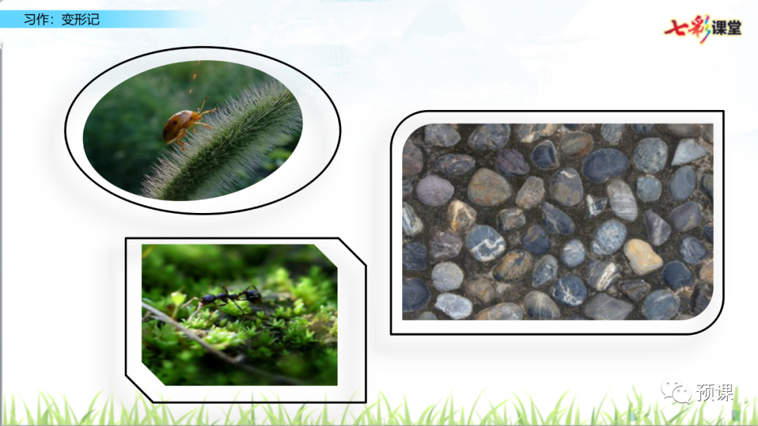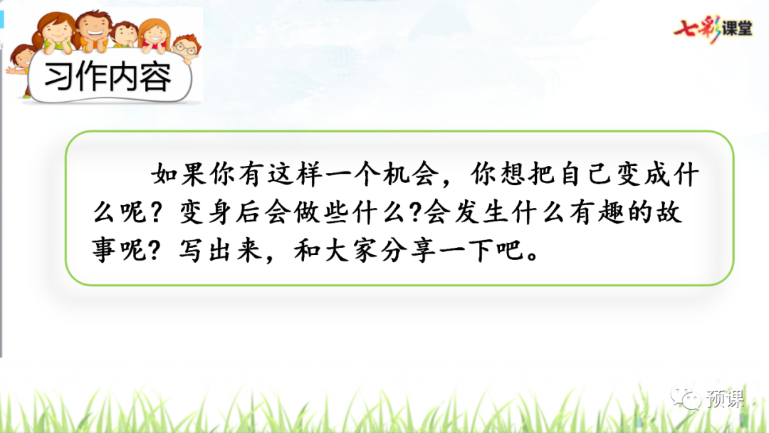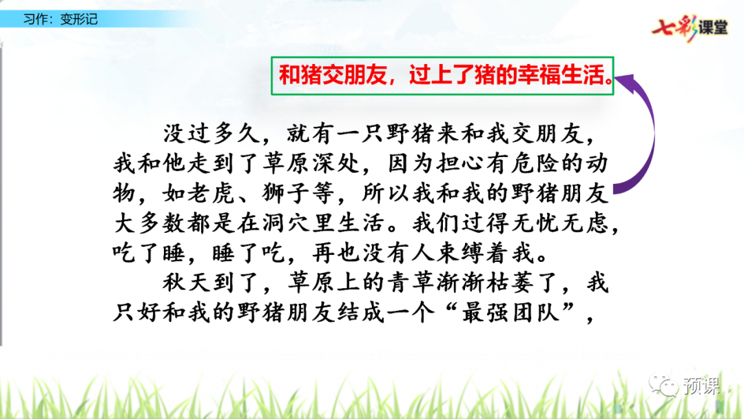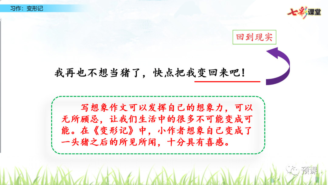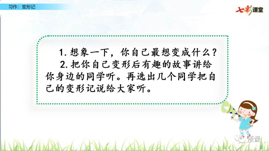 “变形记”要求我们发挥想象,把自己变成另一种东西,将变形后的经历写下来。写完后,和同学交换习作,看看他们对你的“世界”是否感兴趣,再根据他们的意见修改自己的习作。要想让其他同学感兴趣,我们运用联想和想象,丰富表达的内容。