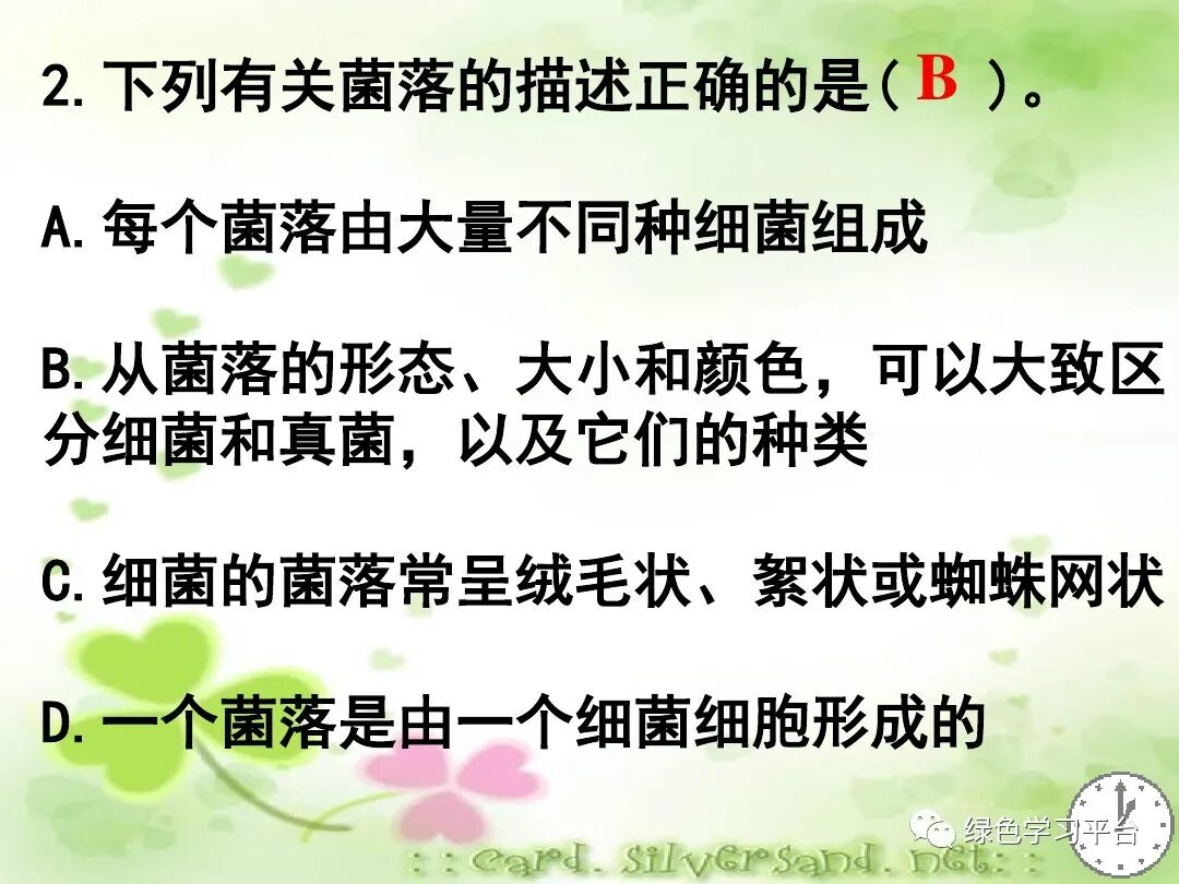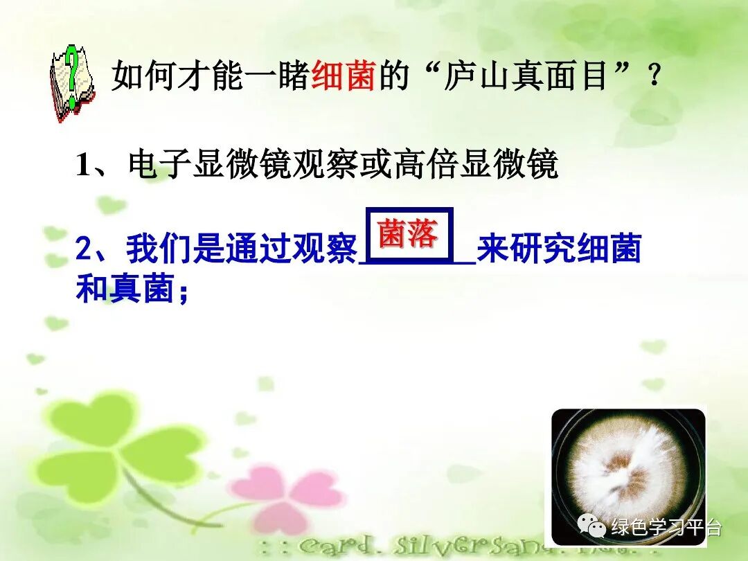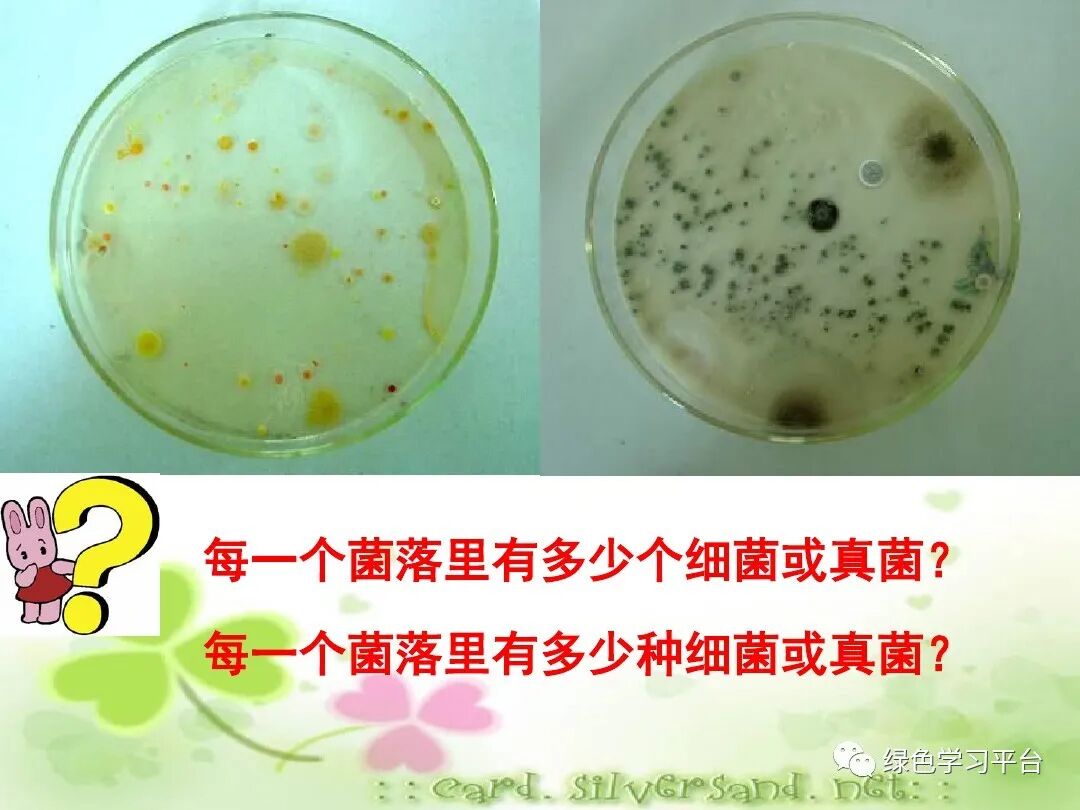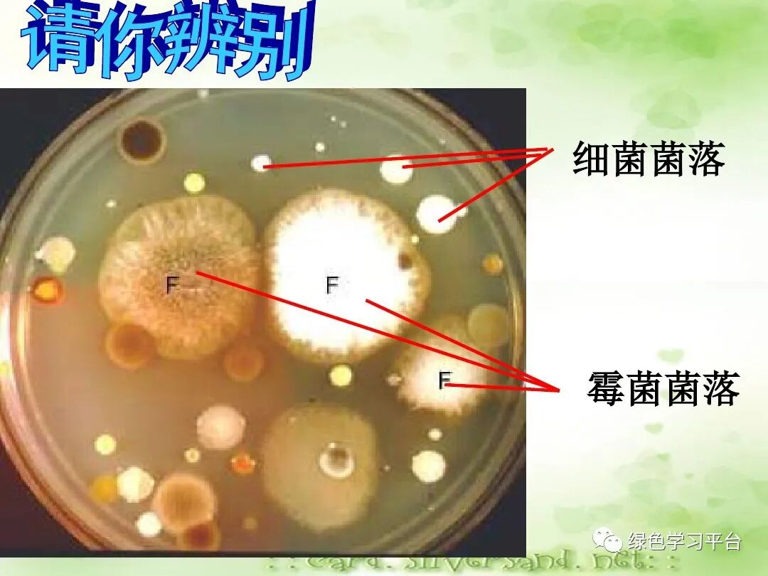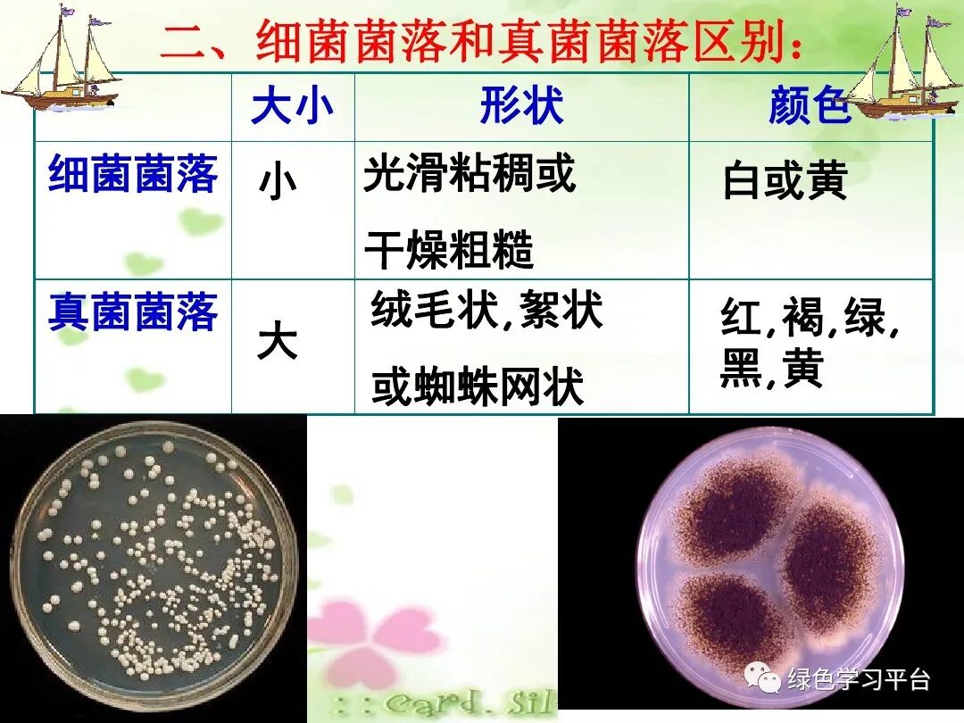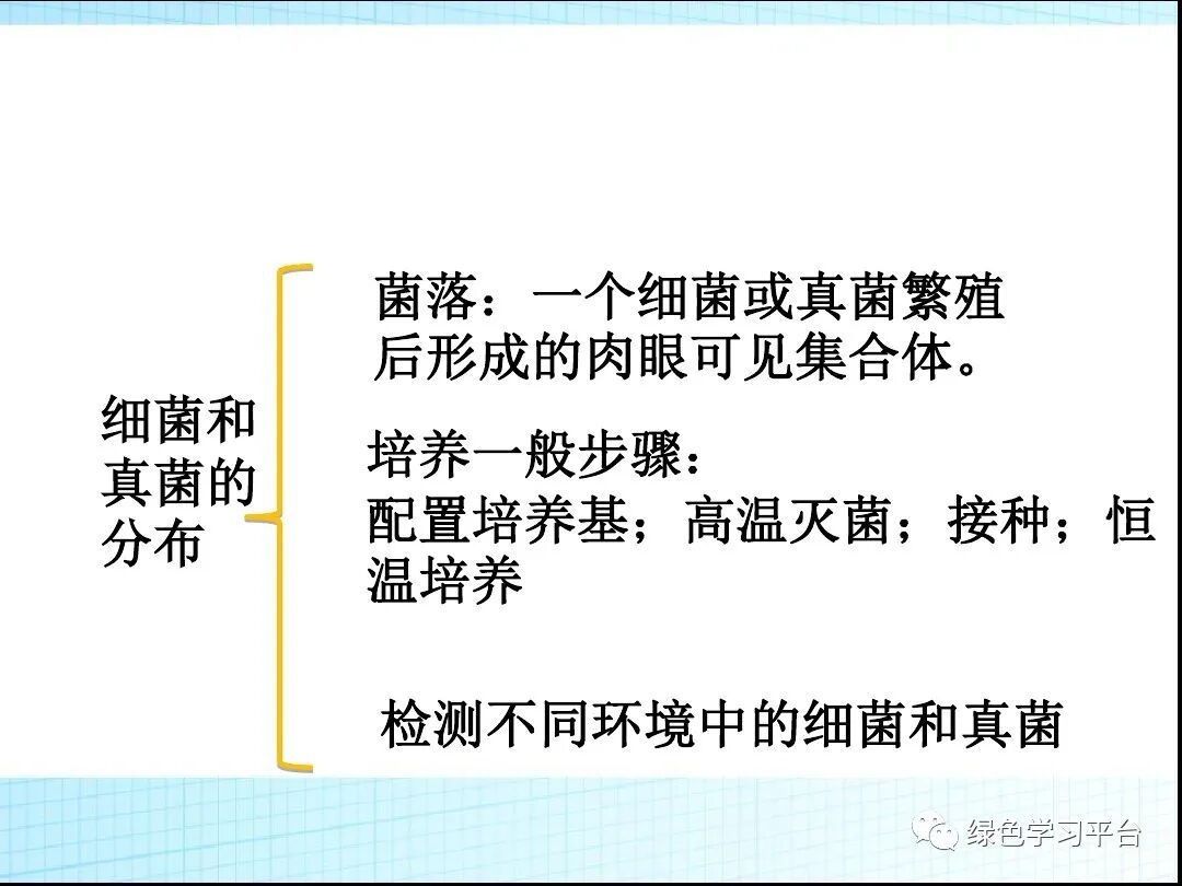 1.菌落:由一个细菌或真菌繁殖后形成的肉眼可见的集合体(注意:菌落中的所有细菌或者真菌为同种细菌或真菌)。