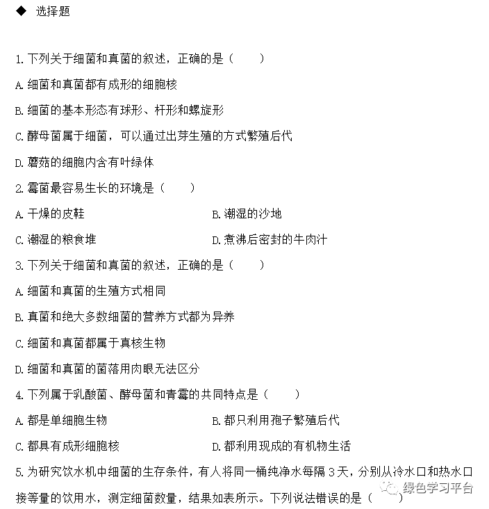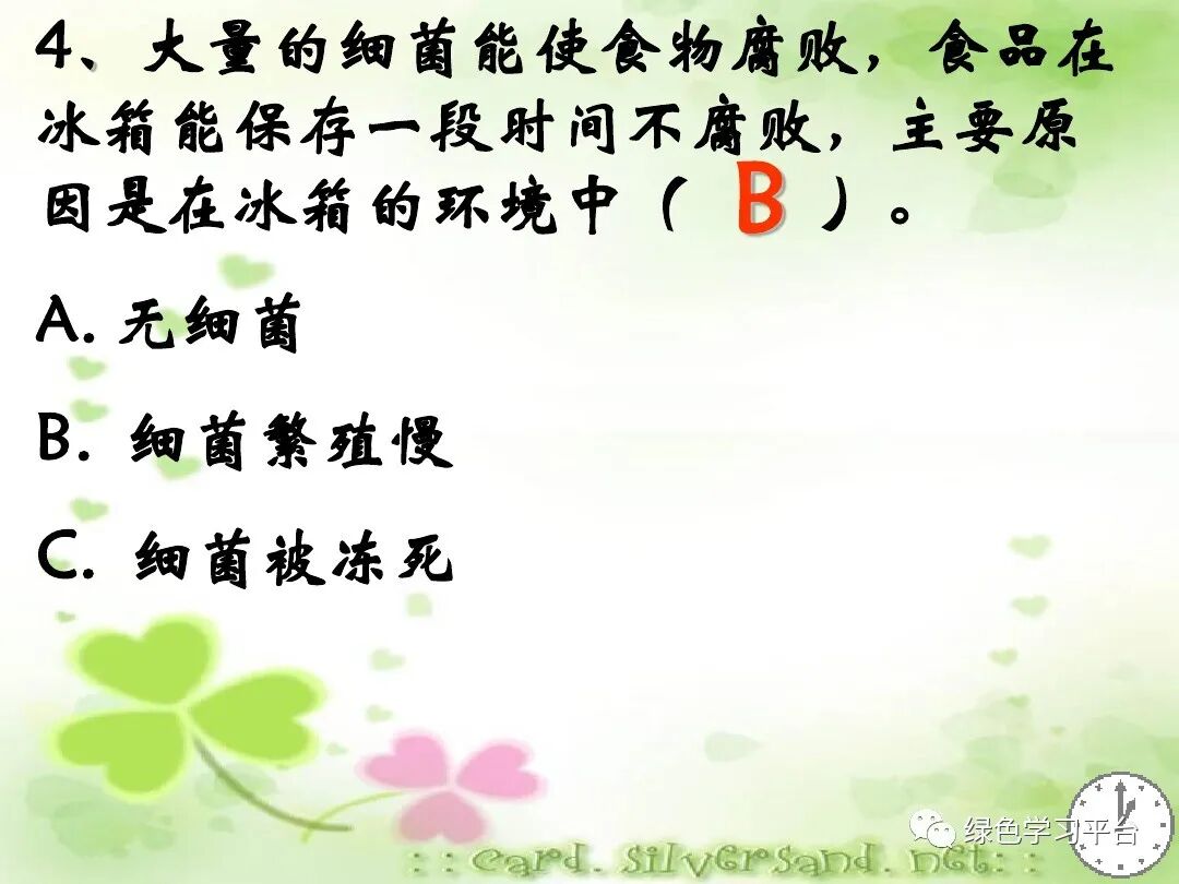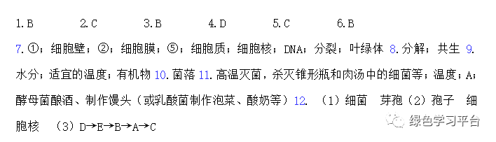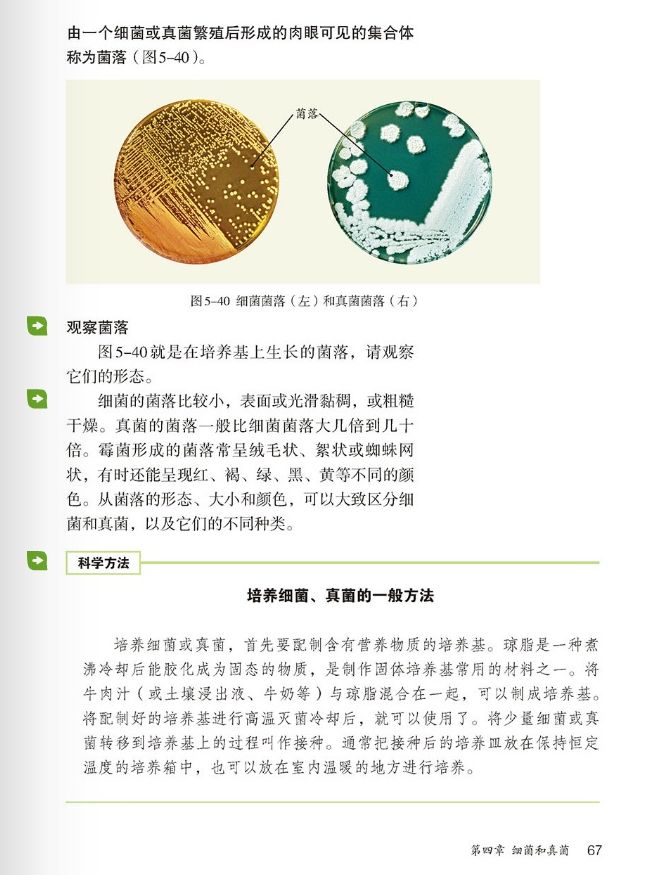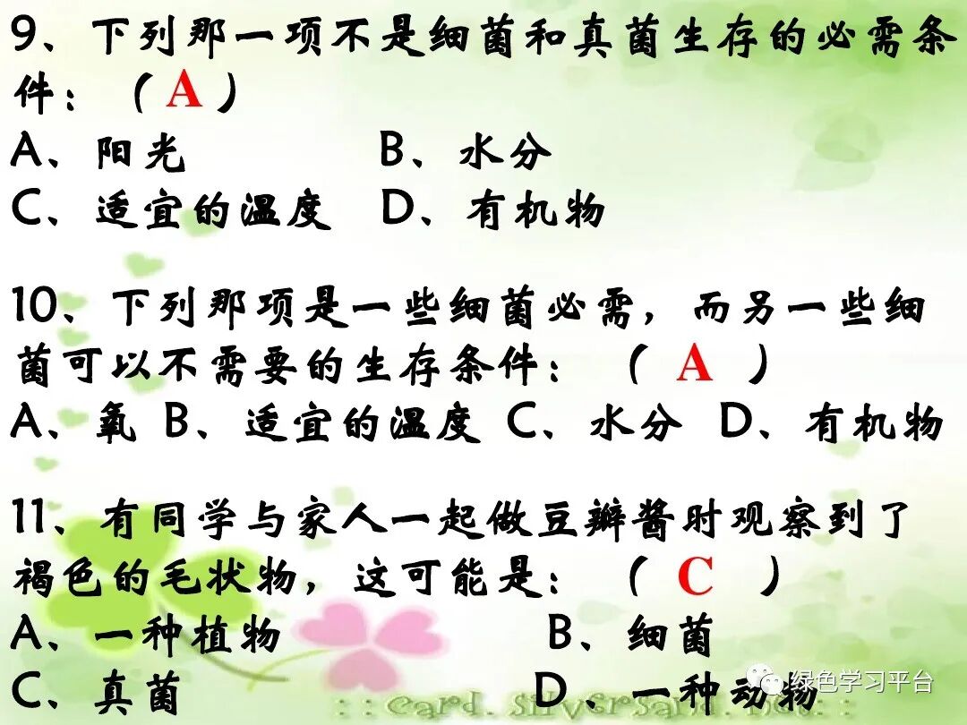 4.细菌和真菌生活必需的条件:水、营养物质、适宜的温度、一定的生存空间。