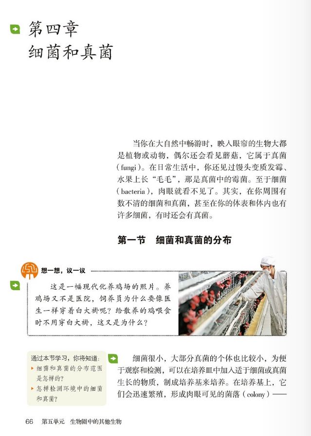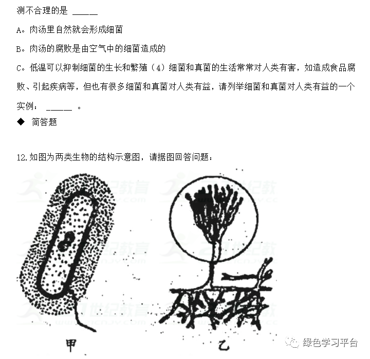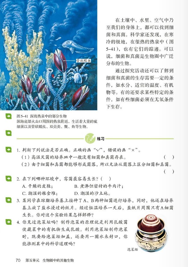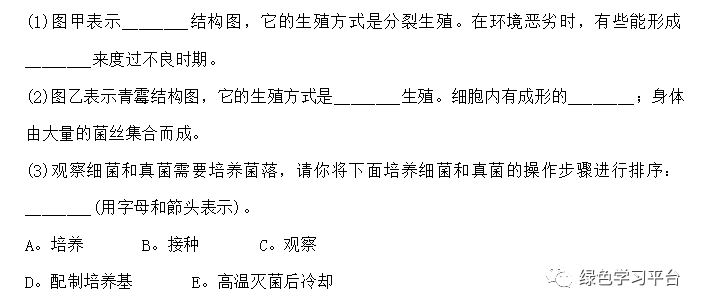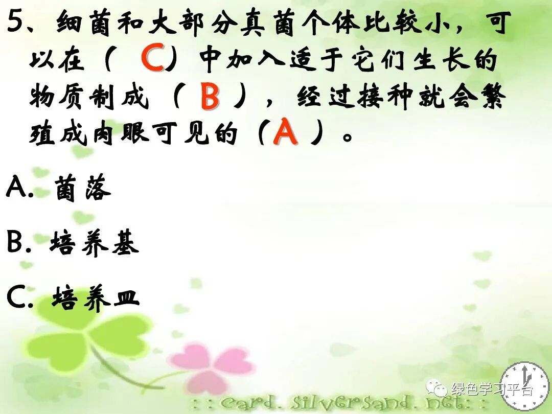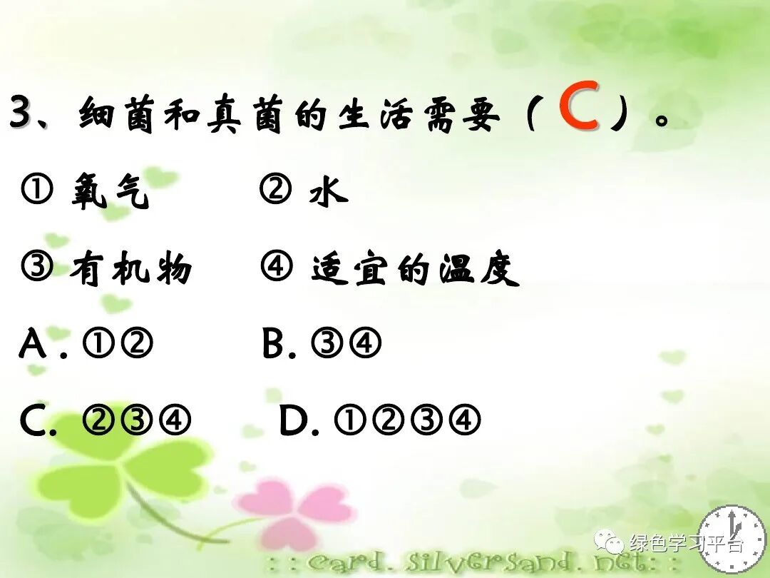 4.细菌和真菌生活必需的条件:水、营养物质、适宜的温度、一定的生存空间。