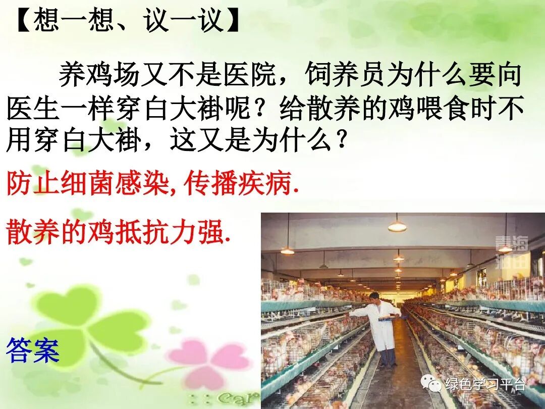 现代养鸡场中,鸡的活动空间很小,鸡群密度大,如果饲养员穿着随意,很可能会把病菌带入,使鸡患病。而且,养鸡场饲养的鸡抵抗力较差,疾病容易在鸡群中传播,导致鸡大量死亡。因此,饲养员要穿干净的工作服,并在进入鸡场时进行消毒,避免将病菌带入。而散养的鸡数量少,活动的空间大,抵抗力相对较强,因此,喂养时不用穿工作服。答:防止细菌感染,传播疾病.散养的鸡抵抗力强。
