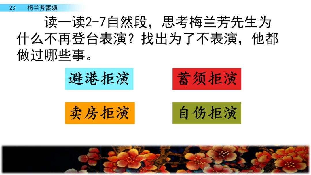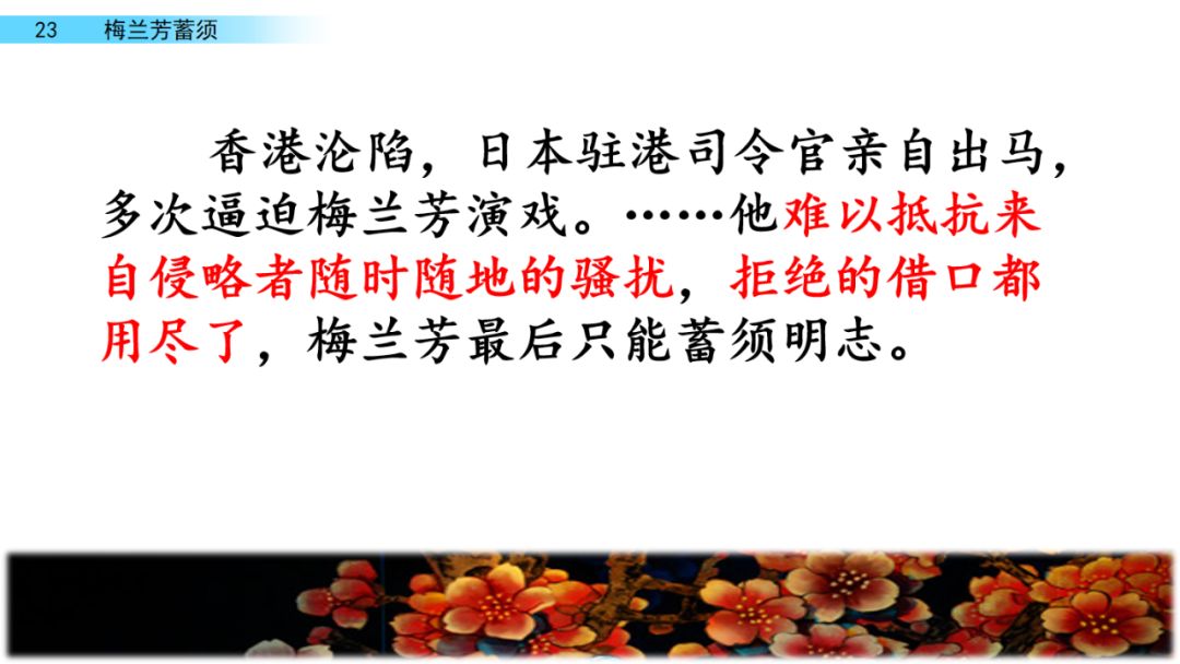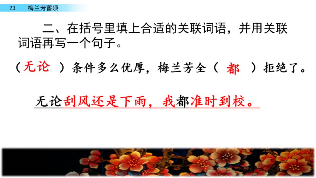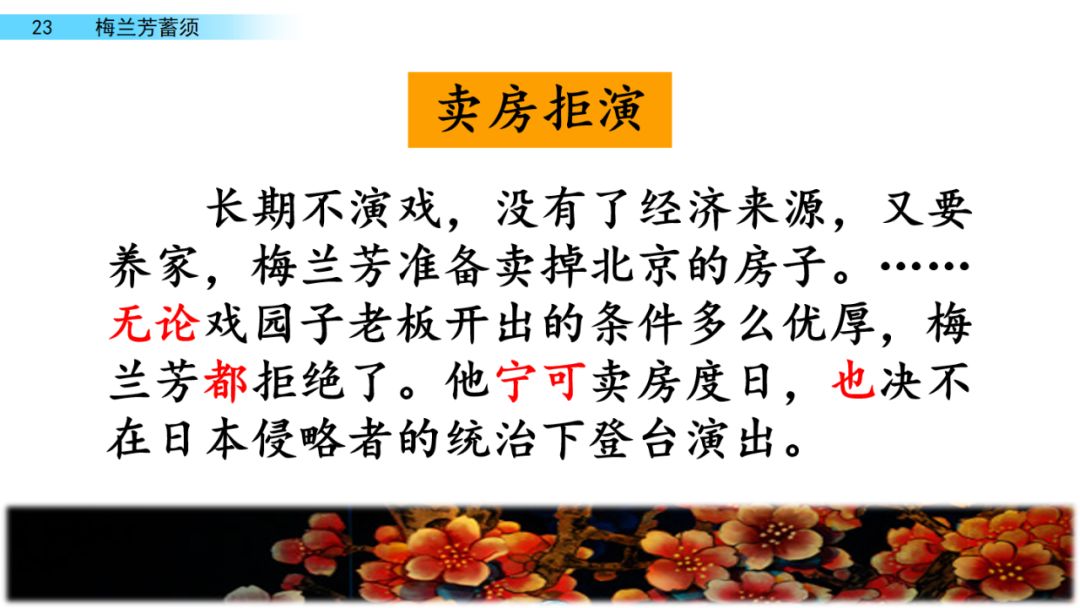 听说梅兰芳要卖房子,很多戏园子老板找上门来说:“梅先生,您何必卖房子,只要您把胡子一剃,一登台,还愁没钱花?”有的甚至说,只要签订演出合同,就预支二十两黄金给梅兰芳。( )条件多么优厚,梅兰芳( )拒绝了。他宁可卖房度日,也决不在日本侵略者的刺刀下登台演出。