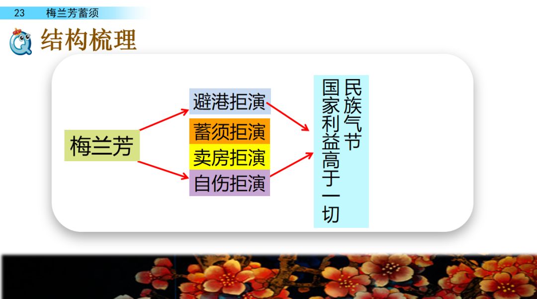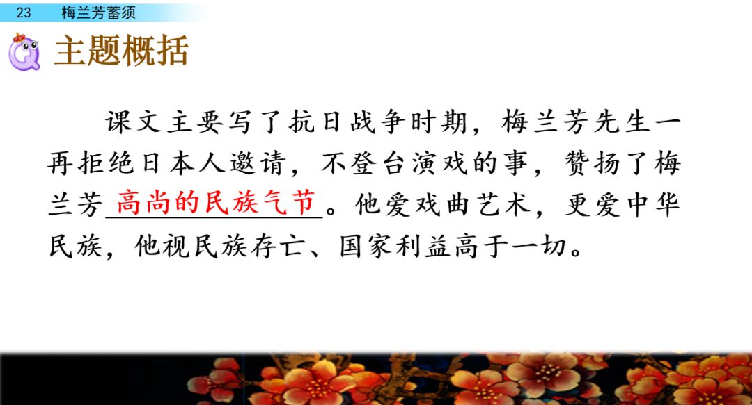 答:题目概括了本文的主要内容,表现了梅兰芳先生的民族气节和爱国精神。