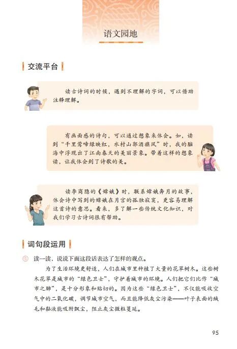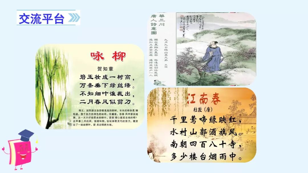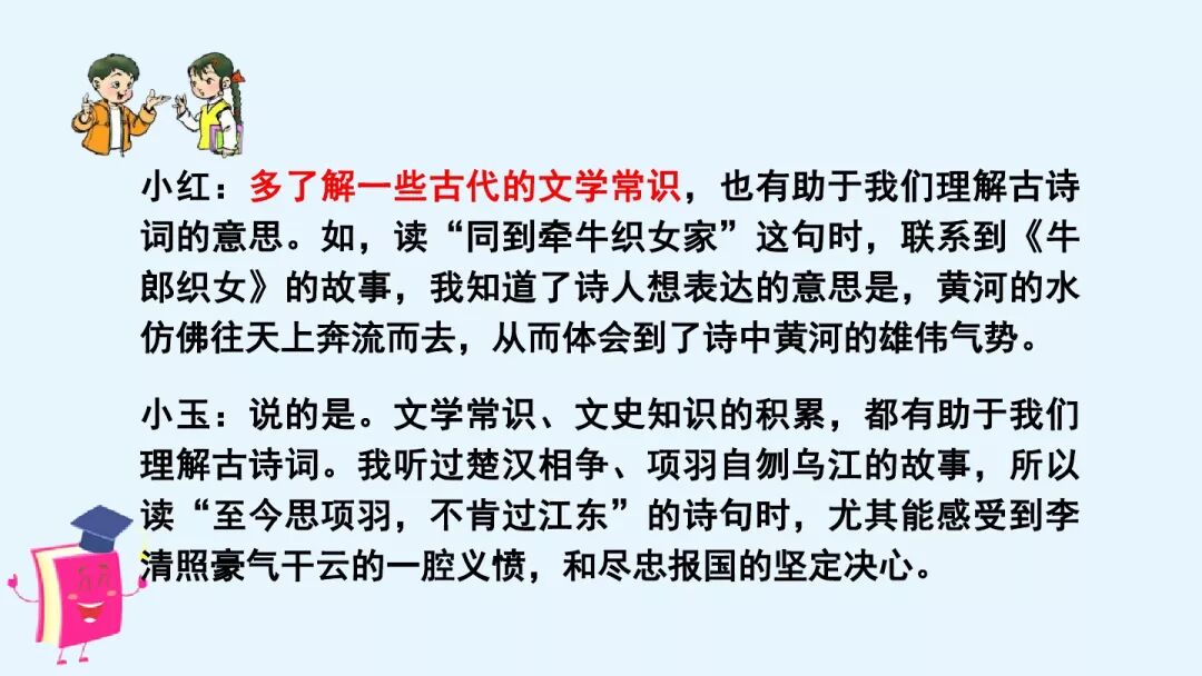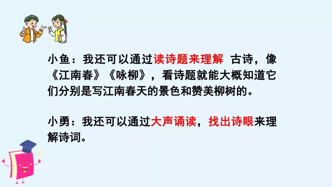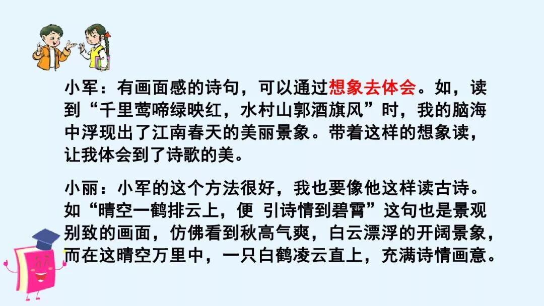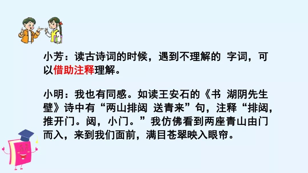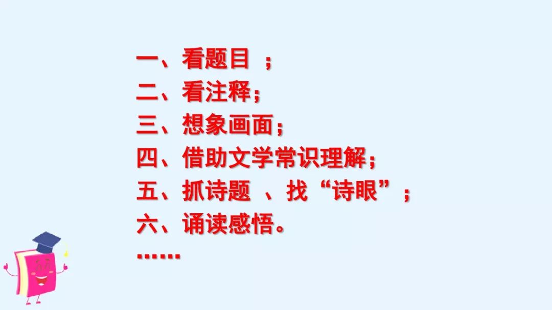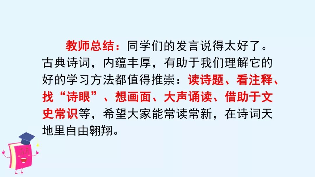 我发现大家交流的是学习古诗的方法,运用它们,可以更好地理解古诗。(1)读古诗词的时候, 遇到不理解的字词, 可以借助注释理解。(2)有画面感的诗句, 可以通过想象去体会。(3)多了解一些古代文化知识, 也有助于我们理解古诗词的意思。