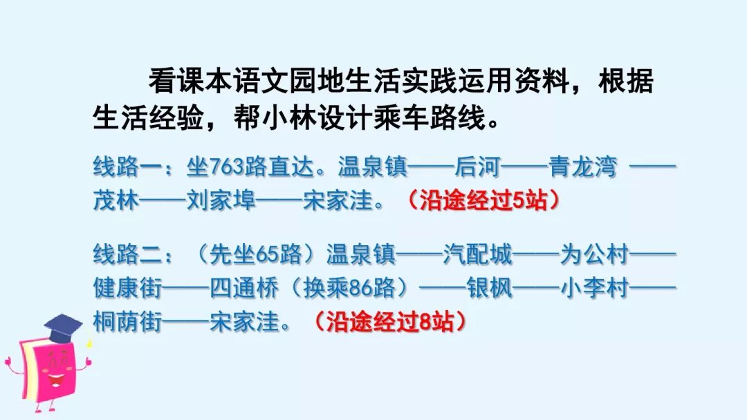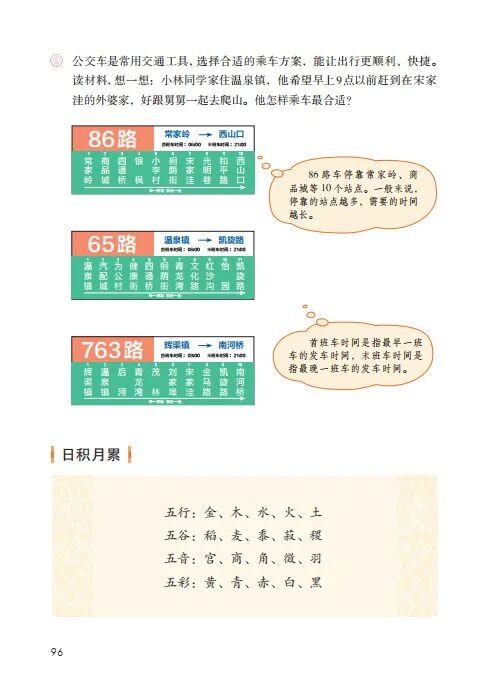2.公交车是常用交通工具,选择合适的乘车方案,能让出行更顺利、快捷。读材料,想一想:小林同学家住温泉镇,他希望早上9点以前赶到在宋家洼的外婆家, 好跟舅舅一起去爬山。他怎样乘车最合适?