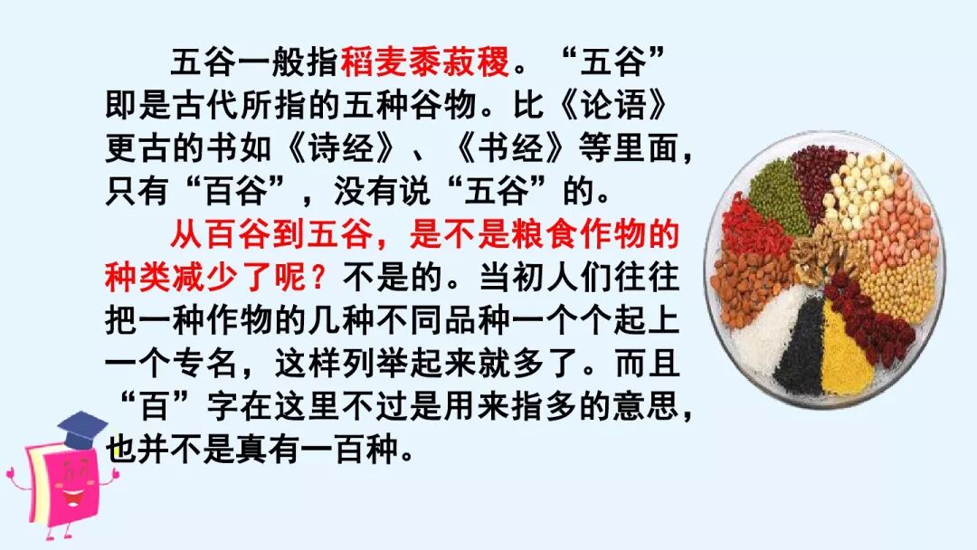 2.五谷:稻、麦、黍、菽、稷五种谷物。