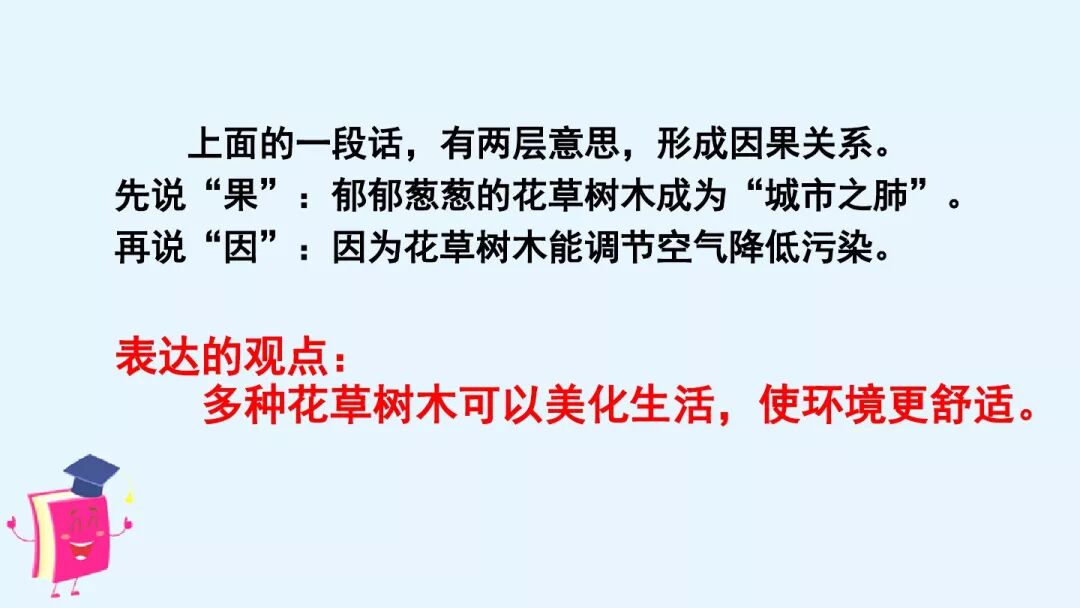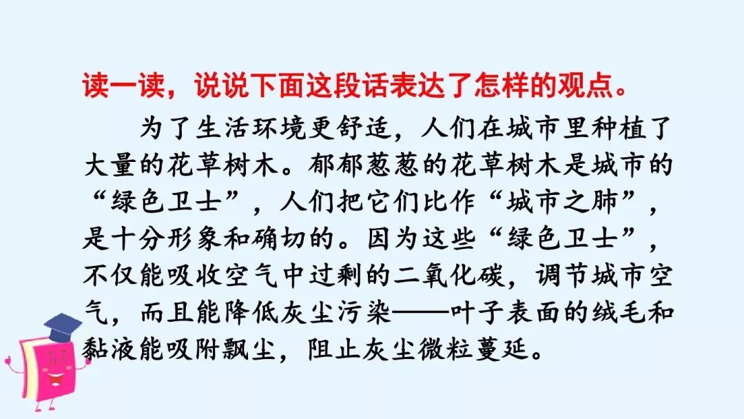 仔细读一读这段话,很快就发现,花草树木是这段话的核心。围绕花草树木,分别将它们比作“绿色卫士”“城市之肺”,作者要表达的观点就十分清楚了;花草树木对美化人们的生活环境发挥着巨大的作用。
