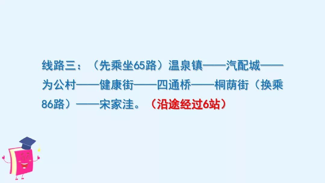 先运用排除法,将763路排除,因为这趟车首发时间是九点,虽然路程最短,但时间不符合小林的心愿,所以排除。然后建议八点前乘坐65路车,从温泉镇上车,在四通桥下车,换成常家岭开往西山口的86路车,在宋家洼下车。