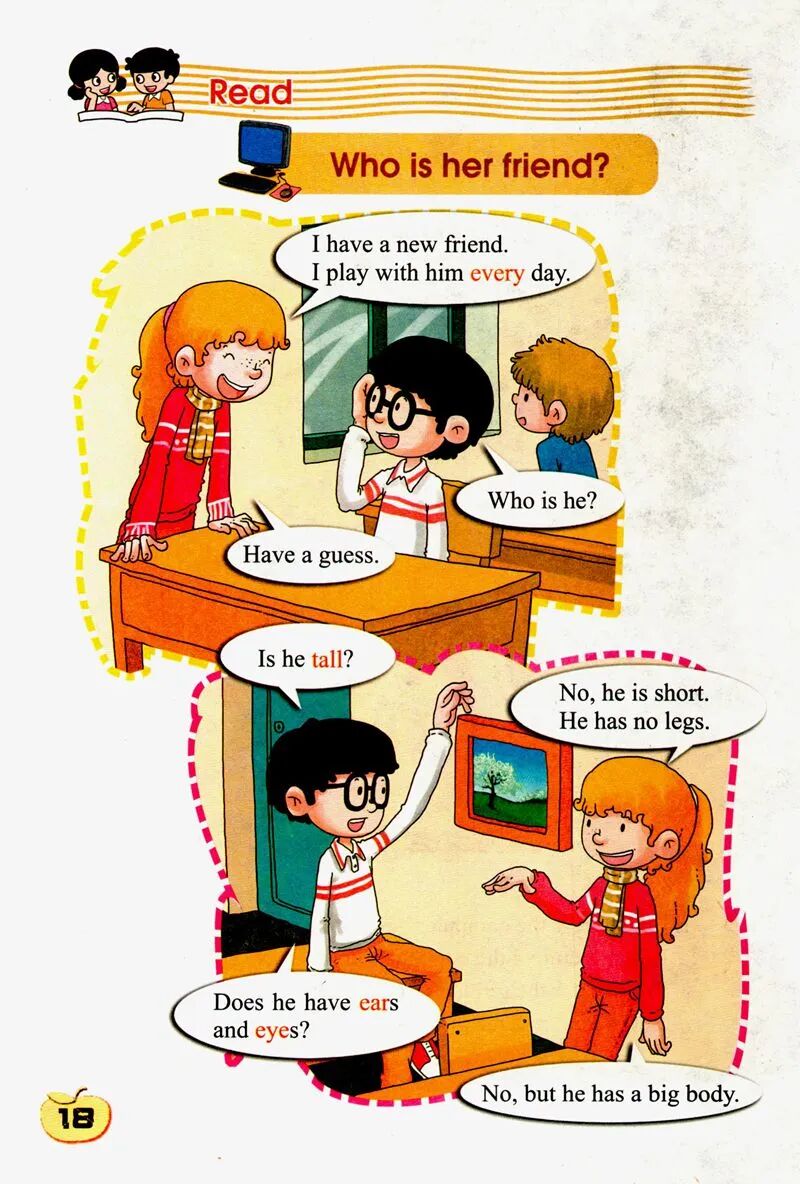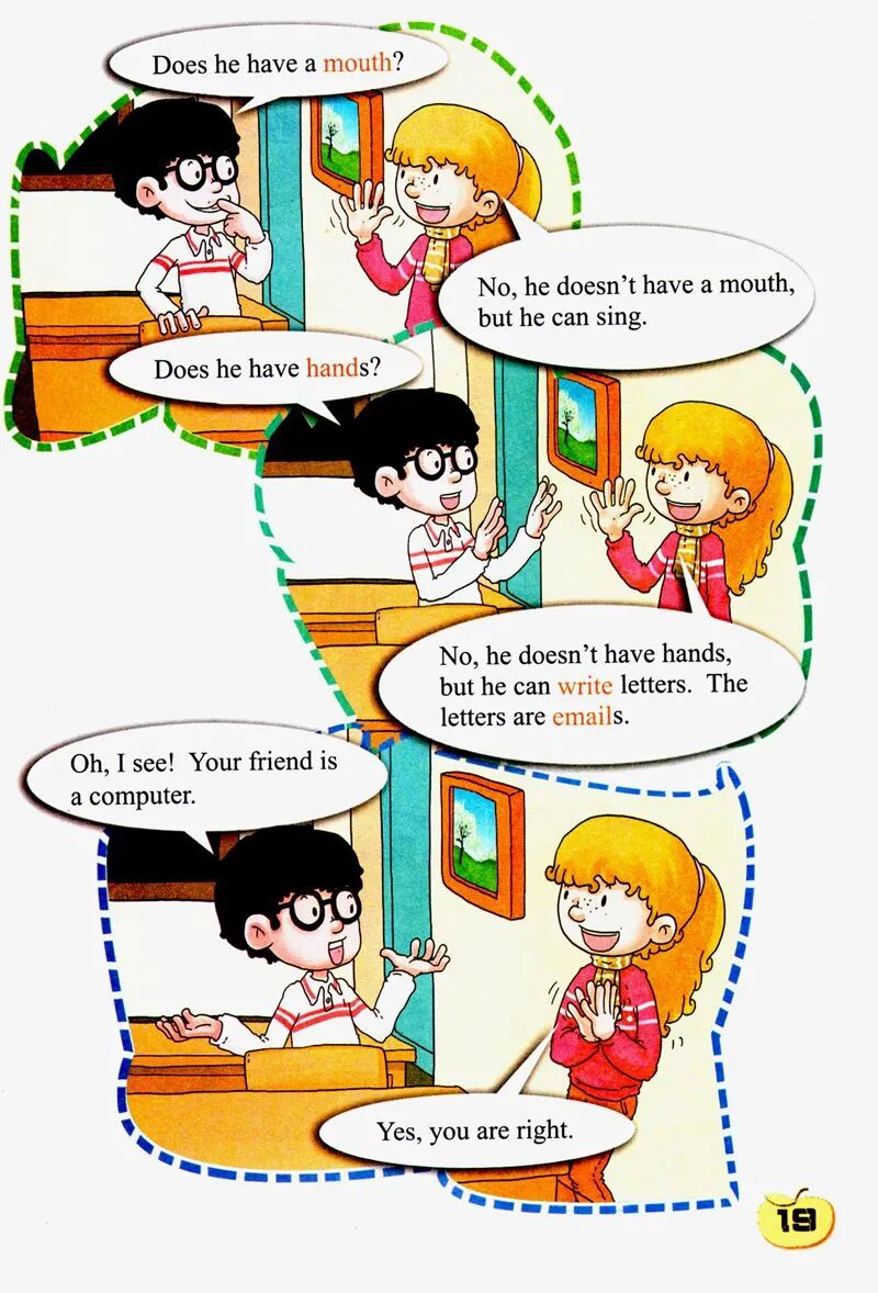 Lesson 3 A COMPUTER HAS A KEYBOARD No, it's not a TV.It's a computer.Yes.But a computer has a keyboard. Does a TV have a mouse, too? Where is the mouse?Let me catch it. Does a TV have a screen? 电视机有屏幕吗?screen/mouse/keyboard 屏幕/鼠标/键盘Two little eyes open and close.Two little ears and one little nose. Two little cheeks and one little mouth. Two little lips with teeth closed in.(歌曲)Who is her friend? 谁是她的朋友?I have a new friend.我有一位新朋友。I play with him every day.我每天都和他玩儿。No,he is short.He has no legs. Does he have ears and eyes? No, but he has a big body. Does he have a mouth? 他有嘴巴吗?No, he doesn't have a mouth,but he can sing.No, he doesn't have hands, but he can write letters.The letters are emails.Oh, I see! Your friend is a computer. Yes, you are right. 是的,你答对了。