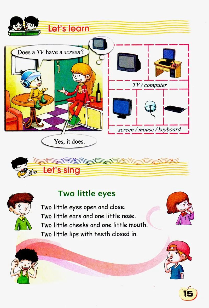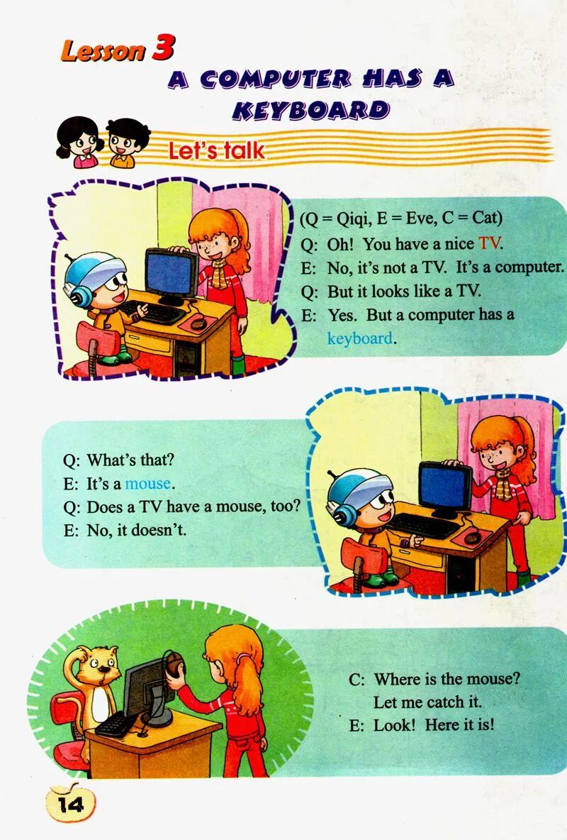获取配套课件教案习题试卷请拉到文末单词领读课文领读单词表TV 电视机every 每一个tall 高的ear 耳朵eye 眼睛mouth 嘴hand 手write 写 email 电子邮件keyboard 键盘mouse 鼠,鼠标every day 每天课文翻译Lesson 3 A COMPUTER HAS A KEYBOARD 第三课 计算机有一个键盘Let's talk 大家一起说Oh! You have a nice TV. 哦!你有一台漂亮的电视机。No, it's not a TV.It's a computer.不,它不是电视机。它是计算机。But it looks like a TV. 但是它看起来像电视机。Yes.But a computer has a keyboard. 是的,但是计算机有一个键盘。What's that? 那是什么?It's a mouse. 这是一个鼠标。Does a TV have a mouse, too? 电视机也有鼠标吗?No, it doesn't. 不,没有。Where is the mouse?Let me catch it. 老鼠在哪里?让我捉住它。Look! Here it is! 看!它在这儿!Let's learn 大家一起学习Does a TV have a screen? 电视机有屏幕吗?Yes,it does. 是的,有。TV/computer 电视机/计算机screen/mouse/keyboard 屏幕/鼠标/键盘Let's sing 大家一起唱歌Two little eyes 两只小眼睛Two little eyes open and close.Two little ears and one little nose. Two little cheeks and one little mouth. Two little lips with teeth closed in.(歌曲)Listen and choose 听录音,选择正确的答案...(听力练习)Read 阅读Who is her friend? 谁是她的朋友?I have a new friend.我有一位新朋友。I play with him every day.我每天都和他玩儿。Who is he? 他是谁?Have a guess. 猜一猜。Is he tall? 他高吗?No,he is short.He has no legs. 不,他很矮。他没有腿。Does he have ears and eyes? 他有耳朵和眼睛吗?No, but he has a big body. 没有,但是他有一个大大的身体。Does he have a mouth? 他有嘴巴吗?No, he doesn't have a mouth,but he can sing.不,他没有嘴巴,但是他会唱歌。Does he have hands? 他有手吗?No, he doesn't have hands, 不,他没有手,but he can write letters.The letters are emails.但是他会写信。信是电子邮件。Oh, I see! Your friend is a computer. 哦,我知道了!你的朋友是计算机。Yes, you are right. 是的,你答对了。同步微课高清课本 同步练习 Lesson3 A computer has a keyboard一.写出下列单词。电视机 _______ 每一个 _______ 高的_______ 耳朵_______眼睛_______ 嘴_______ 手_______ 写_______二.单项选择。( )1._____ a TV have a mouse?A.Do B.Does C.Is( )2.But it looks _____ a TV.A. like B.likes C./( )3.Look, here_____ ______.A.he is B.it is C.it,/三.英汉互译。1.你有一个很不错的电视。__________________________2.那是什么?__________________________3.一个电脑有一个鼠标。__________________________4.Where is the mouse?__________________________5.It’s a mouse.__________________________四.用所给单词的适当形式填空。1. I _____(have) a new friend.2. _____(do)she have big eyes?3. _____(have) a guess.4. The letters are _____(email).参考答案Lesson3一.TV every tall ear eye mouth hand write二.B,A,B三.1.You have a nice TV.2.What’s that?3.A computer has a mouse.4.鼠标在哪里?5.它是一个鼠标。四.have,Does,Have,emails怎么获取配套课件教案习题试卷等资料?按下面方法扫码回复▼免费领取方式识别二维码关注:中小学师生关注后在公众号最下面发送消息【16】2个数字即可领取全套资料图文来自网络,版权归原作者,如有不妥,告知即删点击阅读原文下载全册PPT课件动画教案习题朗读试卷电子课本整套资料