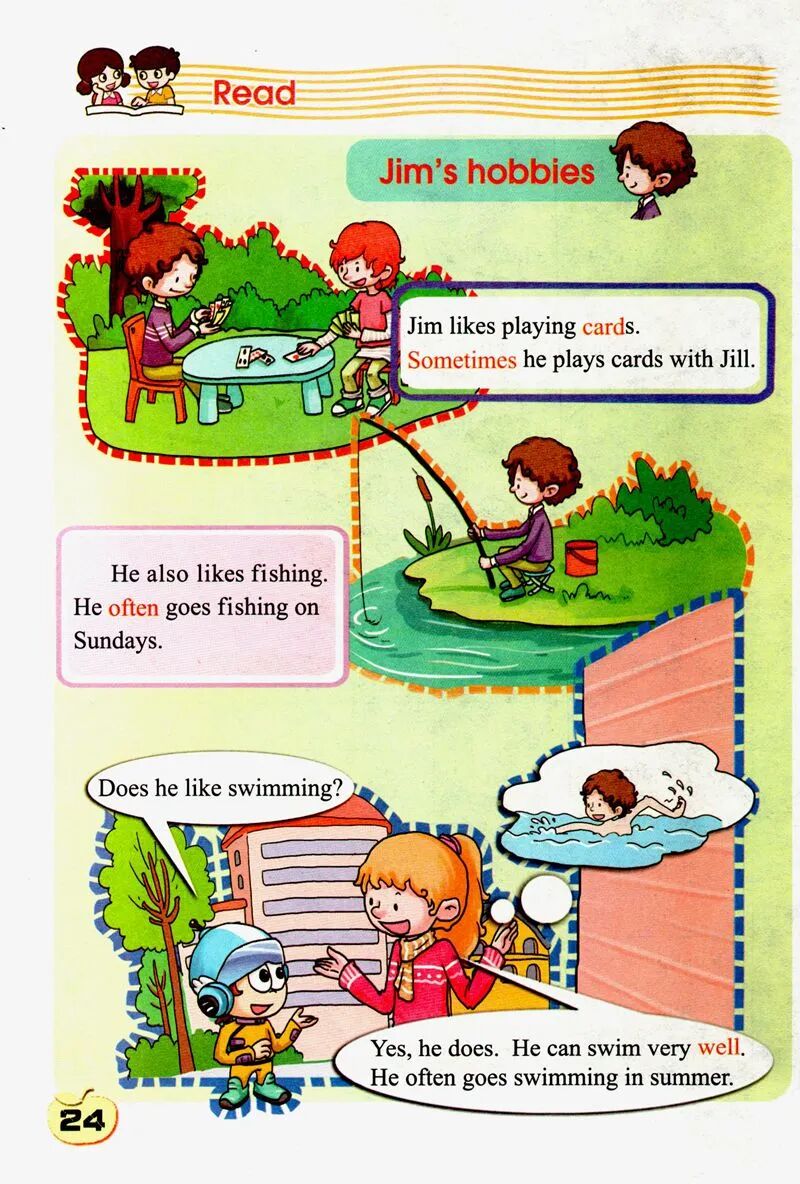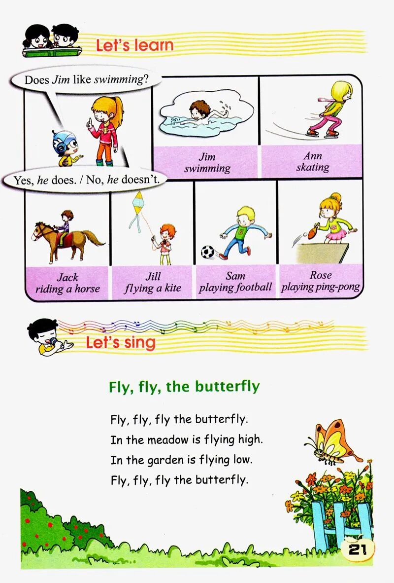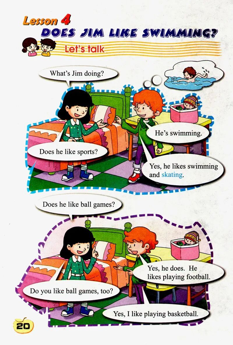 获取配套课件教案习题试卷请拉到文末单词领读课文领读单词表Lesson 4 第4课card 卡片sometimes 有时often 经常well 健康的;好skate 滑冰play basketball 打篮球go fishing 去钓鱼课文翻译Lesson 4 DOES JIM LIKE SWIMMING? 第四课 吉姆喜欢游泳吗?Let's talk 大家一起说What's Jim doing? 吉姆在做什么?He's swimming. 他正在游泳。Does he like sports? 他喜欢体育吗?Yes, he likes swimming and skating. 是的,他喜欢游泳和滑冰。Does he like ball games? 他喜欢球类游戏吗?Yes, he does.He likes playing football. 是的,他喜欢。他喜欢踢足球。Do you like ball games,too? 你也喜欢球类游戏吗?Yes,I like playing basketball. 是的,我喜欢打篮球。Let's learn 大家一起学习Does Jim like swimming? 吉姆喜欢游泳吗?Yes,he does./No,he doesn't. 是的,他喜欢。/不,他不喜欢。Jim/swimming 吉姆/游泳Ann/skating 安/滑冰Jack/riding a horse 杰克/骑马Jill/flying a kite 吉尔/放风筝Sam/playing football 萨姆/踢足球Rose/playing ping-pong 罗斯/打乒乓球Let's sing 大家一起唱歌Fly,fly,the butterfly 蝴蝶飞飞Fly,fly,fly the butterfly in the meadow is flying high, in the garden is flying low.Fly,fly,fly the butterfly.(歌曲)Listen and number 听录音,标序号...(听力练习)Read 阅读Jim's hobbies 吉姆的爱好Jim likes playing cards. 吉姆喜欢打牌。Sometimes he plays cards with Jill.有时他和吉尔一起打牌。He also likes fishing. 他还喜欢钓鱼。He often goes fishing on Sundays.周日他经常去钓鱼。Does he like swimming? 他喜欢游泳吗?Yes,he does.He can swim very well. 是的,他喜欢。他游得很好。He often goes swimming in summer. 夏天他经常游泳。What about ball games?Does he like football? 球类游戏呢?他喜欢足球吗?No,he doesn't,but he likes playing ping-pong very much.不,他不喜欢。但是他非常喜欢打乒乓球。Does he like computer games? 他喜欢电脑游戏吗?No, he doesn't.He likes reading on his computer. 不,他不喜欢。他喜欢在电脑上看书。同步微课高清课本 同步练习Lesson4 Dose Jim like swimming?一.写出下列单词。卡片_______ 有时_______ 经常的 _______ 健康的 _______二.单项选择。( )1._____ Jim like swimming?A.Do B.Does C.Is( )2.Does it _____ ball games?A. like B.likes C./( )3.I like _____ football.A.play B.playing C.plays三.英汉互译。1.Jim 正在做什么?__________________________2.我喜欢画画。__________________________3.他喜欢踢足球吗?__________________________4.What’s your favorite sport?__________________________5. He likes swimming and skating.__________________________四.将下列句子改成一般疑问句,并进行肯定和否定回答。1. I like doing sports.______________________ ______________________2. He likes playing basketball.______________________ ______________________参考答案Lesson4一.card sometimes often well二.B,A,B三.1.What is Jim doing?2.I like drawing.3.Does he like playing football?4.你最喜欢的运动是什么?5.他喜欢游泳和滑冰。四.1.Do you like doing sports? Yes, I do.\No, I don’t.3.Does he like playing basketball? Yes, he does.\No, he doesn ’t.怎么获取配套课件教案习题试卷等资料?按下面方法扫码回复▼免费领取方式识别二维码关注:中小学师生关注后在公众号最下面发送消息【16】2个数字即可领取全套资料图文来自网络,版权归原作者,如有不妥,告知即删点击阅读原文下载全册PPT课件动画教案习题朗读试卷电子课本整套资料