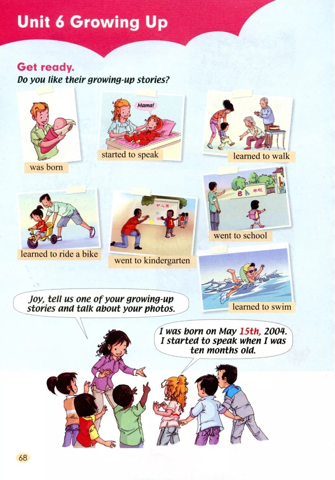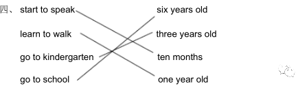 一、 1. start to speak 2. learn to walk 3. learn to ride a bike 4. learn to swim