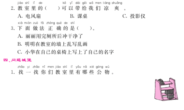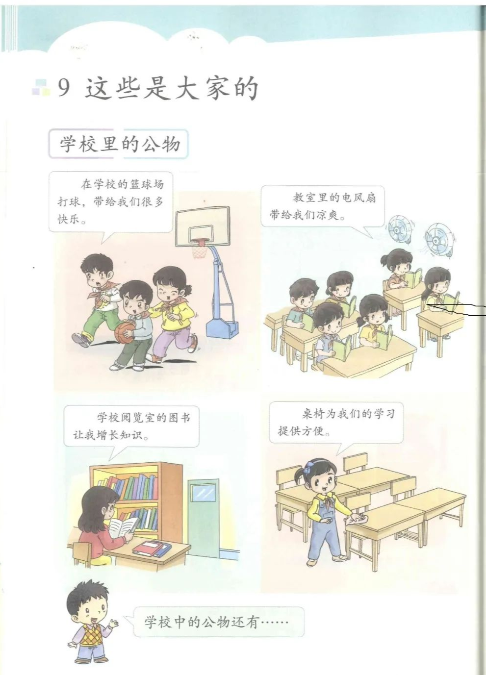 获取配套课件教案习题试卷请拉到文末微课讲解电子课本知识点1、爱护(公共)财物——《中小学生守则》。2、学校中的公物有(电风扇)、(阅览室的图书)、(课桌椅)、(篮球场)等。3、用完厕所要(冲干净)。不能在墙上(乱画),把抹布(摆放整齐),给桌子套上桌布保护桌子。图文讲解教学设计9《这些是大家的》 教学设计 活动一:学校里的公物。课件出示34页插图。生交流:操场上的篮球场、教室里的电风扇、图书管里的图书、教室里的桌椅……你还知道学校中的公物有?活动二:身边的公物还好吗?把全班分成4个小组,一起走到校园里去调查调查吧!看看哪些是好的?哪些是有损坏的?哪些是不能用的?完成表格。师总结:要做一个爱护公共财产的小学生。活动三:我和公物的故事。看课件学习36页。生交流:我也说说我和公物的故事。活动四:大家一起来爱护。PPT出示图片。让孩子们评论书中的小朋友的做法好吗?我们还可以做些什么?一起行动吧!同步习题【参考答案】一.1.凉爽―2.桌椅―3.阅览室4.爱护5.篮球场桌椅二、1.×2.√3.×4.√三,1.C2.A3.A四1.电风扇﹑电灯、桌椅等。怎么获取全册配套课件教案习题试卷等资料?▼领取方法1第一步:长按二维码关注教案课件资源网第二步:回复关键词:0002领取方法2▼打不开百度网盘链接的地区可长按扫码直接进入下载▼▼电脑端下载网址http://jazpan.com/box/593.html▼(回复关键词位置如下图所示)图文来自网络,版权归原作者,如有不妥,告知即删点击阅读原文下载全册PPT课件动画教案习题朗读试卷电子课本整套资料