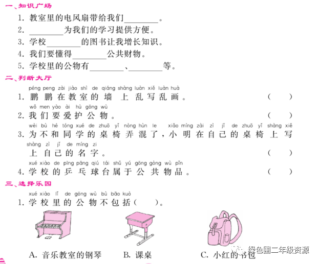 2、学校中的公物有(电风扇)、(阅览室的图书)、(课桌椅)、(篮球场)等。3、用完厕所要(冲干净)。不能在墙上(乱画),把抹布(摆放整齐),给桌子套上桌布保护桌子。