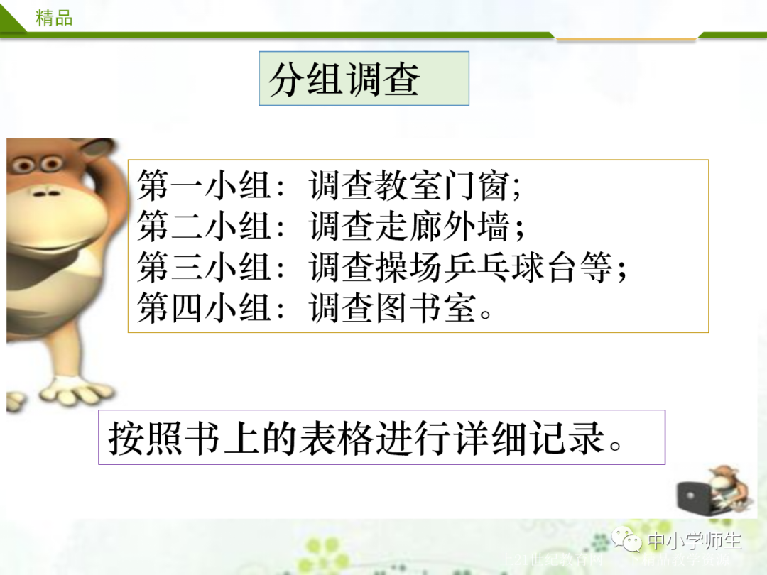把全班分成4个小组,一起走到校园里去调查调查吧!看看哪些是好的?哪些是有损坏的?哪些是不能用的?