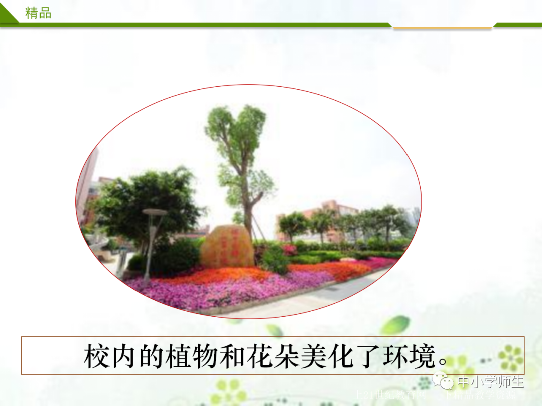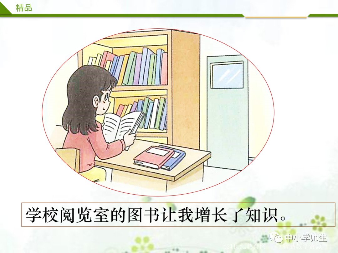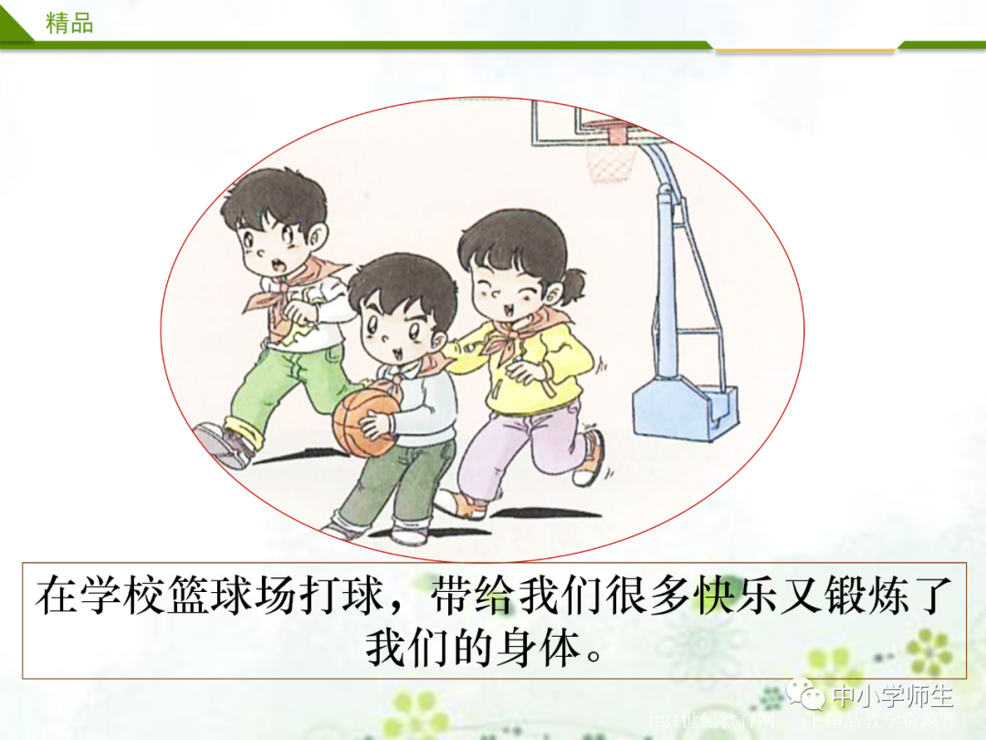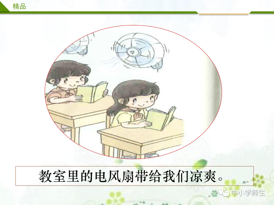 生交流:操场上的篮球场、教室里的电风扇、图书管里的图书、教室里的桌椅……