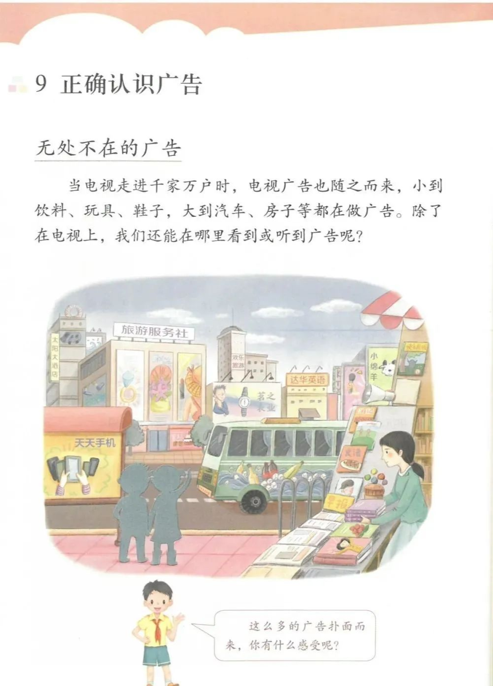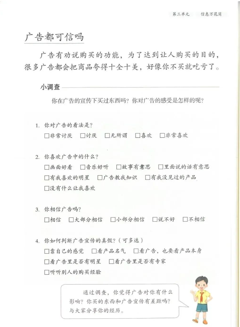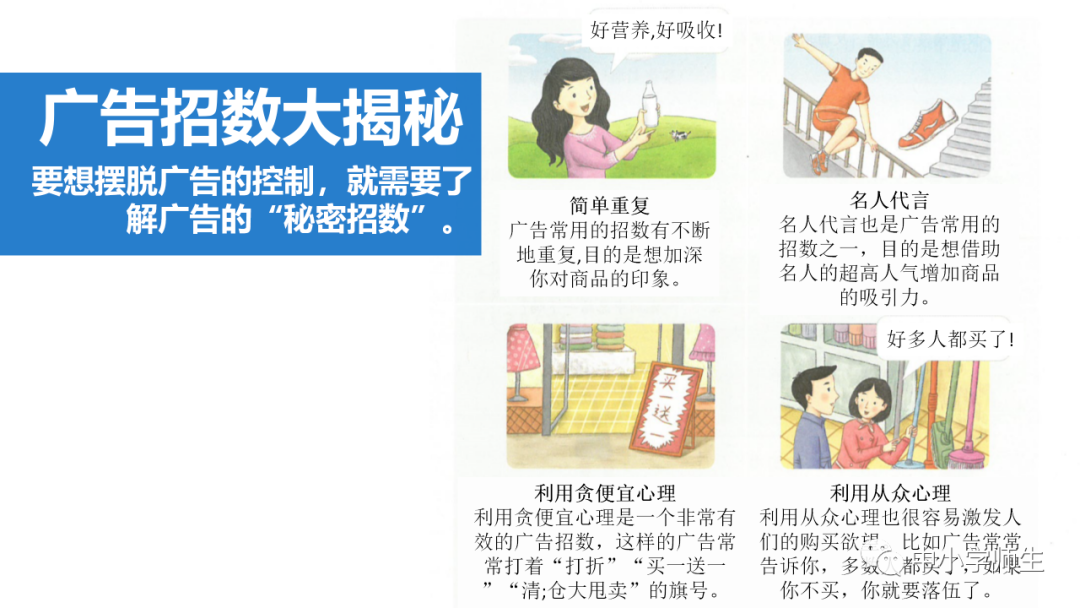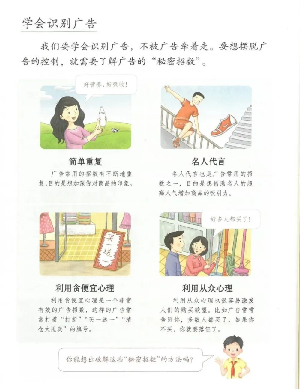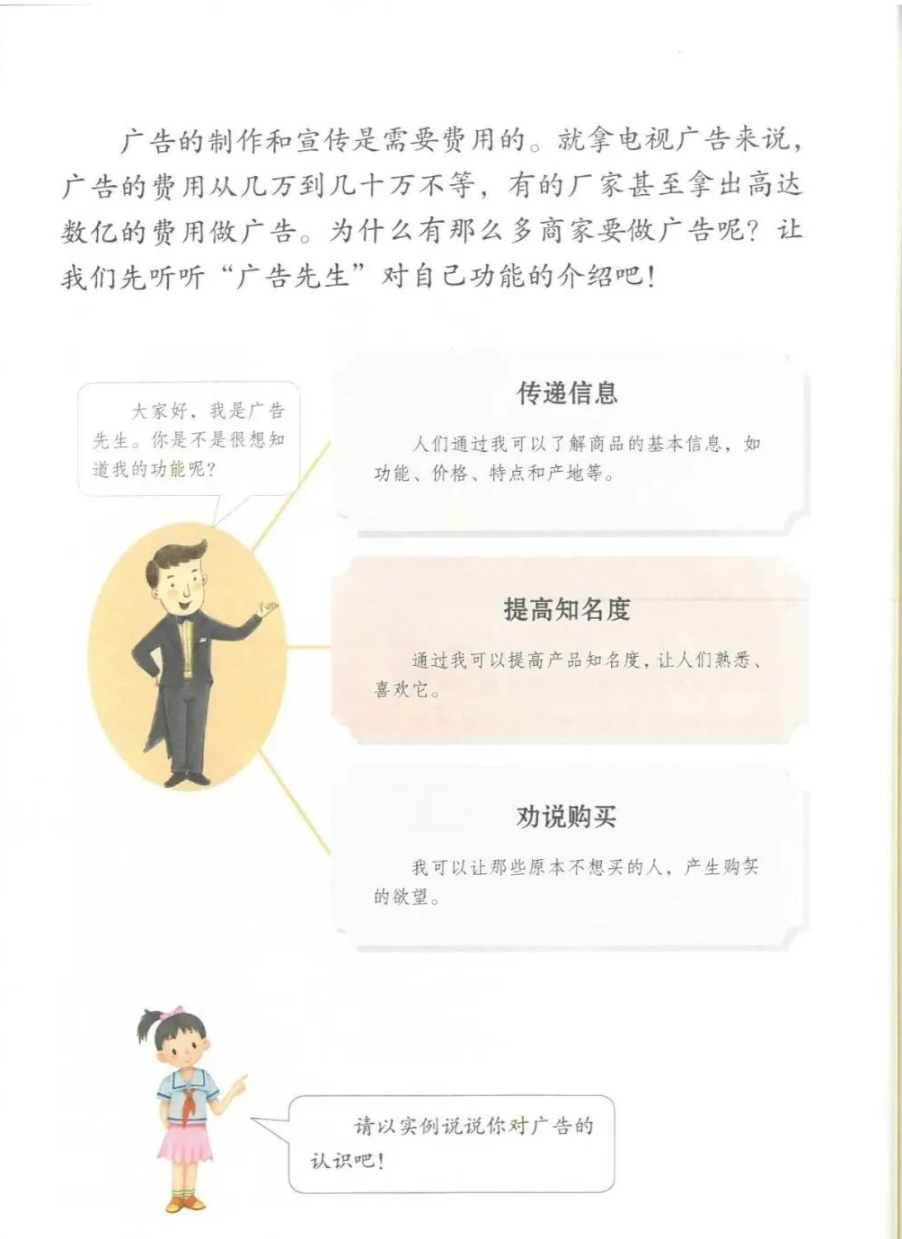 获取配套课件教案习题试卷请拉到文末微课讲解电子课本知识点1. 当电视走进千家万户时,电视广告也随之而来。2. 正确认识广告。广告无处不在,广告的内容不一定都可信。17.广告的内容不一定都可信,虚假广告就更不可信了,虚假广告要么是推销假冒、劣质商品,要么是直接骗取消费者的钱财,这往往会造成严重的后果。3. 学会识别广告。面对广告的猛烈攻势,我们要善于识别广告,做聪明的消费者。 问答题:1. 如何正确认识广告?广告无处不在;广告的内容不一定都可信;面对广告的猛烈攻势,我们要善于识别广告,做聪明的消费者。2. 虚假广告有哪些危害呢?(1)对消费者:误导消费者,造成不必要的财产损失;欺骗消费者,相应会对消费者造成人身和财产损失。(2)对商家:破坏了自身的良好形象;造成自身财产损失。3. 你能想出破解虚假广告的方法吗?需要了解虚假广告的秘密招数;根据需要购买消费,不盲目,不从众;不贪小便宜。图文讲解教学设计9《正确认识广告》教学设计教学目标知识与能力:1.提高学生认识广告的能力。2.知道广告的种类、呈现方式、特点及其功能,明白商家做广告的目的性。3.引导学生知道如何理性的识别商业广告的虚假,怎样才能不被商业广告牵着走。过程与方法:通过自身体验、情景体验、小调查、小讨论、案例分析、提建议、阅读感悟等活动教学,培养学生动手实践能力,使学生提高认识广告的能力。情感态度与价值观:提高学生信息素养。教学重难点1.重点:让学生知道对广告的内容不可全信;对广告应有基本的辨别和判断能力。2.难点:让学生具有对广告应有基本的辨别和判断能力。学情分析。四年级的学生处于从中年级向高年级的过渡期,他们经过前三年课程的学习,对广告信息接受较快、辨别是非的能力较弱,对人和事物的认识逐渐摆脱形象思维的特点,初步具备抽象思维的能力,再根据以上教材分析,为此,确定以下教学方法。教法和学法。1.教法:启发式、小组合作探究法2.学法:自主学习法及活动与探究3.教学准备:教师制作PPT课件及搜集资料,学生课前准备好参与活动的资料教学过程。第一课时(一)导入。1.师播放视频:广告视频师再出示一张纸质广告。提问:视频和一张纸是什么?大家还见过什么形式的广告?2.生自由回答。(广告)3.师:同学们回答得很好。这节课我们就来探究一下广告问题。(二)讲授新课目标导学一:无处不在的广告活动与探究一:看一看,说一说(1)生阅读教材第64页内容(2)小组合作,探究问题☆说在电视上我们还可以在哪里找到广告?☆你你认为广告多了有好处还是坏处?(3)先在小组内交流,各组推荐代表,全班交流与分享活动与探究二:认真看第65面的知识窗。(1)生阅读教材第65页内容(2)小组合作,探究问题☆广告在生活中有很多的隐藏形势,你知道哪些?☆广告无处不在,你能否做到一天不看到广告。(3)先在小组内交流,各组推荐代表,全班交流与分享(4)师小结活动与探究三:认一认,写一写(1)生阅读教材第66页内容(2)小组合作,探究问题☆你对广告持什么态度?☆为什么有那么多的厂家商要做广告呢?(3)先在小组内交流,各组推荐代表,全班交流与分享。(4)师小结第二课时(一)复习导入。(二)讲授新课。目标导学二:广告都可信吗?活动与探究一:调查(课前进行)(1)生阅读教材第67页内容(2)小组合作,探究问题☆你认为什么样的广告才会对你产生影响?☆你买的东西和广告上的东西我差别吗?(3)先在小组内交流,各组推荐代表,全班交流与分享。(4)生完成教材P67空格内容,师指导、补充。活动与探究二:小讨论(1)生阅读教材第68页内容(2)小组合作,探究问题:☆你认为广告是真的还是假的?☆你知道哪些是虚假广告吗?(3)先在小组内交流,各组推荐代表,全班交流与分享(4)师小结:广告里的内容不一定可信,那么虚假广告的内容就更不能可信了。虚假广告,要么是推销假冒劣质产品。要么是直接骗取消费者的财权,这样的后果更加严重。活动与探究三:认真看一看第69面的知识窗(1)生阅读教材第69页内容(2)小组合作,探究问题:☆你认为虚假广告会对人造成哪些危害?☆如果对你产生了不良影响,你会怎么办?(3)先在小组内交流,各组推荐代表,全班交流与分享(4)生完成教材P69空格内容,师指导、补充。目标导学三:学会识别广告。活动与探究一:看一看,想一想(1)生阅读教材第70页内容(2)小组合作,探究问题:☆你能识别这些虚假广告吗?☆你能抵制住虚假广告的诱惑吗?(3)先在小组内交流,各组推荐代表,全班交流与分享(4)师小结:面对广告,我们要学会识别,不能被广告牵着走。要摆脱广告的控制,需要了解广告的秘密招数。活动与探究二:仔细看一下第71面的知识窗。(1)生阅读教材第71页内容(2)小组合作,探究问题:☆你有什么好的办法帮助主人公?☆假如你是主人公,你会怎么办?(3)先在小组内交流,各组推荐代表,全班交流与分享(4)师小结:面对广告的猛烈攻势,我没有学会善与识别广告。做聪明的消费者。(三)师总结:认识了广告对人们生活产生的影响,我们要增强对广告信息基本的辨别和判断能力,学会理性地对待社会中的商业广告,不被广告牵着走。板书设计。9.正确认识广告无处不在的广告:种类,呈现方式,特点和功能正确认识广告:虚假广告的危害同步习题一、填空:1、广告有很多种,比如 、 等,随着科技发达,有了更 多的传播技术支持,广告更是 、 、