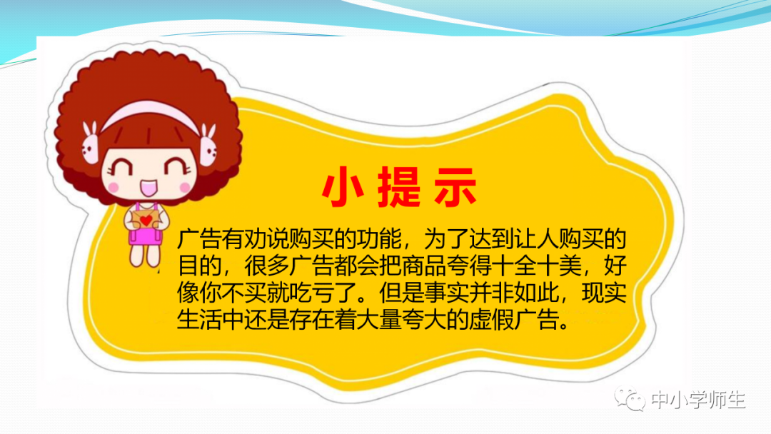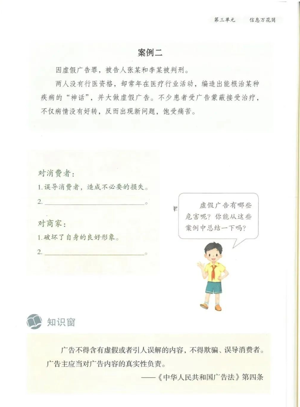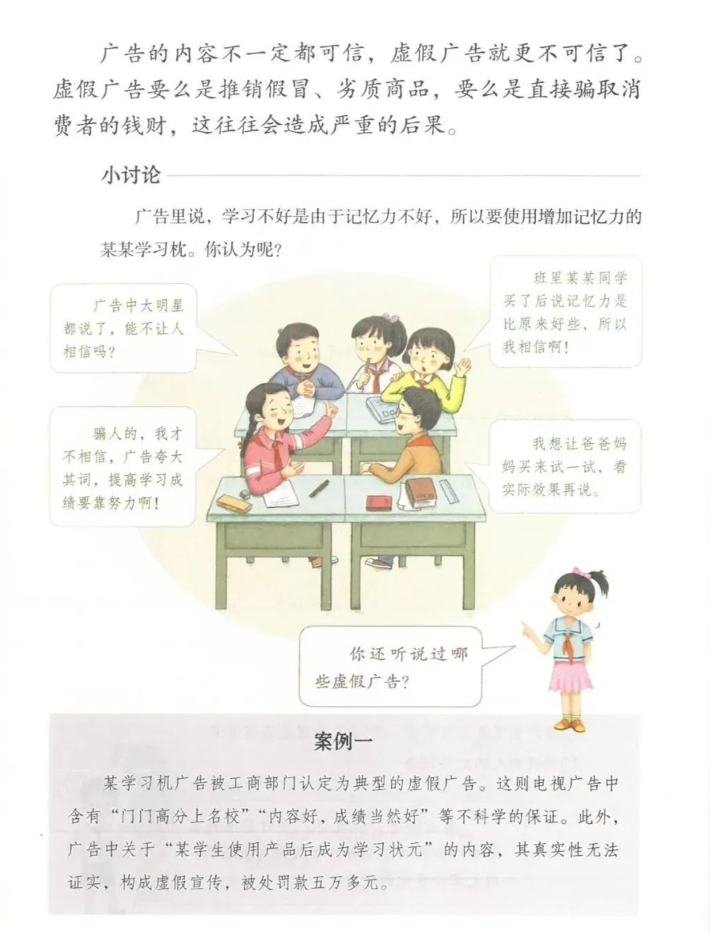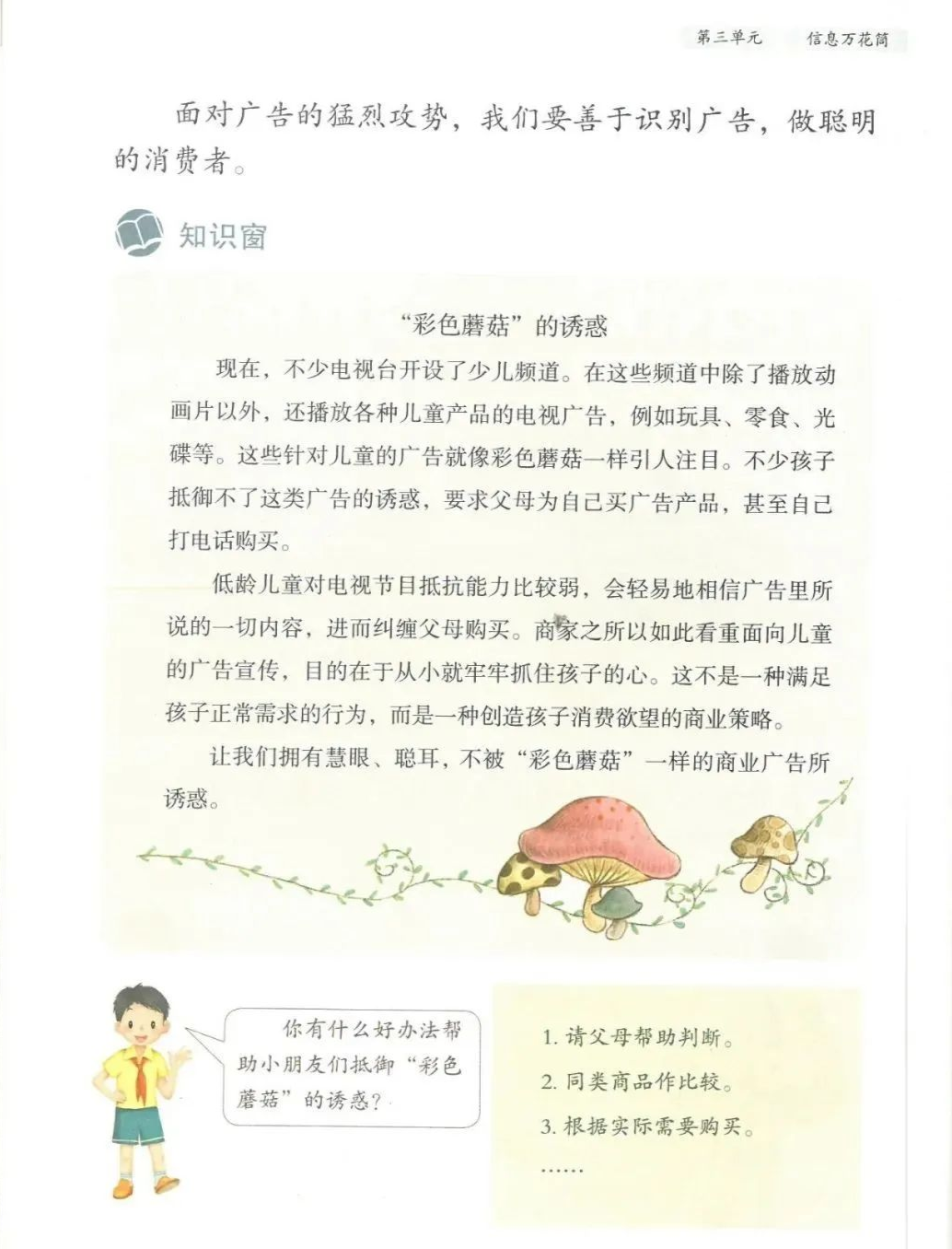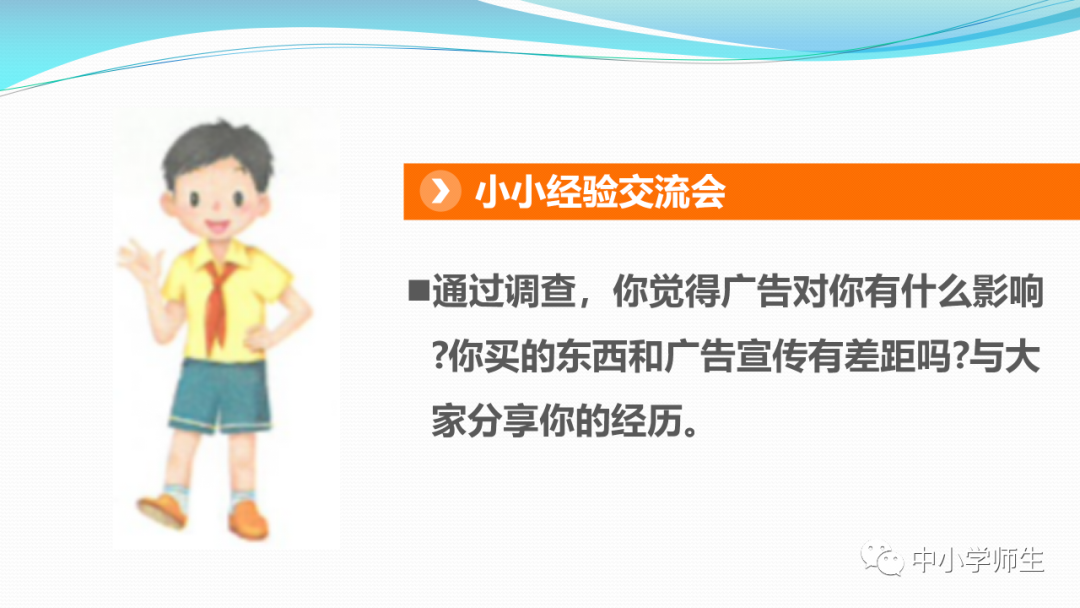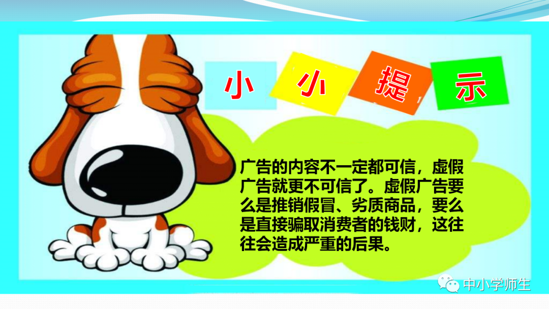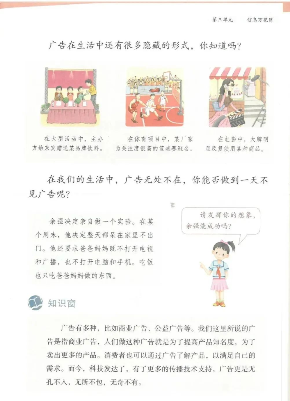 获取配套课件教案习题试卷请拉到文末微课讲解电子课本知识点1. 当电视走进千家万户时,电视广告也随之而来。2. 正确认识广告。广告无处不在,广告的内容不一定都可信。17.广告的内容不一定都可信,虚假广告就更不可信了,虚假广告要么是推销假冒、劣质商品,要么是直接骗取消费者的钱财,这往往会造成严重的后果。3. 学会识别广告。面对广告的猛烈攻势,我们要善于识别广告,做聪明的消费者。 问答题:1. 如何正确认识广告?广告无处不在;广告的内容不一定都可信;面对广告的猛烈攻势,我们要善于识别广告,做聪明的消费者。2. 虚假广告有哪些危害呢?(1)对消费者:误导消费者,造成不必要的财产损失;欺骗消费者,相应会对消费者造成人身和财产损失。(2)对商家:破坏了自身的良好形象;造成自身财产损失。3. 你能想出破解虚假广告的方法吗?需要了解虚假广告的秘密招数;根据需要购买消费,不盲目,不从众;不贪小便宜。图文讲解教学设计9《正确认识广告》教学设计教学目标知识与能力:1.提高学生认识广告的能力。2.知道广告的种类、呈现方式、特点及其功能,明白商家做广告的目的性。3.引导学生知道如何理性的识别商业广告的虚假,怎样才能不被商业广告牵着走。过程与方法:通过自身体验、情景体验、小调查、小讨论、案例分析、提建议、阅读感悟等活动教学,培养学生动手实践能力,使学生提高认识广告的能力。情感态度与价值观:提高学生信息素养。教学重难点1.重点:让学生知道对广告的内容不可全信;对广告应有基本的辨别和判断能力。2.难点:让学生具有对广告应有基本的辨别和判断能力。学情分析。四年级的学生处于从中年级向高年级的过渡期,他们经过前三年课程的学习,对广告信息接受较快、辨别是非的能力较弱,对人和事物的认识逐渐摆脱形象思维的特点,初步具备抽象思维的能力,再根据以上教材分析,为此,确定以下教学方法。教法和学法。1.教法:启发式、小组合作探究法2.学法:自主学习法及活动与探究3.教学准备:教师制作PPT课件及搜集资料,学生课前准备好参与活动的资料教学过程。第一课时(一)导入。1.师播放视频:广告视频师再出示一张纸质广告。提问:视频和一张纸是什么?大家还见过什么形式的广告?2.生自由回答。(广告)3.师:同学们回答得很好。这节课我们就来探究一下广告问题。(二)讲授新课目标导学一:无处不在的广告活动与探究一:看一看,说一说(1)生阅读教材第64页内容(2)小组合作,探究问题☆说在电视上我们还可以在哪里找到广告?☆你你认为广告多了有好处还是坏处?(3)先在小组内交流,各组推荐代表,全班交流与分享活动与探究二:认真看第65面的知识窗。(1)生阅读教材第65页内容(2)小组合作,探究问题☆广告在生活中有很多的隐藏形势,你知道哪些?☆广告无处不在,你能否做到一天不看到广告。(3)先在小组内交流,各组推荐代表,全班交流与分享(4)师小结活动与探究三:认一认,写一写(1)生阅读教材第66页内容(2)小组合作,探究问题☆你对广告持什么态度?☆为什么有那么多的厂家商要做广告呢?(3)先在小组内交流,各组推荐代表,全班交流与分享。(4)师小结第二课时(一)复习导入。(二)讲授新课。目标导学二:广告都可信吗?活动与探究一:调查(课前进行)(1)生阅读教材第67页内容(2)小组合作,探究问题☆你认为什么样的广告才会对你产生影响?☆你买的东西和广告上的东西我差别吗?(3)先在小组内交流,各组推荐代表,全班交流与分享。(4)生完成教材P67空格内容,师指导、补充。活动与探究二:小讨论(1)生阅读教材第68页内容(2)小组合作,探究问题:☆你认为广告是真的还是假的?☆你知道哪些是虚假广告吗?(3)先在小组内交流,各组推荐代表,全班交流与分享(4)师小结:广告里的内容不一定可信,那么虚假广告的内容就更不能可信了。虚假广告,要么是推销假冒劣质产品。要么是直接骗取消费者的财权,这样的后果更加严重。活动与探究三:认真看一看第69面的知识窗(1)生阅读教材第69页内容(2)小组合作,探究问题:☆你认为虚假广告会对人造成哪些危害?☆如果对你产生了不良影响,你会怎么办?(3)先在小组内交流,各组推荐代表,全班交流与分享(4)生完成教材P69空格内容,师指导、补充。目标导学三:学会识别广告。活动与探究一:看一看,想一想(1)生阅读教材第70页内容(2)小组合作,探究问题:☆你能识别这些虚假广告吗?☆你能抵制住虚假广告的诱惑吗?(3)先在小组内交流,各组推荐代表,全班交流与分享(4)师小结:面对广告,我们要学会识别,不能被广告牵着走。要摆脱广告的控制,需要了解广告的秘密招数。活动与探究二:仔细看一下第71面的知识窗。(1)生阅读教材第71页内容(2)小组合作,探究问题:☆你有什么好的办法帮助主人公?☆假如你是主人公,你会怎么办?(3)先在小组内交流,各组推荐代表,全班交流与分享(4)师小结:面对广告的猛烈攻势,我没有学会善与识别广告。做聪明的消费者。(三)师总结:认识了广告对人们生活产生的影响,我们要增强对广告信息基本的辨别和判断能力,学会理性地对待社会中的商业广告,不被广告牵着走。板书设计。9.正确认识广告无处不在的广告:种类,呈现方式,特点和功能正确认识广告:虚假广告的危害同步习题一、填空:1、广告有很多种,比如 、 等,随着科技发达,有了更 多的传播技术支持,广告更是 、 、