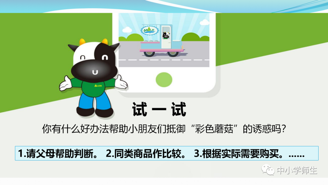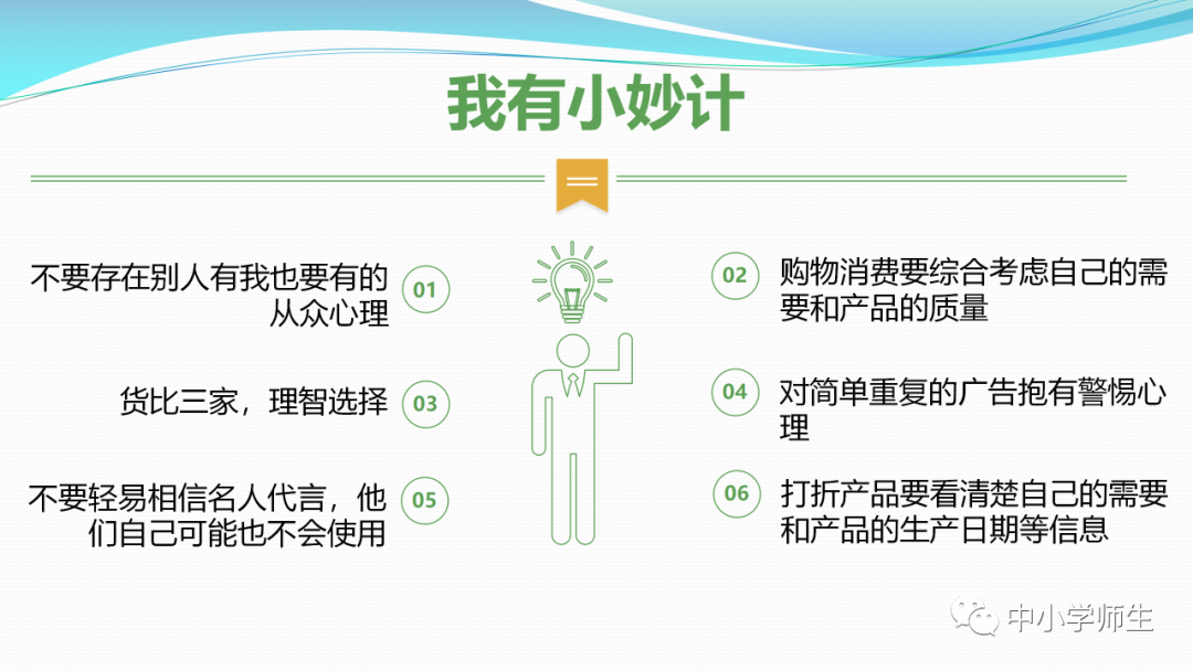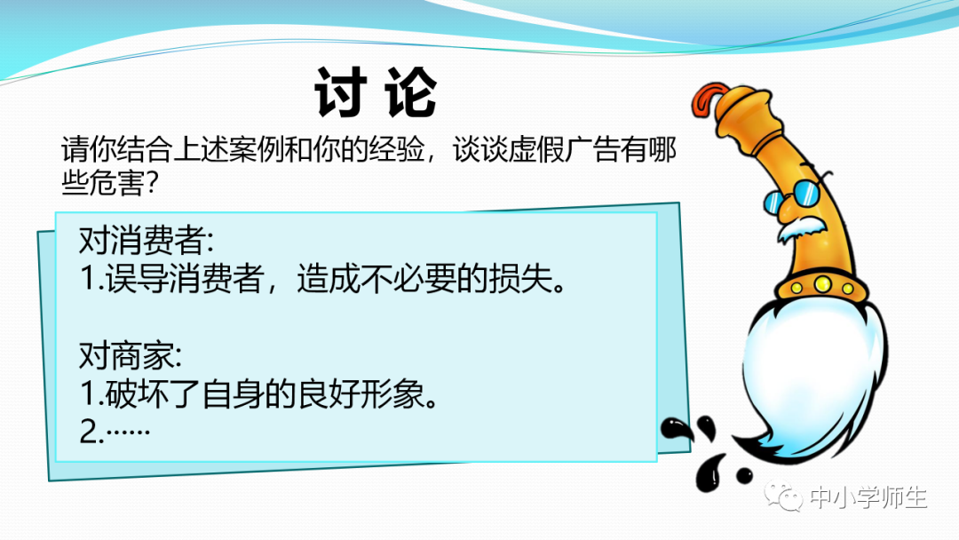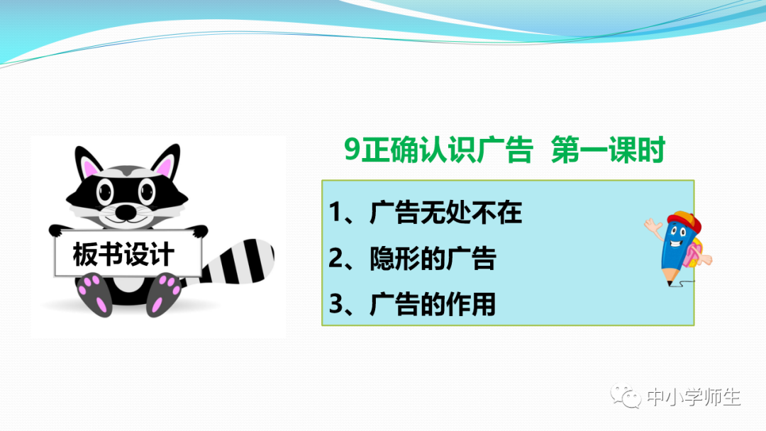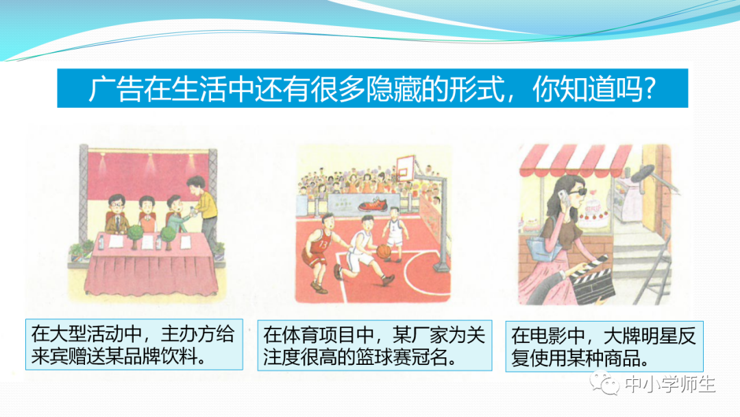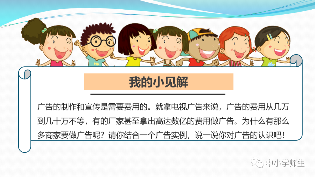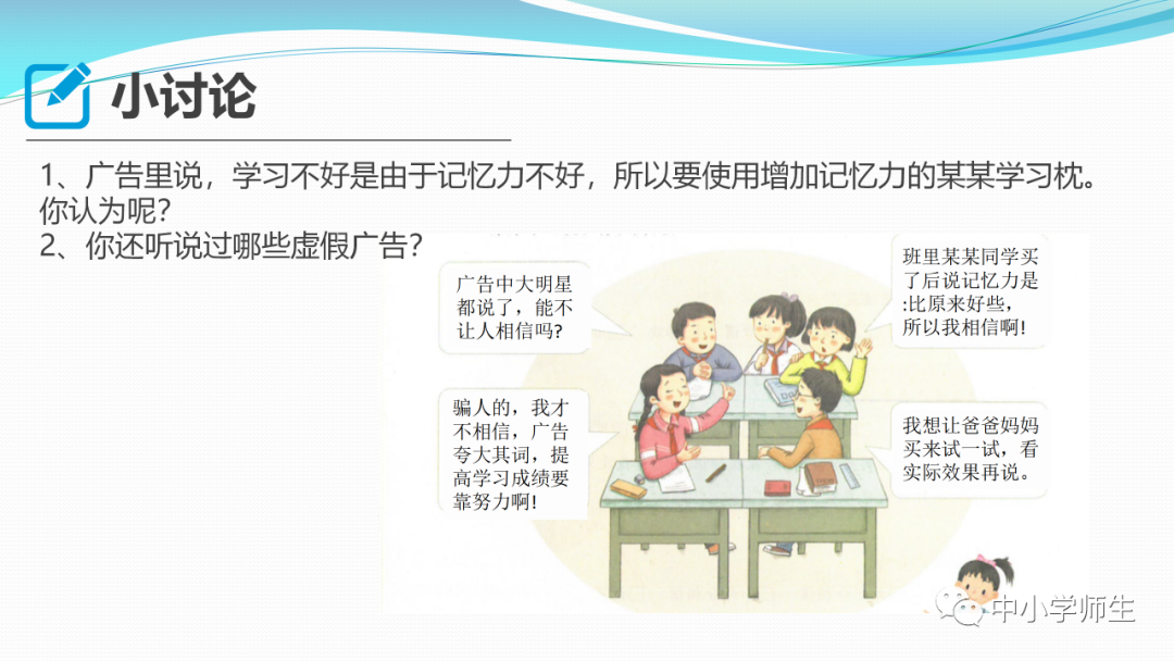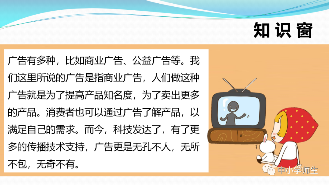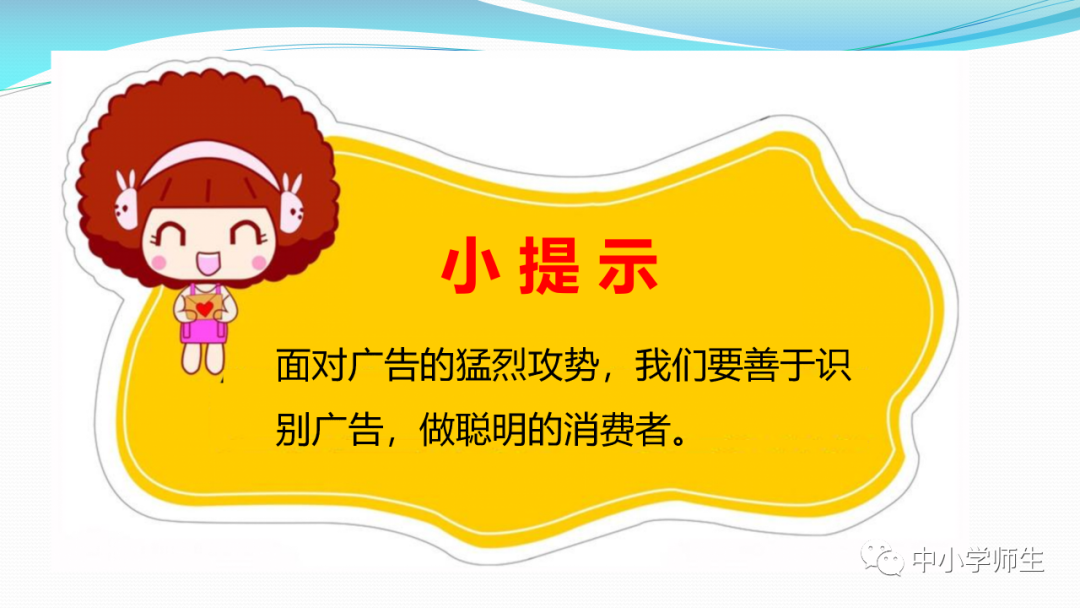 获取配套课件教案习题试卷请拉到文末微课讲解电子课本知识点1. 当电视走进千家万户时,电视广告也随之而来。2. 正确认识广告。广告无处不在,广告的内容不一定都可信。17.广告的内容不一定都可信,虚假广告就更不可信了,虚假广告要么是推销假冒、劣质商品,要么是直接骗取消费者的钱财,这往往会造成严重的后果。3. 学会识别广告。面对广告的猛烈攻势,我们要善于识别广告,做聪明的消费者。 问答题:1. 如何正确认识广告?广告无处不在;广告的内容不一定都可信;面对广告的猛烈攻势,我们要善于识别广告,做聪明的消费者。2. 虚假广告有哪些危害呢?(1)对消费者:误导消费者,造成不必要的财产损失;欺骗消费者,相应会对消费者造成人身和财产损失。(2)对商家:破坏了自身的良好形象;造成自身财产损失。3. 你能想出破解虚假广告的方法吗?需要了解虚假广告的秘密招数;根据需要购买消费,不盲目,不从众;不贪小便宜。图文讲解教学设计9《正确认识广告》教学设计教学目标知识与能力:1.提高学生认识广告的能力。2.知道广告的种类、呈现方式、特点及其功能,明白商家做广告的目的性。3.引导学生知道如何理性的识别商业广告的虚假,怎样才能不被商业广告牵着走。过程与方法:通过自身体验、情景体验、小调查、小讨论、案例分析、提建议、阅读感悟等活动教学,培养学生动手实践能力,使学生提高认识广告的能力。情感态度与价值观:提高学生信息素养。教学重难点1.重点:让学生知道对广告的内容不可全信;对广告应有基本的辨别和判断能力。2.难点:让学生具有对广告应有基本的辨别和判断能力。学情分析。四年级的学生处于从中年级向高年级的过渡期,他们经过前三年课程的学习,对广告信息接受较快、辨别是非的能力较弱,对人和事物的认识逐渐摆脱形象思维的特点,初步具备抽象思维的能力,再根据以上教材分析,为此,确定以下教学方法。教法和学法。1.教法:启发式、小组合作探究法2.学法:自主学习法及活动与探究3.教学准备:教师制作PPT课件及搜集资料,学生课前准备好参与活动的资料教学过程。第一课时(一)导入。1.师播放视频:广告视频师再出示一张纸质广告。提问:视频和一张纸是什么?大家还见过什么形式的广告?2.生自由回答。(广告)3.师:同学们回答得很好。这节课我们就来探究一下广告问题。(二)讲授新课目标导学一:无处不在的广告活动与探究一:看一看,说一说(1)生阅读教材第64页内容(2)小组合作,探究问题☆说在电视上我们还可以在哪里找到广告?☆你你认为广告多了有好处还是坏处?(3)先在小组内交流,各组推荐代表,全班交流与分享活动与探究二:认真看第65面的知识窗。(1)生阅读教材第65页内容(2)小组合作,探究问题☆广告在生活中有很多的隐藏形势,你知道哪些?☆广告无处不在,你能否做到一天不看到广告。(3)先在小组内交流,各组推荐代表,全班交流与分享(4)师小结活动与探究三:认一认,写一写(1)生阅读教材第66页内容(2)小组合作,探究问题☆你对广告持什么态度?☆为什么有那么多的厂家商要做广告呢?(3)先在小组内交流,各组推荐代表,全班交流与分享。(4)师小结第二课时(一)复习导入。(二)讲授新课。目标导学二:广告都可信吗?活动与探究一:调查(课前进行)(1)生阅读教材第67页内容(2)小组合作,探究问题☆你认为什么样的广告才会对你产生影响?☆你买的东西和广告上的东西我差别吗?(3)先在小组内交流,各组推荐代表,全班交流与分享。(4)生完成教材P67空格内容,师指导、补充。活动与探究二:小讨论(1)生阅读教材第68页内容(2)小组合作,探究问题:☆你认为广告是真的还是假的?☆你知道哪些是虚假广告吗?(3)先在小组内交流,各组推荐代表,全班交流与分享(4)师小结:广告里的内容不一定可信,那么虚假广告的内容就更不能可信了。虚假广告,要么是推销假冒劣质产品。要么是直接骗取消费者的财权,这样的后果更加严重。活动与探究三:认真看一看第69面的知识窗(1)生阅读教材第69页内容(2)小组合作,探究问题:☆你认为虚假广告会对人造成哪些危害?☆如果对你产生了不良影响,你会怎么办?(3)先在小组内交流,各组推荐代表,全班交流与分享(4)生完成教材P69空格内容,师指导、补充。目标导学三:学会识别广告。活动与探究一:看一看,想一想(1)生阅读教材第70页内容(2)小组合作,探究问题:☆你能识别这些虚假广告吗?☆你能抵制住虚假广告的诱惑吗?(3)先在小组内交流,各组推荐代表,全班交流与分享(4)师小结:面对广告,我们要学会识别,不能被广告牵着走。要摆脱广告的控制,需要了解广告的秘密招数。活动与探究二:仔细看一下第71面的知识窗。(1)生阅读教材第71页内容(2)小组合作,探究问题:☆你有什么好的办法帮助主人公?☆假如你是主人公,你会怎么办?(3)先在小组内交流,各组推荐代表,全班交流与分享(4)师小结:面对广告的猛烈攻势,我没有学会善与识别广告。做聪明的消费者。(三)师总结:认识了广告对人们生活产生的影响,我们要增强对广告信息基本的辨别和判断能力,学会理性地对待社会中的商业广告,不被广告牵着走。板书设计。9.正确认识广告无处不在的广告:种类,呈现方式,特点和功能正确认识广告:虚假广告的危害同步习题一、填空:1、广告有很多种,比如 、 等,随着科技发达,有了更 多的传播技术支持,广告更是 、 、