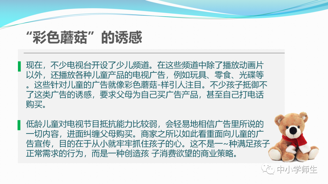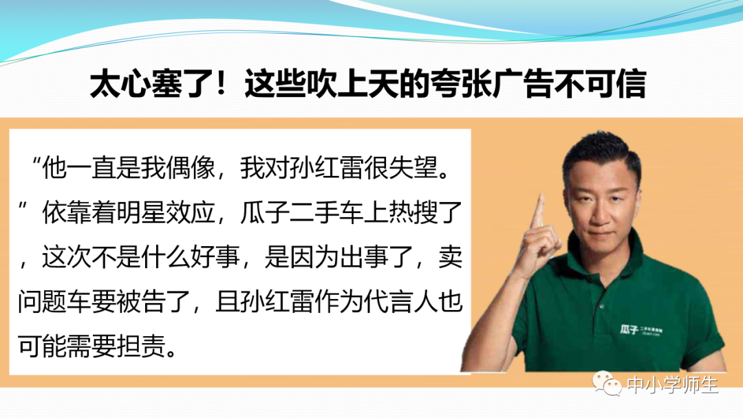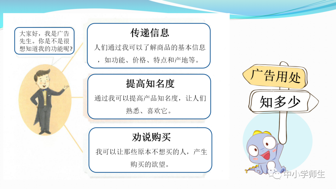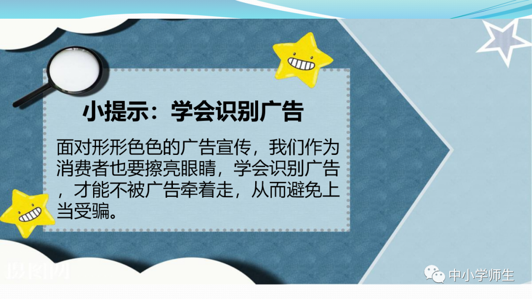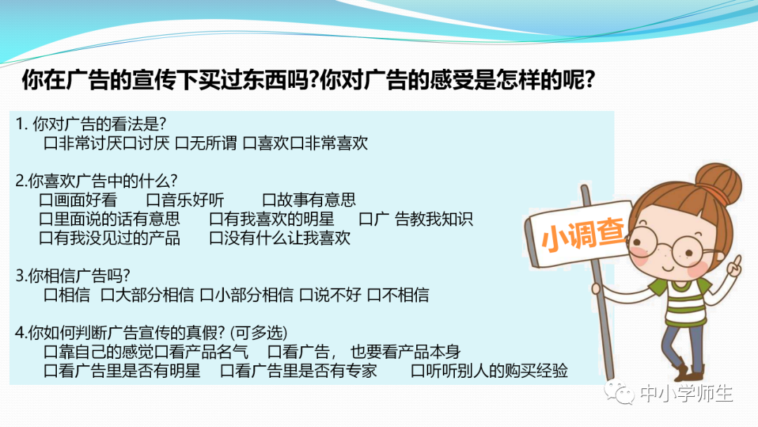 2.知道广告的种类、呈现方式、特点及其功能,明白商家做广告的目的性。3.引导学生知道如何理性的识别商业广告的虚假,怎样才能不被商业广告牵着走。过程与方法:通过自身体验、情景体验、小调查、小讨论、案例分析、提建议、阅读感悟等活动教学,培养学生动手实践能力,使学生提高认识广告的能力。1.重点:让学生知道对广告的内容不可全信;对广告应有基本的辨别和判断能力。2.难点:让学生具有对广告应有基本的辨别和判断能力。四年级的学生处于从中年级向高年级的过渡期,他们经过前三年课程的学习,对广告信息接受较快、辨别是非的能力较弱,对人和事物的认识逐渐摆脱形象思维的特点,初步具备抽象思维的能力,再根据以上教材分析,为此,确定以下教学方法。3.教学准备:教师制作PPT课件及搜集资料,学生课前准备好参与活动的资料师再出示一张纸质广告。提问:视频和一张纸是什么?大家还见过什么形式的广告?3.师:同学们回答得很好。这节课我们就来探究一下广告问题。(3)先在小组内交流,各组推荐代表,全班交流与分享(3)先在小组内交流,各组推荐代表,全班交流与分享(3)先在小组内交流,各组推荐代表,全班交流与分享。(3)先在小组内交流,各组推荐代表,全班交流与分享。(3)先在小组内交流,各组推荐代表,全班交流与分享(4)师小结:广告里的内容不一定可信,那么虚假广告的内容就更不能可信了。虚假广告,要么是推销假冒劣质产品。要么是直接骗取消费者的财权,这样的后果更加严重。(3)先在小组内交流,各组推荐代表,全班交流与分享(3)先在小组内交流,各组推荐代表,全班交流与分享(4)师小结:面对广告,我们要学会识别,不能被广告牵着走。要摆脱广告的控制,需要了解广告的秘密招数。(3)先在小组内交流,各组推荐代表,全班交流与分享(4)师小结:面对广告的猛烈攻势,我没有学会善与识别广告。做聪明的消费者。(三)师总结:认识了广告对人们生活产生的影响,我们要增强对广告信息基本的辨别和判断能力,学会理性地对待社会中的商业广告,不被广告牵着走。