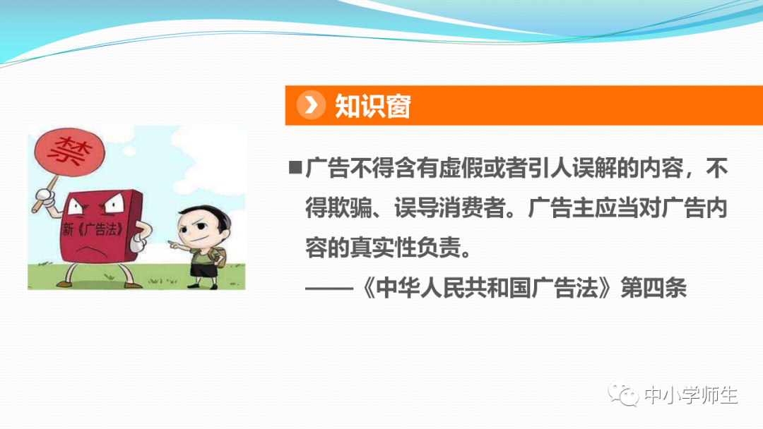 2. 正确认识广告。广告无处不在,广告的内容不一定都可信。17.广告的内容不一定都可信,虚假广告就更不可信了,虚假广告要么是推销假冒、劣质商品,要么是直接骗取消费者的钱财,这往往会造成严重的后果。3. 学会识别广告。面对广告的猛烈攻势,我们要善于识别广告,做聪明的消费者。广告无处不在;广告的内容不一定都可信;面对广告的猛烈攻势,我们要善于识别广告,做聪明的消费者。(1)对消费者:误导消费者,造成不必要的财产损失;欺骗消费者,相应会对消费者造成人身和财产损失。(2)对商家:破坏了自身的良好形象;造成自身财产损失。需要了解虚假广告的秘密招数;根据需要购买消费,不盲目,不从众;不贪小便宜。