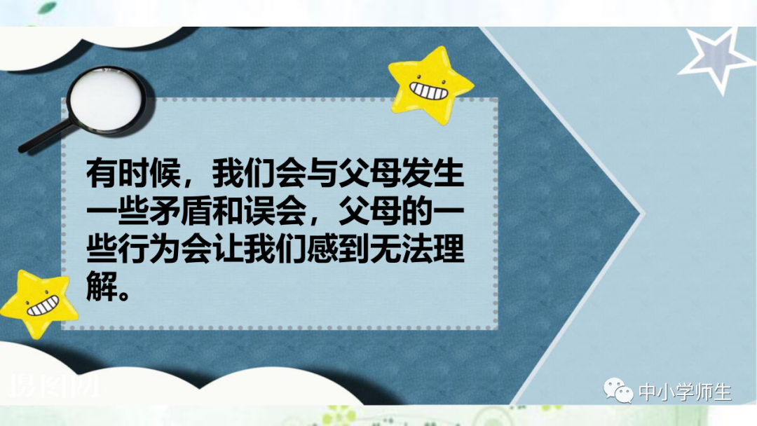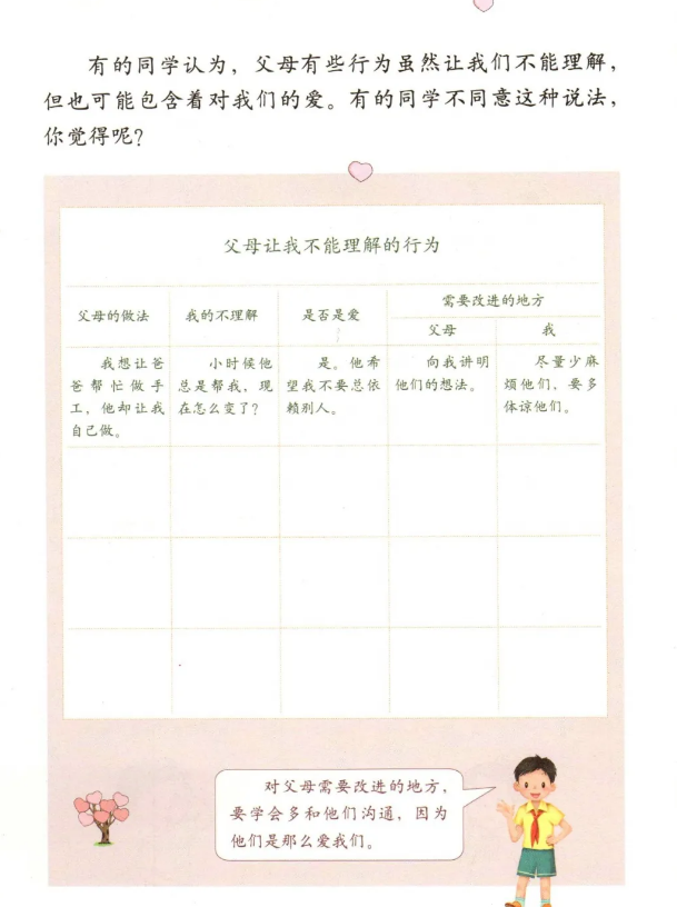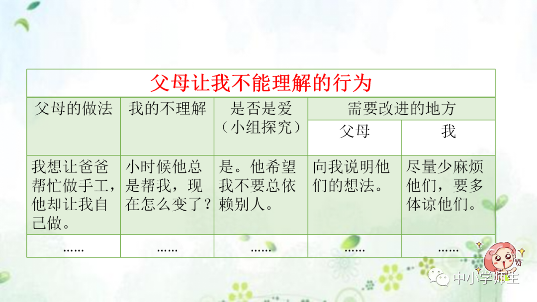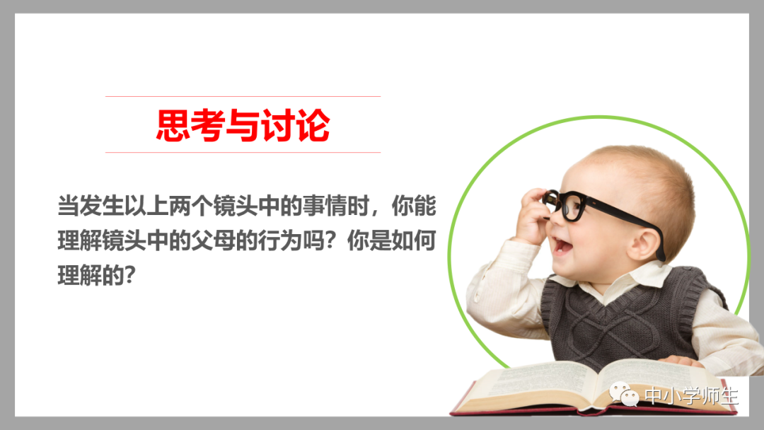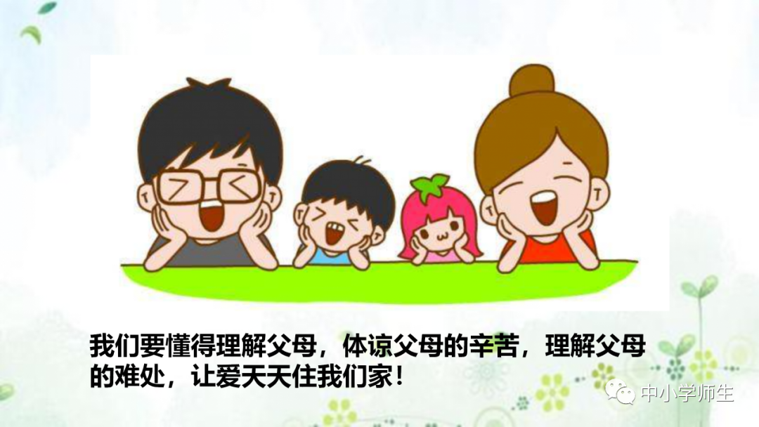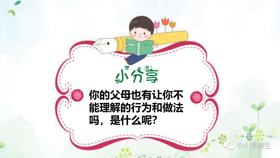 教师:父母是爱我们的,但她们也有一些行为和做法让我们不能理解。你的父母有让你不能理解的行为和做法吗?