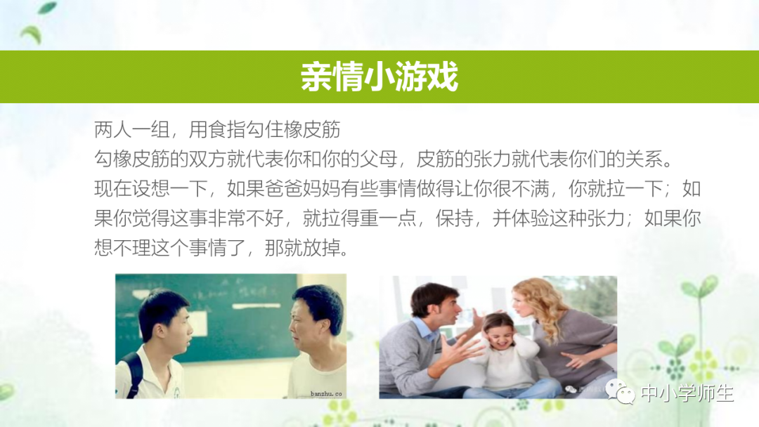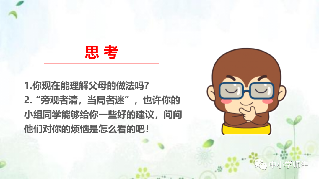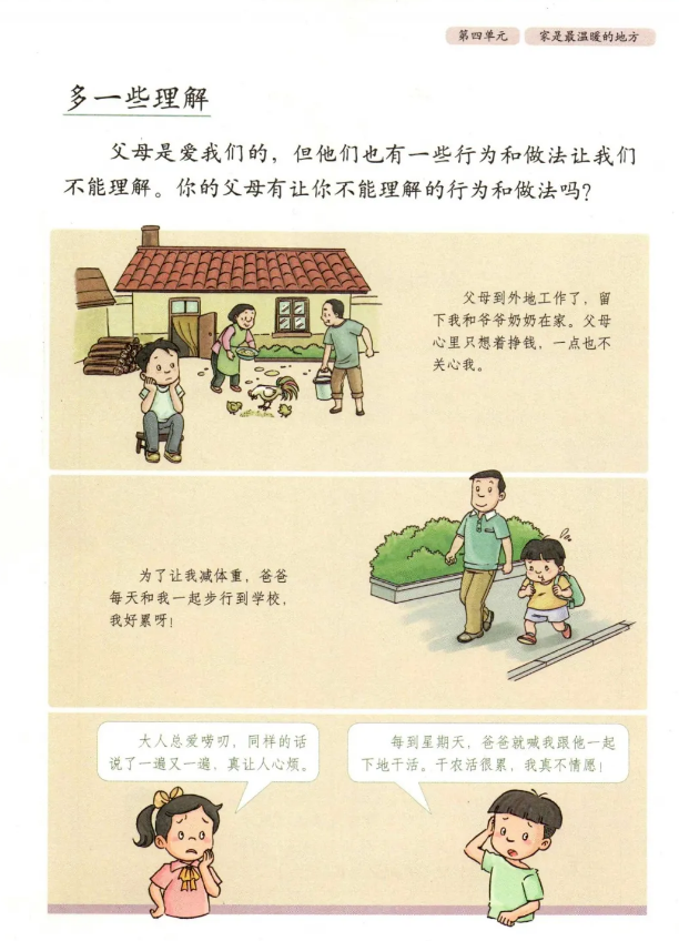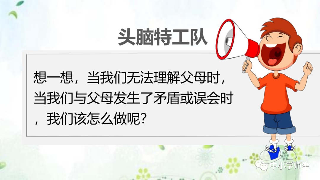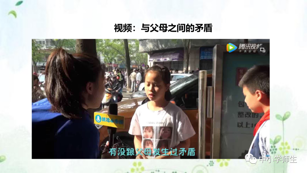 教师:父母是爱我们的,但她们也有一些行为和做法让我们不能理解。你的父母有让你不能理解的行为和做法吗?