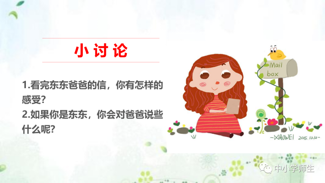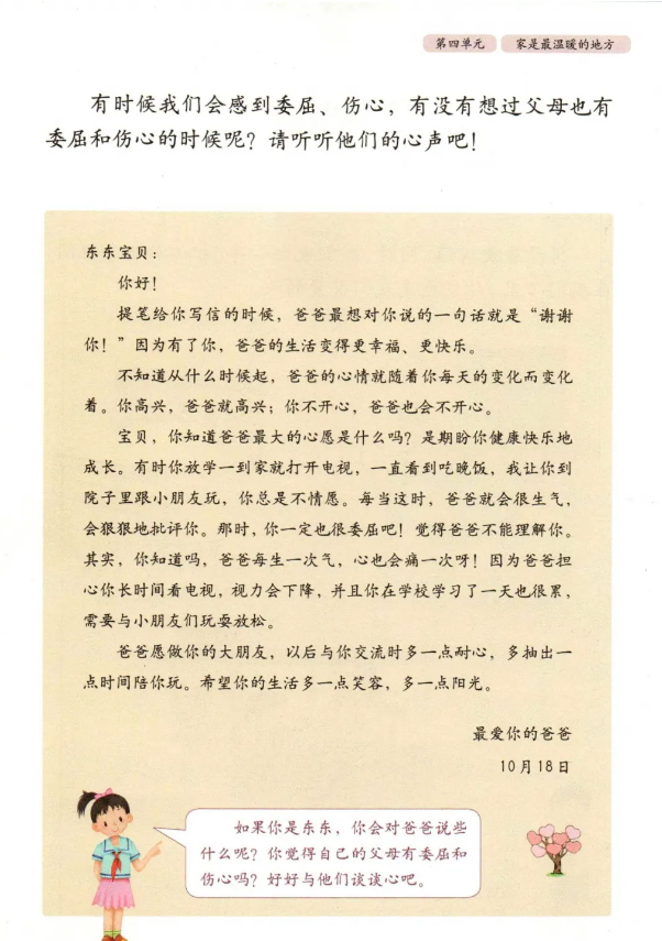 教师:打开教材P71页“爸爸给东东的信”。如果你是东东,你会对爸爸说些什么呢?你觉得自己的父母有委屈和伤心吗?好好与他们谈谈心吧。