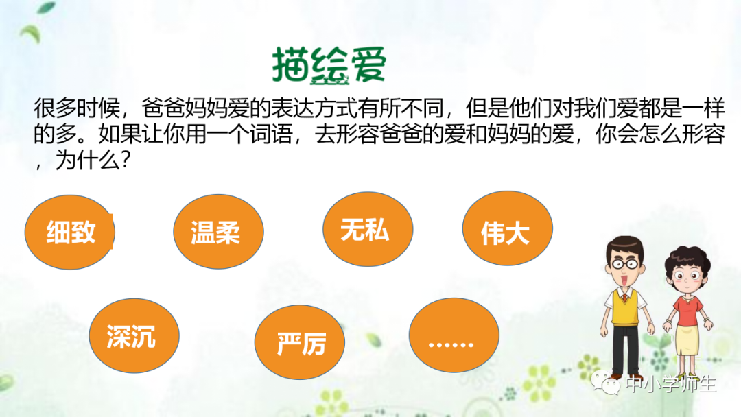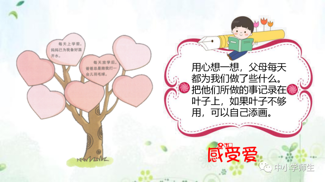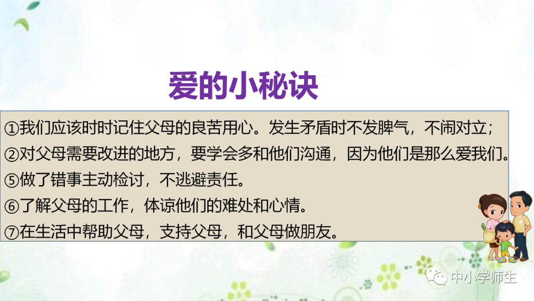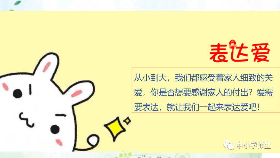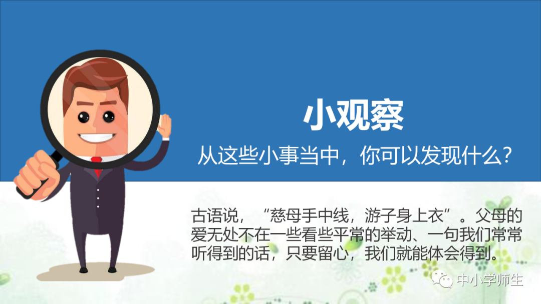 教师:父母为我们做的每一件看似普通的事,里面都藏着对我们的爱。你能发现这默默的爱吗?
