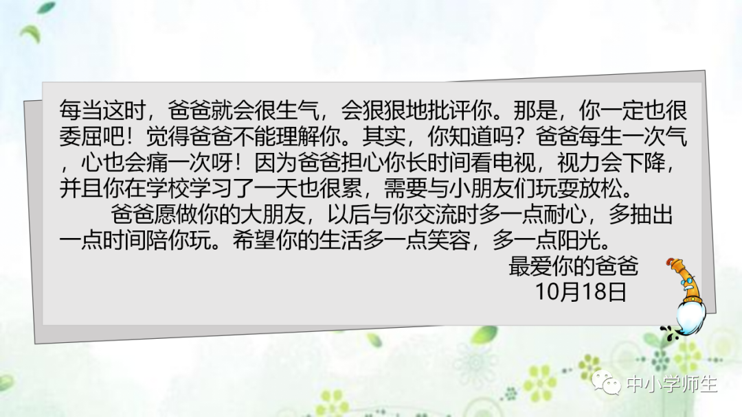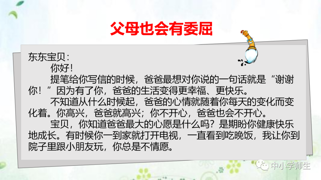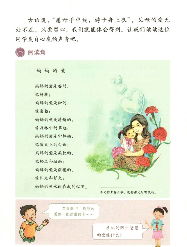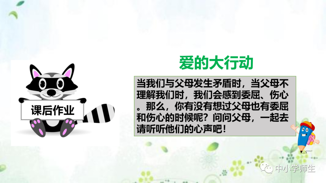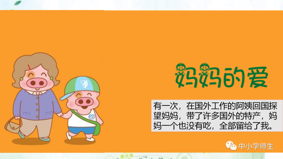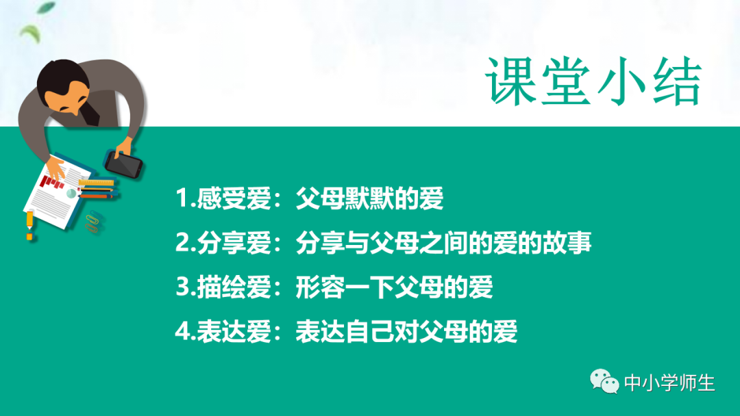 教师:父母为我们做的每一件看似普通的事,里面都藏着对我们的爱。你能发现这默默的爱吗?