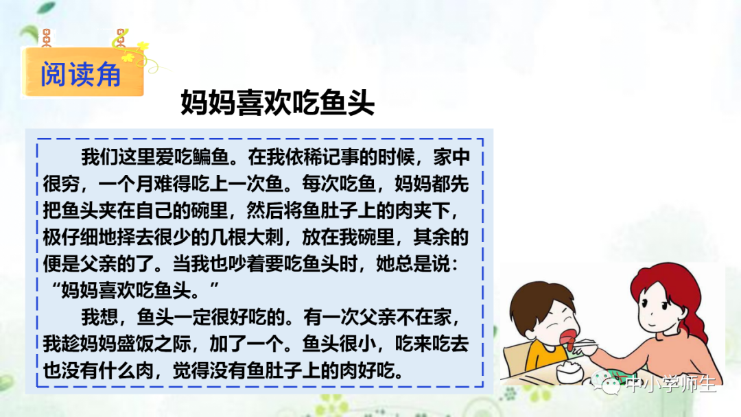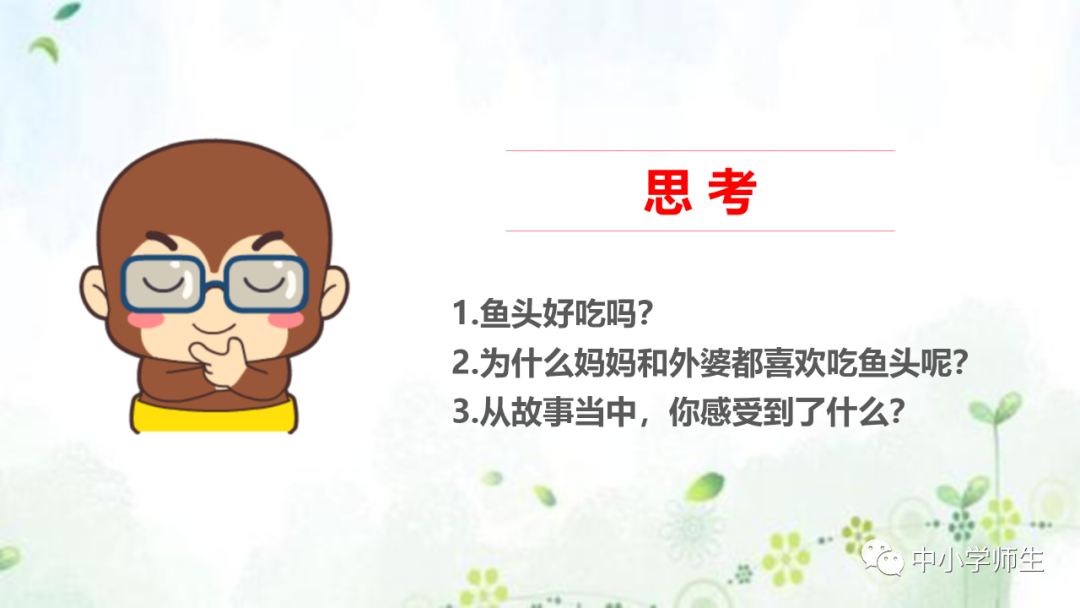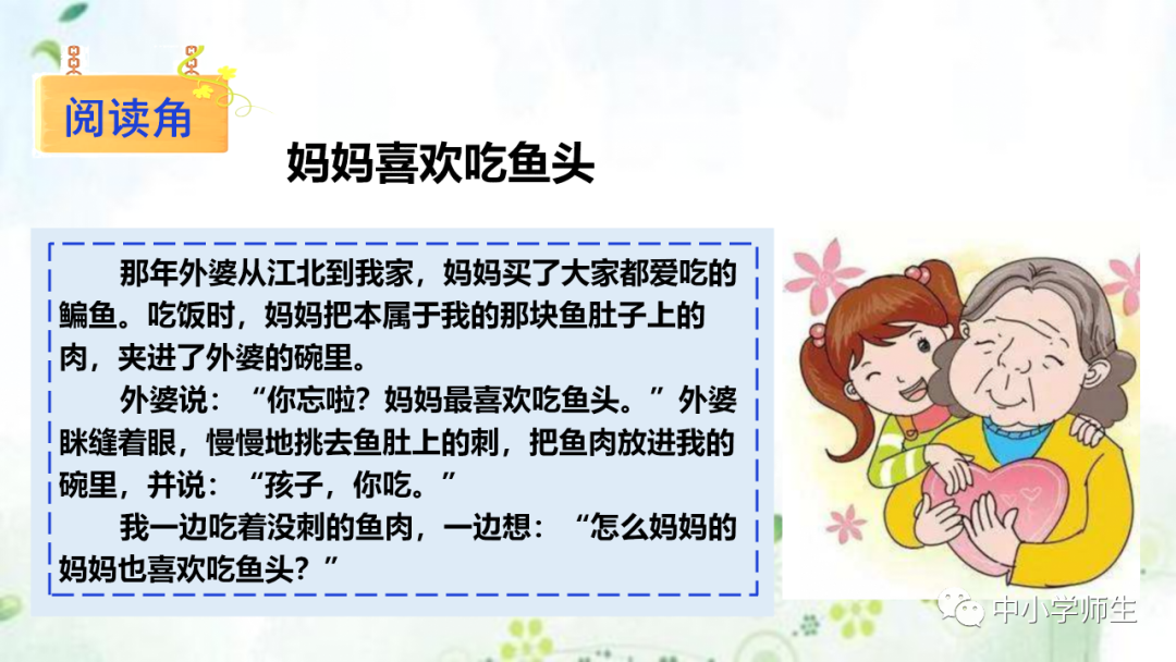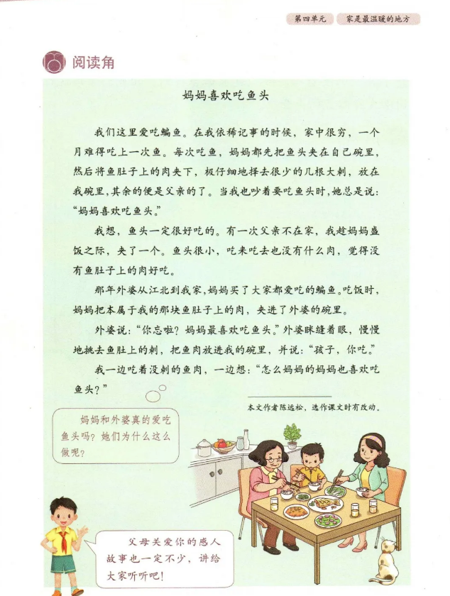 教师:打开教材P67页,阅读“妈妈喜欢吃鱼头”小故事。妈妈和外婆真的爱吃鱼头吗?她们为什么这么做呢?