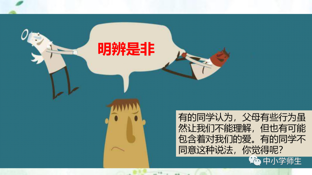教师:有的同学认为,父母有些行为虽然让我们不能理解,但也可能包含着对我们的爱。有的同学不同意这种说法你觉得呢?