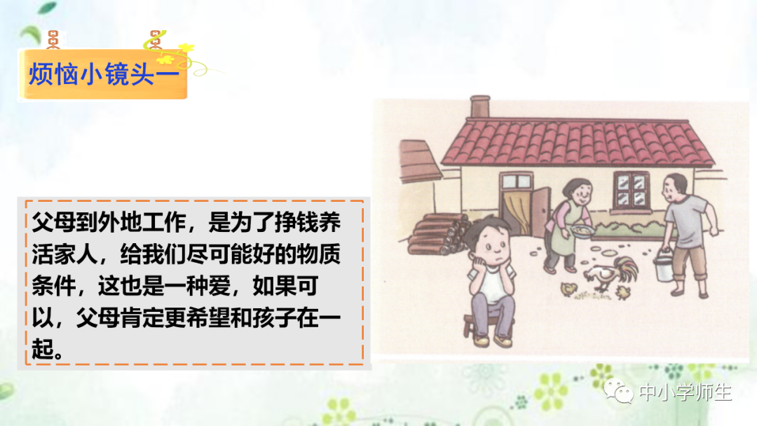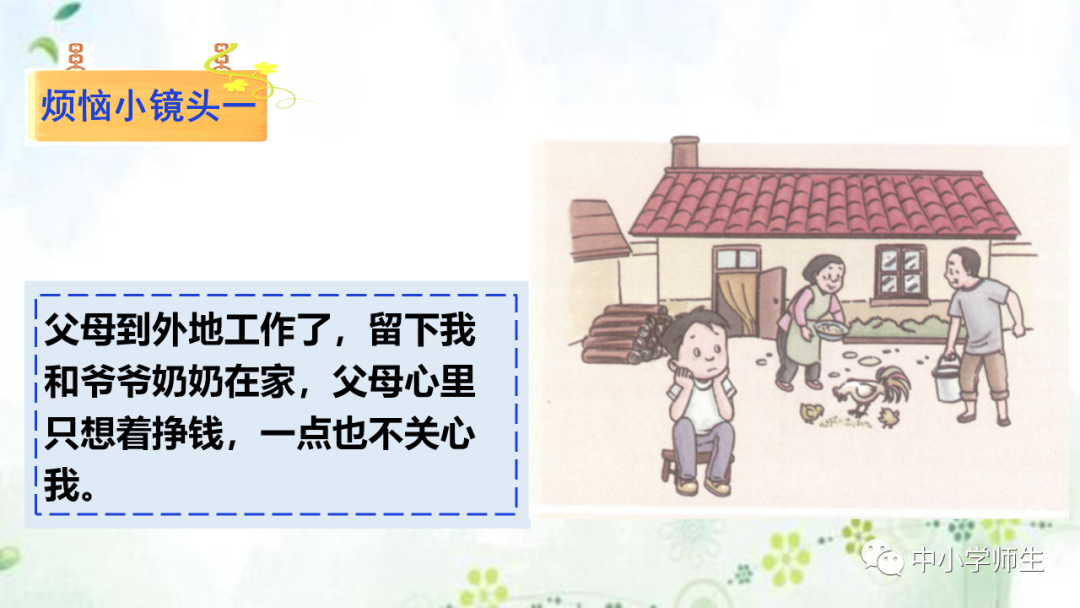 学生交流:父母到外地工作了,留下我和爷爷奶奶在家。他们心里只想着挣钱,一点也不关心我。