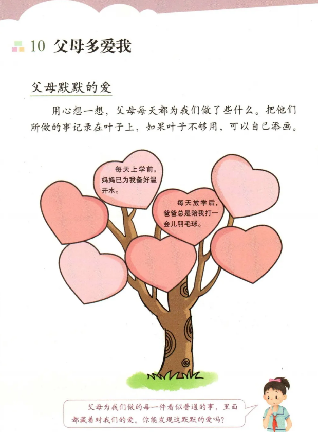 获取配套课件教案习题试卷请拉到文末微课讲解电子课本知识点1.爸爸妈妈为我们做了些什么?P66答:体会到:爸爸妈妈的爱藏在生活中的每一件看似普通的事里。父母的爱无处不在,只要留心,我们就能体会得到。(会例举具体的事例体会父母对我们的爱。)2.你的父母有让你不能理解的行为和做法吗?你该怎么做?P69、71(会根据具体的事例分析理解父母爱我们的多种方式。)这样做:⑴多与家长谈心,养成和家长交流的好习惯。⑵对父母需要改进的地方,要学会多和他们沟通。选择合适的时间,选择好需要沟通的问题,选择“座谈会”的形式,使家长容易接受交流沟通。(3)学会换位思考,体会父母的委屈和伤心。图文讲解教学设计10《父母多爱我》教学设计 教学目标:1、了解父母为自己的成长付出了许多的心血,感受父母对自己的疼爱,唤起学生对父母由衷的爱。2、通过自主思考与合作探讨,学生切身理解、感受父母对自己的疼爱及养育之恩,并以恰当的方式孝敬父母。 教学重、难点: 教学重点:感受父母对自己的疼爱,唤起学生对父母由衷的爱。 教学难点:学会正确理解和接受父母的爱,并能和自己的父母正确沟通。 课前准备: 教师:课件。 学生:预习。 教学过程: 一、新课导入 我们在父母的爱中长大,每位父母都爱自己的孩子,爱的方式却不尽相同,今天我们就谈谈父母的爱。 教师:播放视频歌曲“让爱住我家”,学生聆听感受。 二、新知讲授 活动一:父母默默的爱 教师:用心想一想,父母每天都为我们做了些什么? 学生交流:每天上学前,妈妈已为我备好温开水;每天放学后,爸爸总是陪我打一会羽毛球;妈妈每天晚上都会来给我盖被子…… 教师:父母为我们做的每一件看似普通的事,里面都藏着对我们的爱。你能发现这默默的爱吗? 学生交流:学生思考自由回答。 教师:打开教材P67页,阅读“妈妈喜欢吃鱼头”小故事。妈妈和外婆真的爱吃鱼头吗?她们为什么这么做呢? 学生交流:小组讨论。 教师:父母关爱你的感人的故事一定不少,讲给大家听听吧! 学生交流:互动交流。 教师:请同学带着感情读一读“妈妈的爱”。 妈妈的爱 妈妈的爱是香的,像鲜花; 妈妈的爱是甜的,像蜜糖; 妈妈的爱是清新的,像森林中的草地; 妈妈的爱是宁静的,像蓝天上的白云; 妈妈的爱是柔软的,像轻风和细雨; 妈妈的爱是温暖的,像阳光和炉火; 妈妈的爱永远在我的心里。 教师:在你眼中爸爸的爱像什么? 学生交流:自由发言。 活动二:多一些理解 教师:父母是爱我们的,但她们也有一些行为和做法让我们不能理解。你的父母有让你不能理解的行为和做法吗? 学生交流:父母到外地工作了,留下我和爷爷奶奶在家。他们心里只想着挣钱,一点也不关心我。 学生交流:为了让我减体重,爸爸每天和我一起步行到学校,我好累呀! 学生交流:大人总爱唠叨,同样的话说了一遍又一遍,真让人心烦。 学生交流:每到星期天,爸爸就喊我跟他一起下地干活。干衣活很累,我真不情愿! 学生交流:…… 教师:有的同学认为,父母有些行为虽然让我们不能理解,但也可能包含着对我们的爱。有的同学不同意这种说法你觉得呢? 学生交流:小组讨论。 教师:说说父母有哪些行为是你不能理解的?说一说具体的内容,你觉得应该如何改进呢? 学生交流:学生讨论自由发言。 教师:对父母需要改进的地方,要学会多和他们沟通,因为他们是那么爱我们。 教师:有时候我们会感到委屈、伤心,有没有想过父母也有委屈和伤心的时候呢?请听听他们的心声吧! 教师:打开教材P71页“爸爸给东东的信”。如果你是东东,你会对爸爸说些什么呢?你觉得自己的父母有委屈和伤心吗?好好与他们谈谈心吧。同步习题一、填空题1、古语说,“慈母手中线,游子身上衣”这句诗的作者是( ),这首诗的意思是( )2、对父母需要改进的地方,我们要学会多和他们( ) 。二、判断题(请在题目后的括号中画“√”或画“×”)1 、当我们感到委屈、伤心时 , 要学会换位思考和父母沟通。( )2 、父母的爱无处不在 , 只要留心 , 就能体会到。( )3、在我眼里,爸爸的爱像一把遮雨的伞。()4、父母不爱我到外地去打工,把我一人放到姨姨家。( )5、妈妈特别“喜欢吃鱼头”,我特别喜欢吃鱼肚上的肉。( )三、选择(请你将正确答案的序号写到题后的括号里,每小题可能不止一个答案是正确的)1、有一天放学后,我因为贪玩回家晚了,我该怎么跟爸爸说呢?( )A、就说在学校办黑板报 B、就说在同学家写作业 C、实话实说2、下列哪些行为能体现父母是爱我们的( )A、父母到外地打工 B、为了让我减体重,爸爸每天和我一起步行到学校C、天冷了,妈妈总爱唠叨让我加衣服3、你注意倾听过妈妈的脚步声吗?一天中妈妈的脚步声是会变化的( )A、全家人还在睡梦中,妈妈的脚步轻轻的,她在准备早餐B、上班路上,妈妈的脚步匆匆的,有很多工作等着她C、下班路上,妈妈的脚步重重的,好累呀4、大人有爱,小孩也有爱。不信,瞧:( )A、奶奶病了,我的关心让奶奶忘掉了病痛,精神好多了B、我能自己整理房间,不用爸爸妈妈帮忙了C、出门给妈妈写张留言条,不让妈妈为我担心四、说一说1、父母的哪些行为让你不理解?列举一例,并说说如何与他们沟通进行改进?2、生活中,爸爸妈妈有委屈和伤心的事吗?你是怎么做的?3、爸爸妈妈说我是他们甜蜜的负担。无论工作多忙多累,他们都非常关心我的成长。你能举例说
