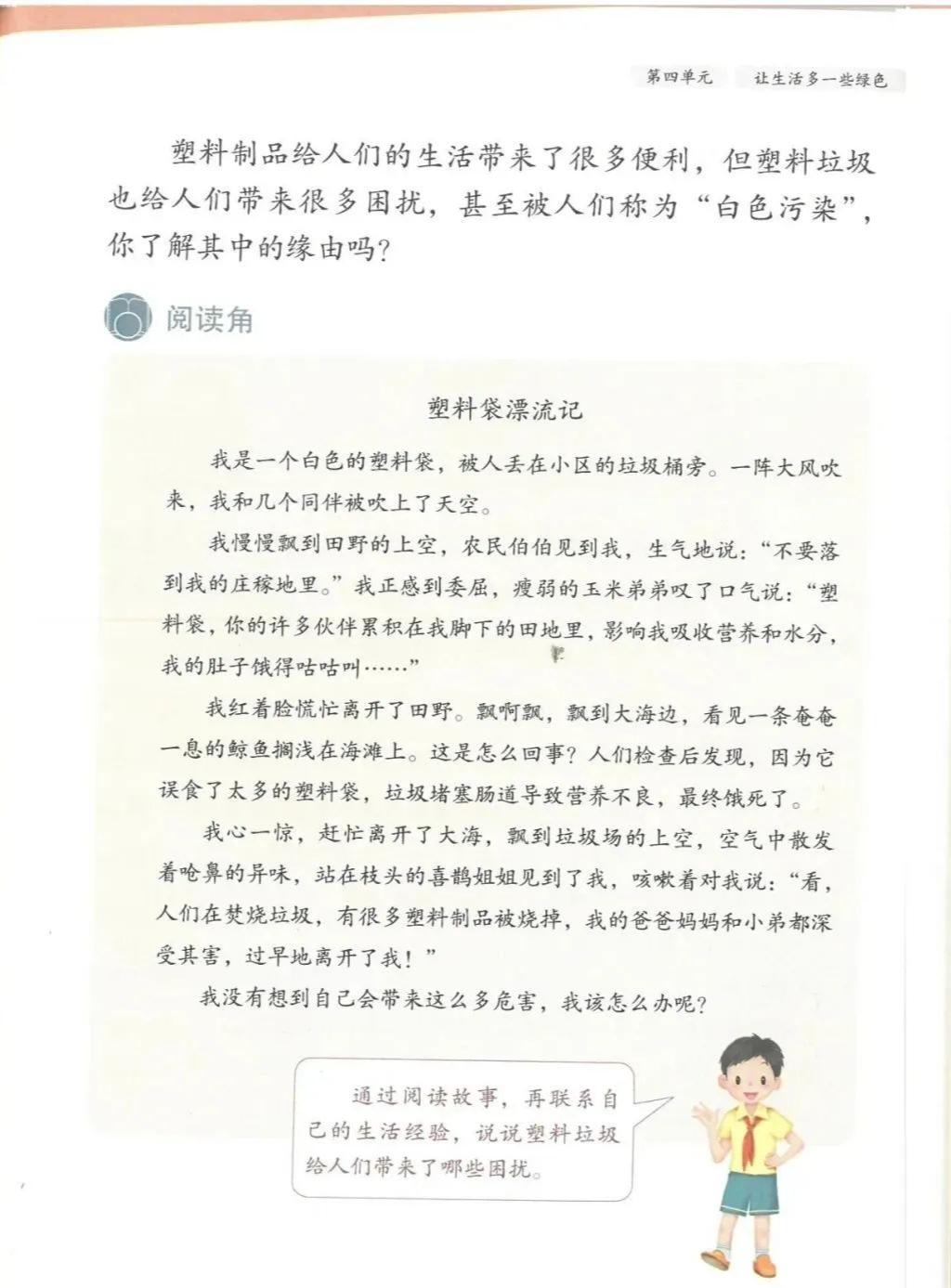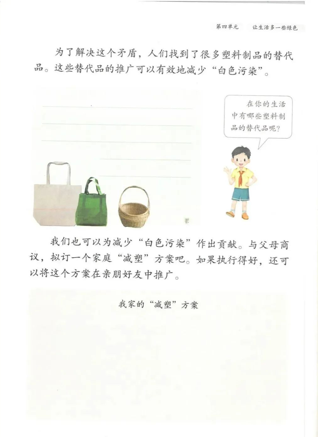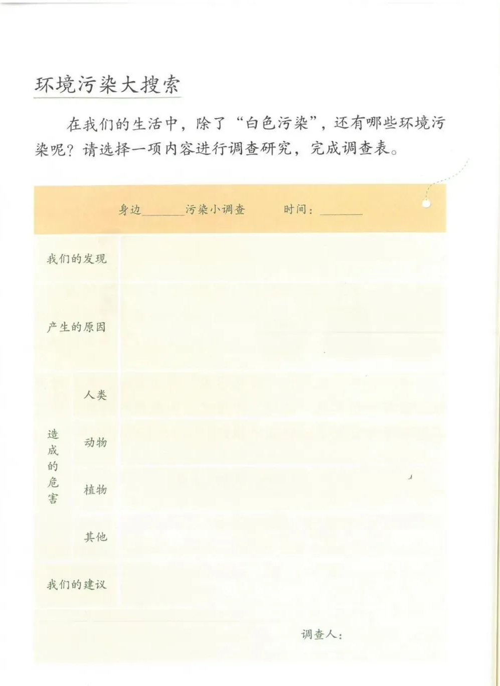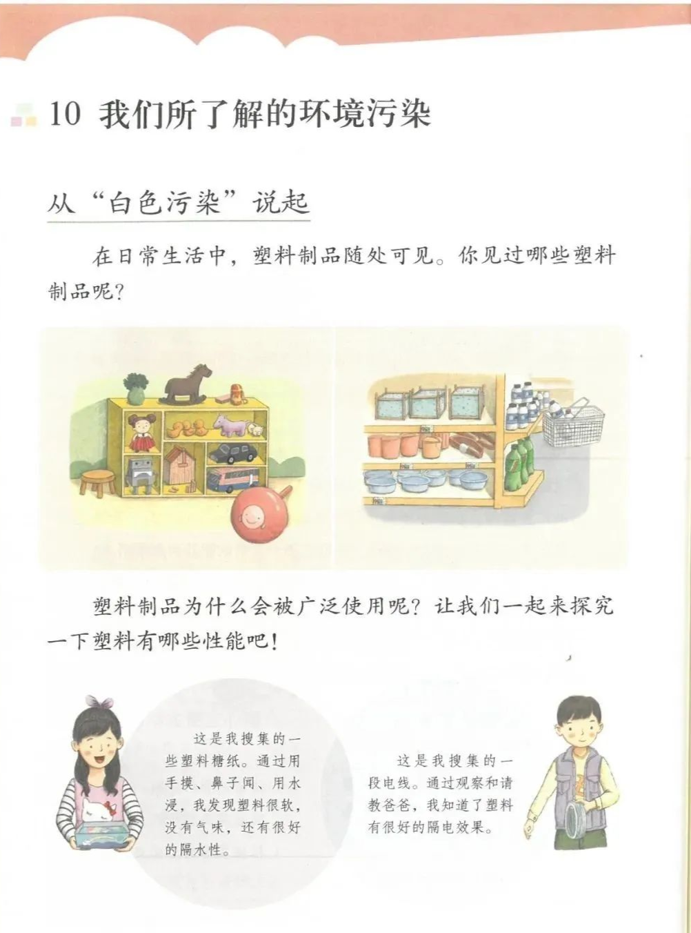 获取配套课件教案习题试卷请拉到文末微课讲解电子课本知识点一、知识点。1. 在日常生活中,塑料制品随处可见。塑料制品给我们的生活带来了很多便利,但塑料垃圾也给我们带来了很多困扰,甚至被人们称为白色污染。2. 我们的生活离不开塑料,可塑料垃圾又给环境带来那么大,那么长久的危害,我们必须合理的有节制的使用塑料制品,只有这样才能减少塑料垃圾的产生。3. 为了解决这个矛盾,人们找到了很多塑料制品的替代品,这些替代品的推广可以有效的减少白色污染。4. 在我们的生活中除了白色污染,还有空气污染、水质污染等环境污染。5. 绿水青山就是金山银山。二、简答题。1. 塑料垃圾(白色污染)危害有哪些?严重影响我们的身体健康;危害环境;使土壤环境恶化,严重影响农作物的生长;若把废塑料直接进行焚烧处理,将给环境造成严重的二次污染。2. 怎样解决塑料垃圾(白色污染)?我们必须合理的有节制的使用塑料制品,找到塑料制品的替代品,只有这样才能减少塑料垃圾的产生。3. 我家的“减塑”方案。应尽量减少一次性塑料餐具和纸制餐具的使用;应拒绝使用塑料袋买菜或盛装食物,买菜可用菜篮子或布袋避免使用上的一次性,减少对环境的污染;加强环保宣传,提高全家的环保意识。4. 在我们的生活中除了白色污染,还有哪些环境污染呢?环境污染主要包括:空气污染,水质污染,固体废物污染,噪声污染,其他污染,主要是电磁辐射污染、光污染。图文讲解教学设计10《我们所了解的环境污染》教学设计教学目标知识与能力:1.引导学生从日常生活经验出发,探究认识体会塑料的广泛用途,知道塑料废弃品对环境的污染及其危害。2.能了解其他环境污染情况,如农药污染,水污染,大气污染,噪音污染等,树立环保意识。过程与方法:通过自身体验、阅读感悟、情境体验、制订减塑方案、环境污染大搜索、调查研究、讨论等活动教学,培养学生动手实践能力,培养学生环保意识。情感态度与价值观:培养学生环保意识。教学重难点1.重点:了解塑料制品对环境污染的危害,了解其他农药污染,水污染等树立环保意识。2.难点:树立环保意识。学情分析。四年级的学生处于从中年级向高年级的过渡期,他们经过前三年课程的学习,对环境污染感受较少、对其危害性认识不够,没有环保意识,对人和事物的认识逐渐摆脱形象思维的特点,初步具备抽象思维的能力,再根据以上教材分析,为此,确定以下教学方法。教法和学法。1.教法:启发式、小组合作探究2.学法:自主学习法及活动与探究3.教学准备:教师制作PPT课件及搜集资料,学生课前准备好参与活动的资料教学过程。第一课时(一)导入。1.师出示视频及图片:白色污染。生看后回答问题:上述视频反映了什么问题?2.生自由回答。(塑料垃圾及其危害)3.师:同学们回答得很好。今天我们就来探索白色污染的问题。板书课题。(二)讲授新课目标导学一:从白色污染说起活动与探究一:看一看(1)生阅读教材第72页内容(2)小组合作,探究问题☆你知道什么是白色污染吗?☆你见过哪些塑料产品?(3)先在小组内交流,各组推荐代表,全班交流与分享(4)师小结活动与探究二:认真看一下第73面的阅读角(1)生阅读教材第73页内容(2)小组合作,探究问题☆你知道为什么会被称为白色污染吗?☆根据上述大王如果是你,你会怎么办?(3)先在小组内交流,各组推荐代表,全班交流与分享(4)师小结活动与探究三:研究一下第74面的相关链接(1)生阅读教材第74页内容(2)小组合作,探究问题☆但是污染这么严重,我们可以完全不使用白色污染吗?☆如果不使用这些白色污染,我们的生活会变成怎样?(3)先在小组内交流,各组推荐代表,全班交流与分享(4)生完成教材P74空格内容,师指导、补充活动与探究四:想一想(1)生阅读教材第75页内容(2)小组合作,探究问题☆在你的周围有哪些是可以替代塑料产品呢?☆你有什么好的方案?(3)先在小组内交流,各组推荐代表,全班交流与分享(4)生完成教材P75空格内容,师指导、补充第二课时(一)复习导入。(二)讲授新课。目标导学二:环境污染大搜查活动与探究一:查一查(1)生阅读教材第76页内容(2)小组合作,探究问题☆你认为白色污染会对环境造成怎样的危害?☆如果你发现了白色污染,你会怎样处理?(3)先在小组内交流,各组推荐代表,全班交流与分享。(4)生完成教材P76空格内容,师指导、补充活动与探究二:看一看(1)生阅读教材第77页内容(2)小组合作,探究问题☆你认为造成这些因素的原因是什么?☆如果你遇到这种情况,你会怎么办?(3)先在小组内交流,各组推荐代表,全班交流与分享(4)师小结活动与探究三:好好看一下第78面的阅读角。(1)生阅读教材第78页内容(2)小组合作,探究问题☆你认为怎样做才能减少农药污染?☆读了上述材料,你有何体会?(3)先在小组内交流,各组推荐代表,全班交流与分享(4)师小结活动与探究四:看一看第79面的阅读窗和活动园。(1)生阅读教材第79页内容(2)小组合作,探究问题☆通过此次调查你有什么收获?☆请你谈谈对绿水青山就是金山银山这句话的理解。(3)先在小组内交流,各组推荐代表,全班交流与分享(4)师小结(三)师总结:认识体会了环境污染的现状及其危害,在日常生活中我们要有环保意识。板书设计。10.我们所了解的环境污染白色污染:现状及危害其它污染:现状及危害同步习题一、判断题:1.塑料制品给我们的生活